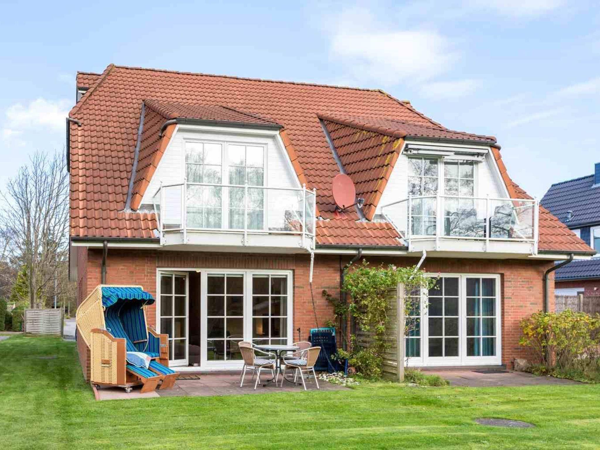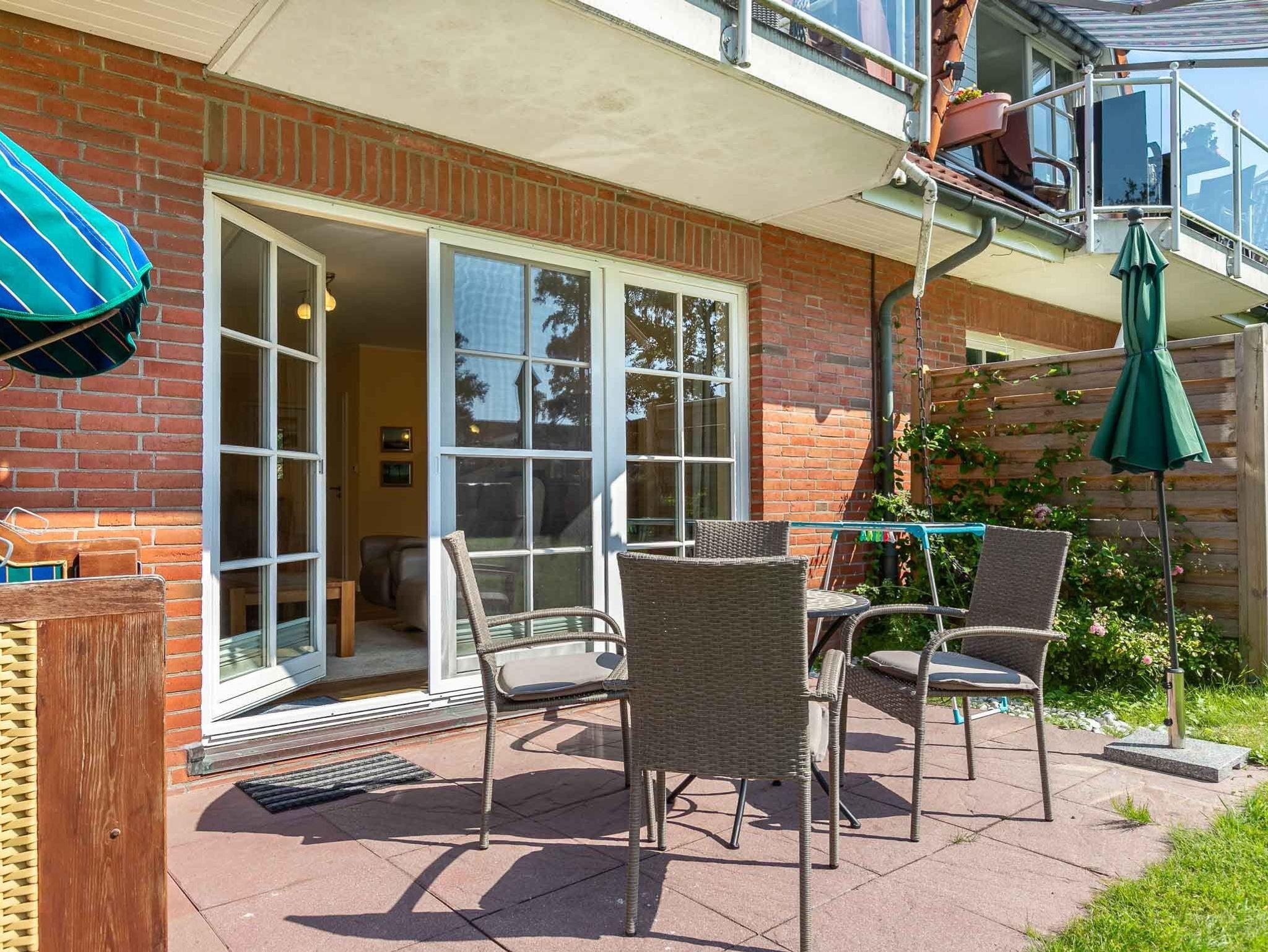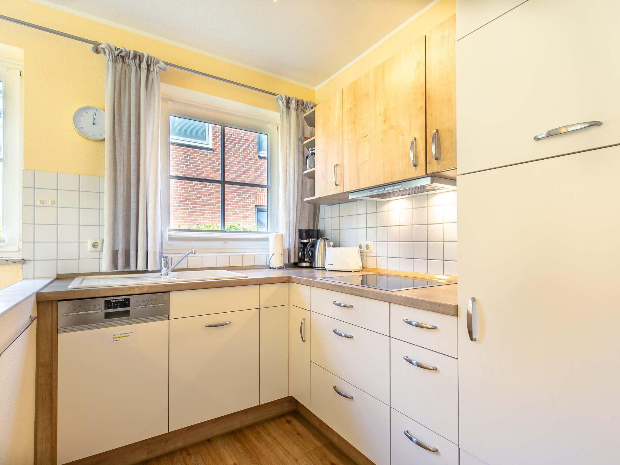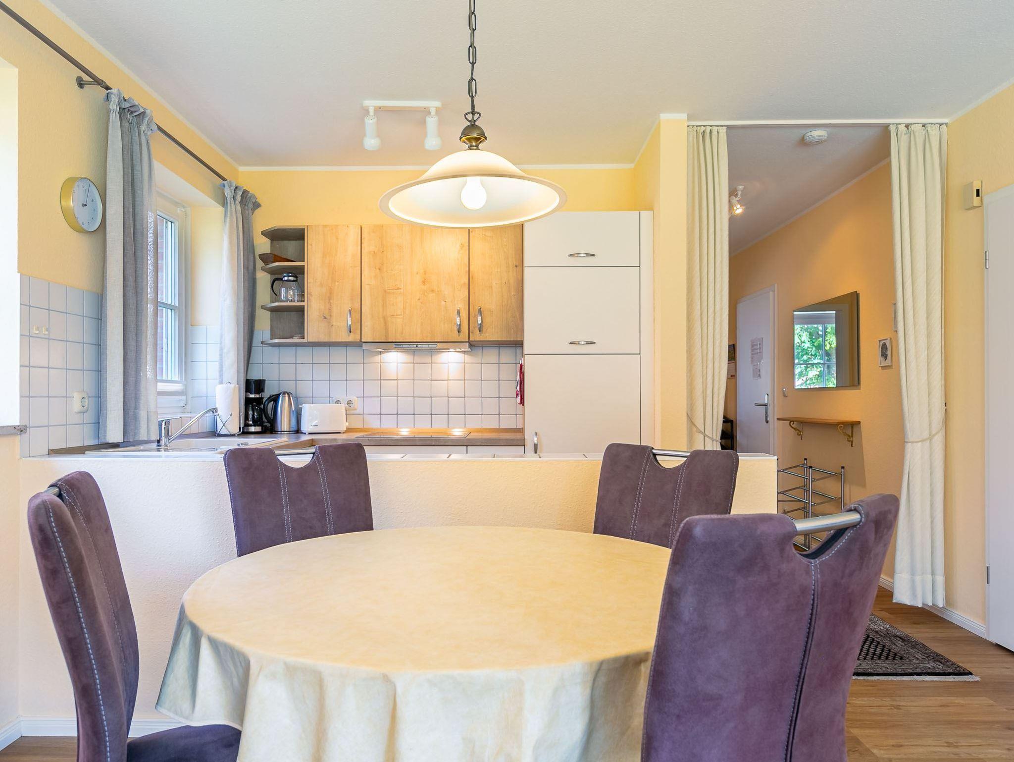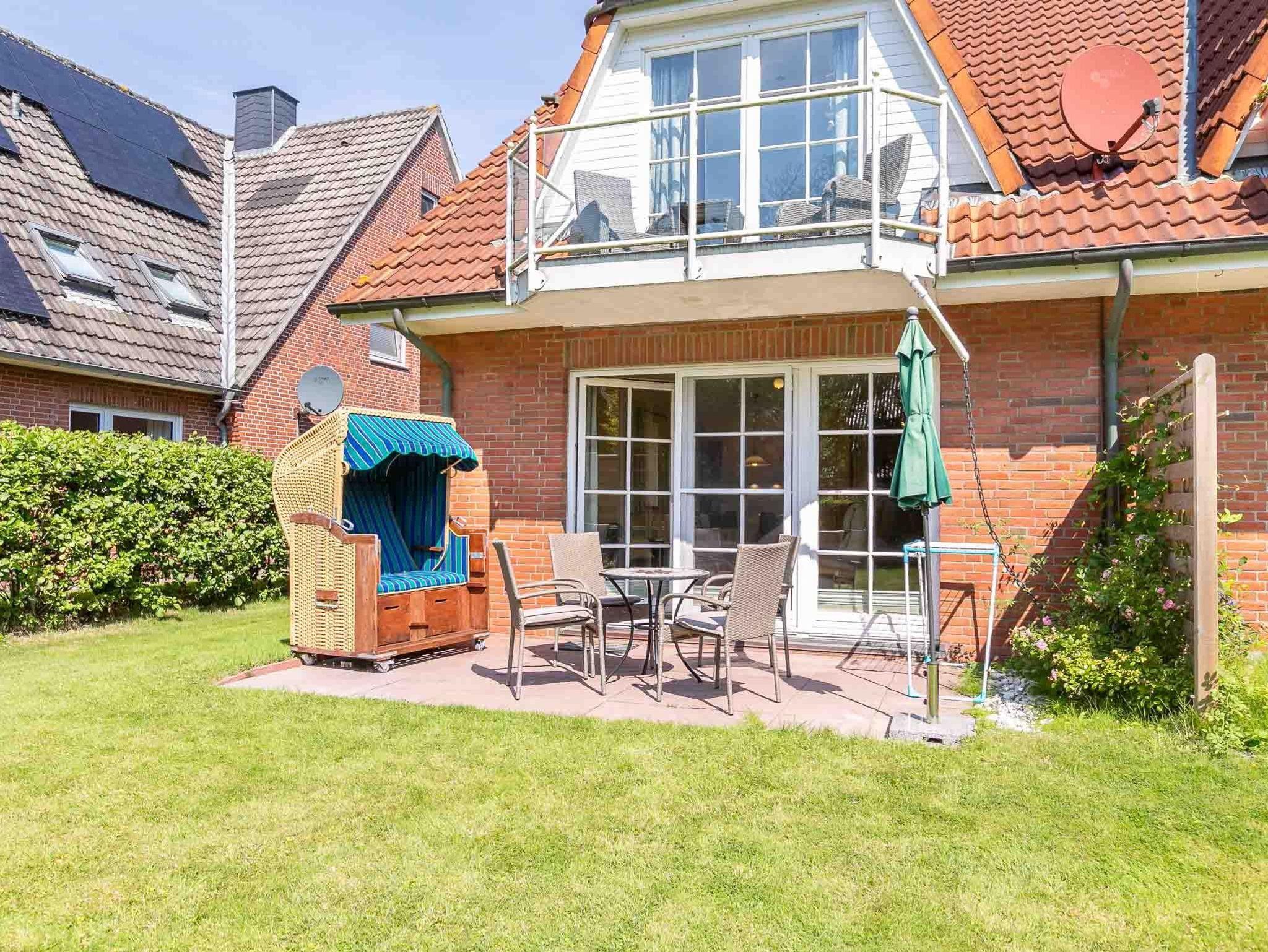 Wohnzimmer mit ausziehbarem Schlafsofa (160x190cm), 2 Sesseln, Hocker, TV (Sat), Radio und Esstisch mit 3 Stühlen. Direkter Zugang zur möblierten Garterrasse nach Süden mit Strandkorb. Offene Küche mit Mikrowellen-Kombigerät mit Backfunktion, Kühlschrank mit Gefrierfach und Geschirrspüler.