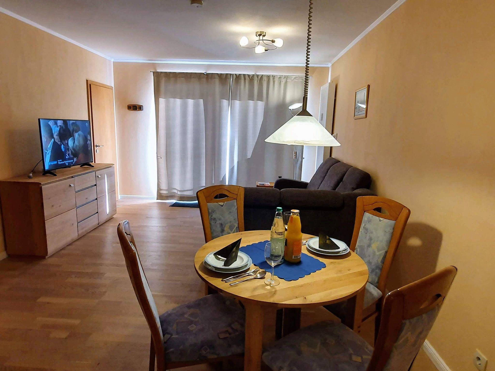• Sehr schönes Wohnzimmer mit gemütlicher Sitzecke, Flachbildschirm-TV, Esstisch und einer kleinen Einbauküche mit Mikrowelle, Kühlschrank mit Eisfach, Balkon