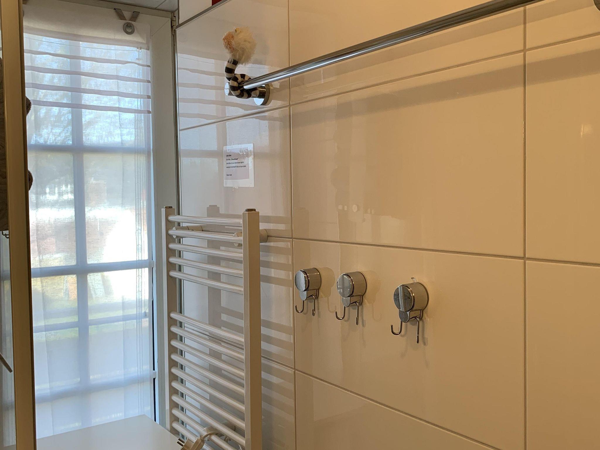 Badezimmer mit ebenerdiger Dusche, Fenster, Komfort-Hand-Überkopfbrause, WC, Infrarotheizung, Fußbodenheizung, Dusch-Handtücher, Handtuchheizkörper.