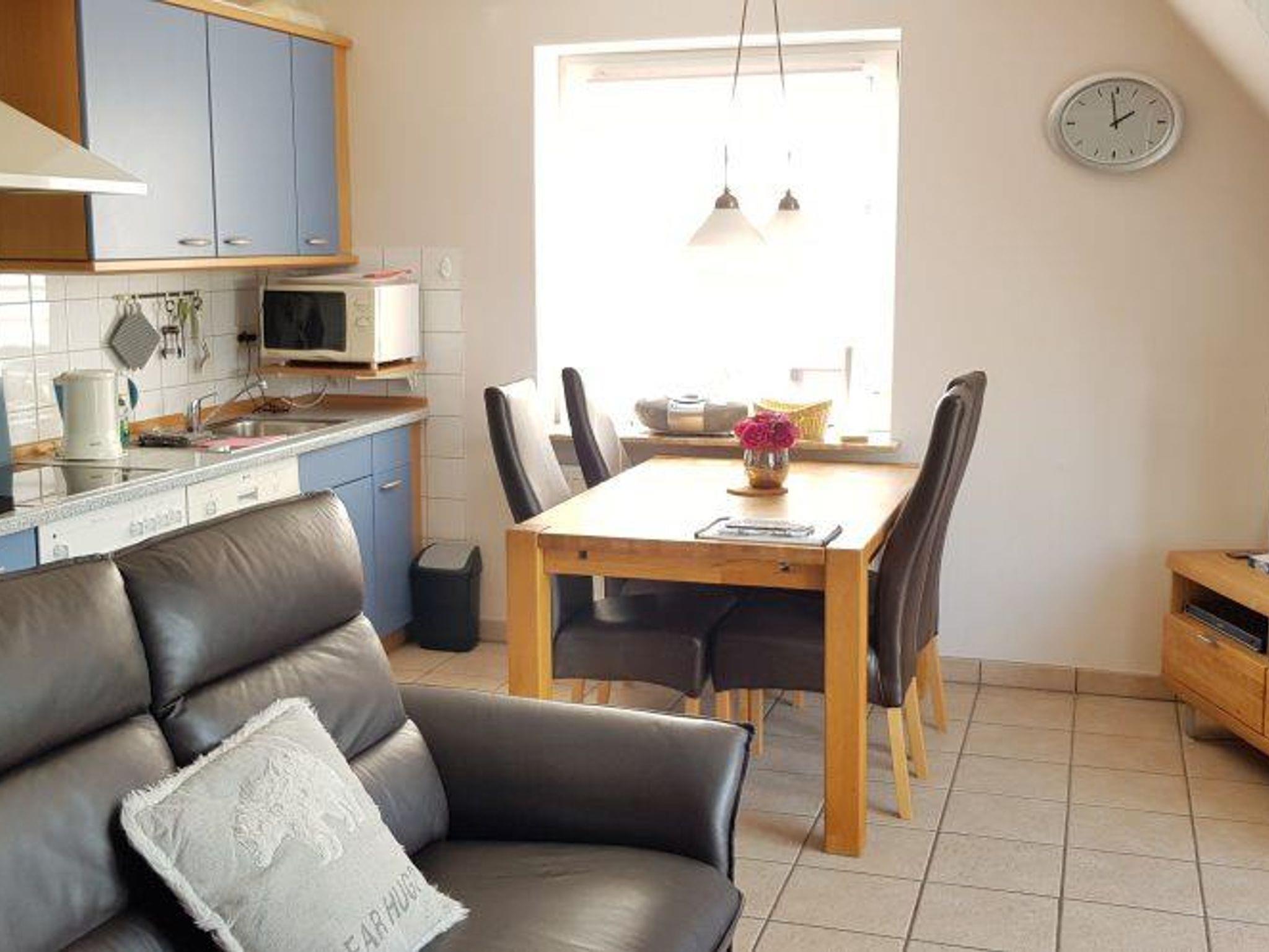 Wohn-Essraum mit zwei Sofas, SAT-TV, offene Küche mit Ceranfeld ,Backofen, Mikrowelle, Kaffeefiltermaschine (Kapselmaschine gehört nicht zur Ausstattung), Kühlschrank mit Gefrierfach, Geschirrspülmaschine, Essbereich.