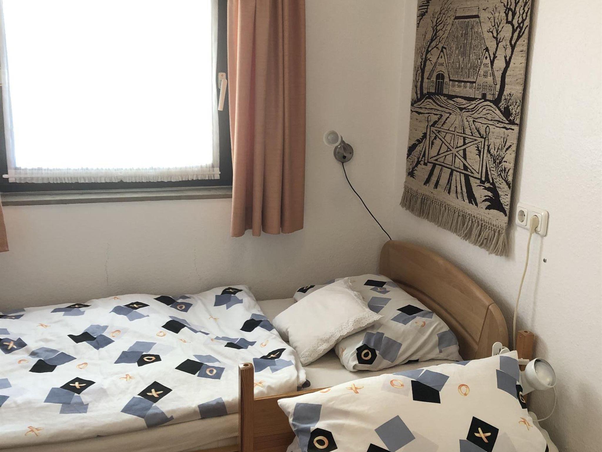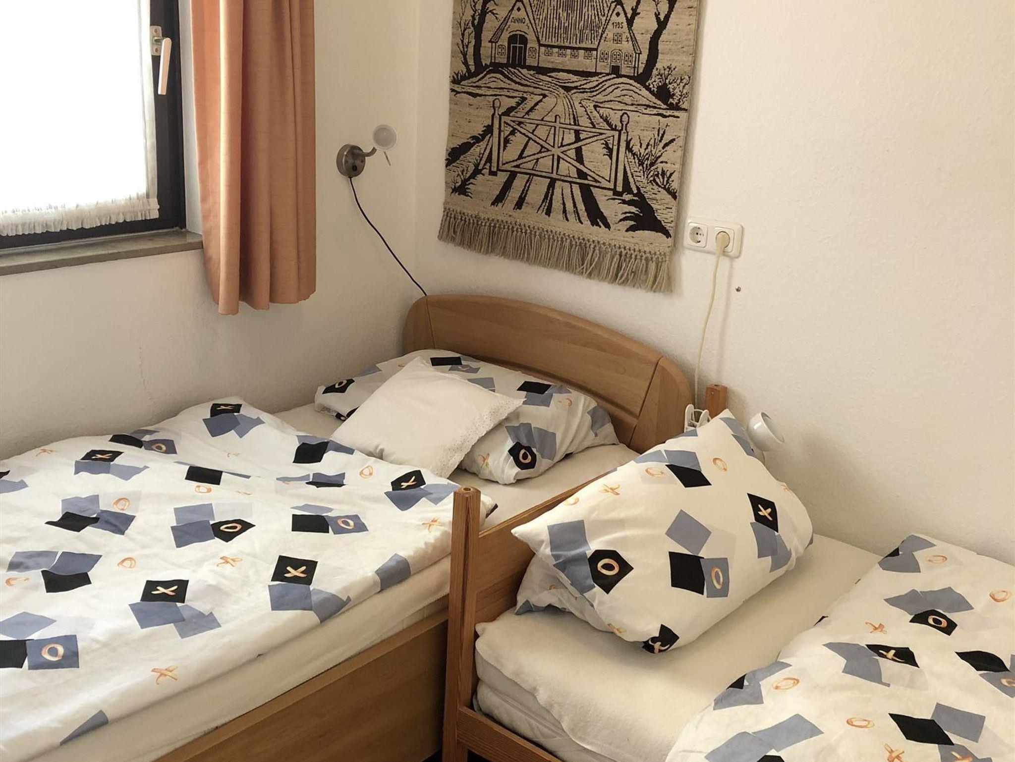 Zum Schlafen befindet sich im Wohnzimmer ein Schrankbett mit 2 Klappbetten und im separaten Schlafzimmer stehen 2 Einzelbetten (0,90x1,90 und 0,90x2,00 m) zur Verfügung.