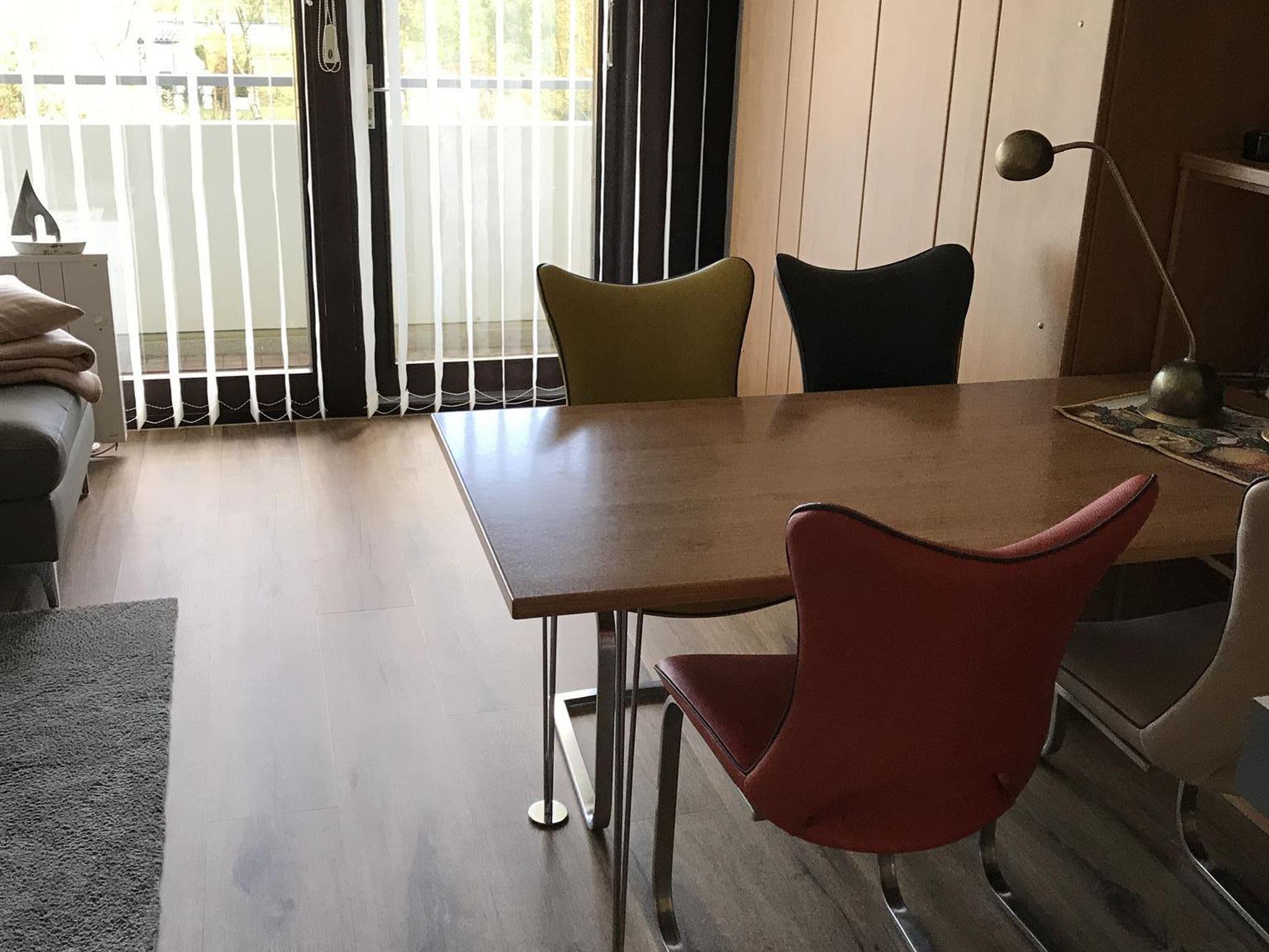 Das Wohnzimmer ist ausgestattet mit einer großen bequemen Sitzlandschaft, Esstisch, Flachbild-TV mit SAT-Empfang, Wlan und Radio. Neue Elektroheizkörper sorgen für wohlige Wärme. Vom möbilierten Südost-Balkon hat man einen herrlichen Blick in die Grünanlage.
