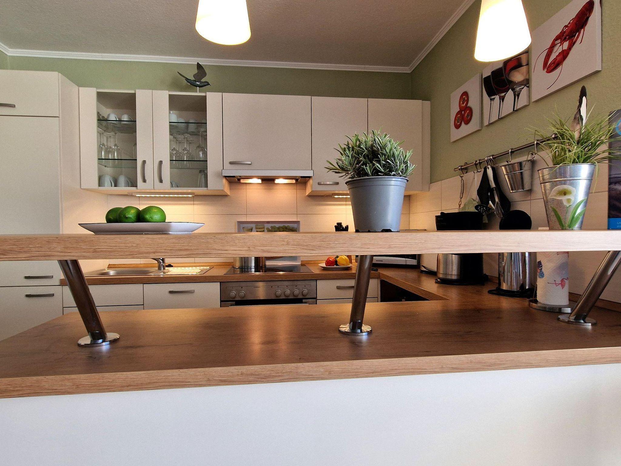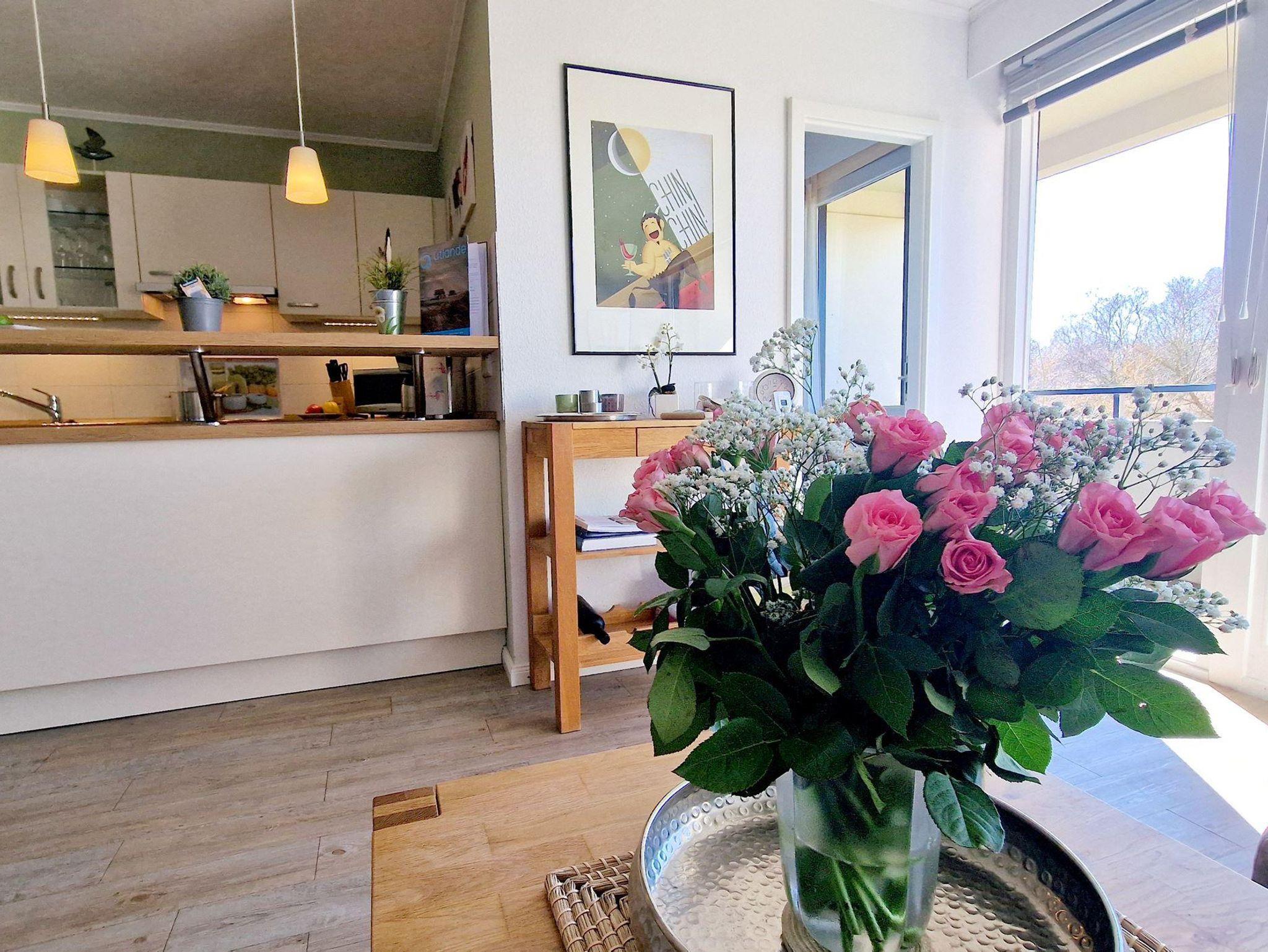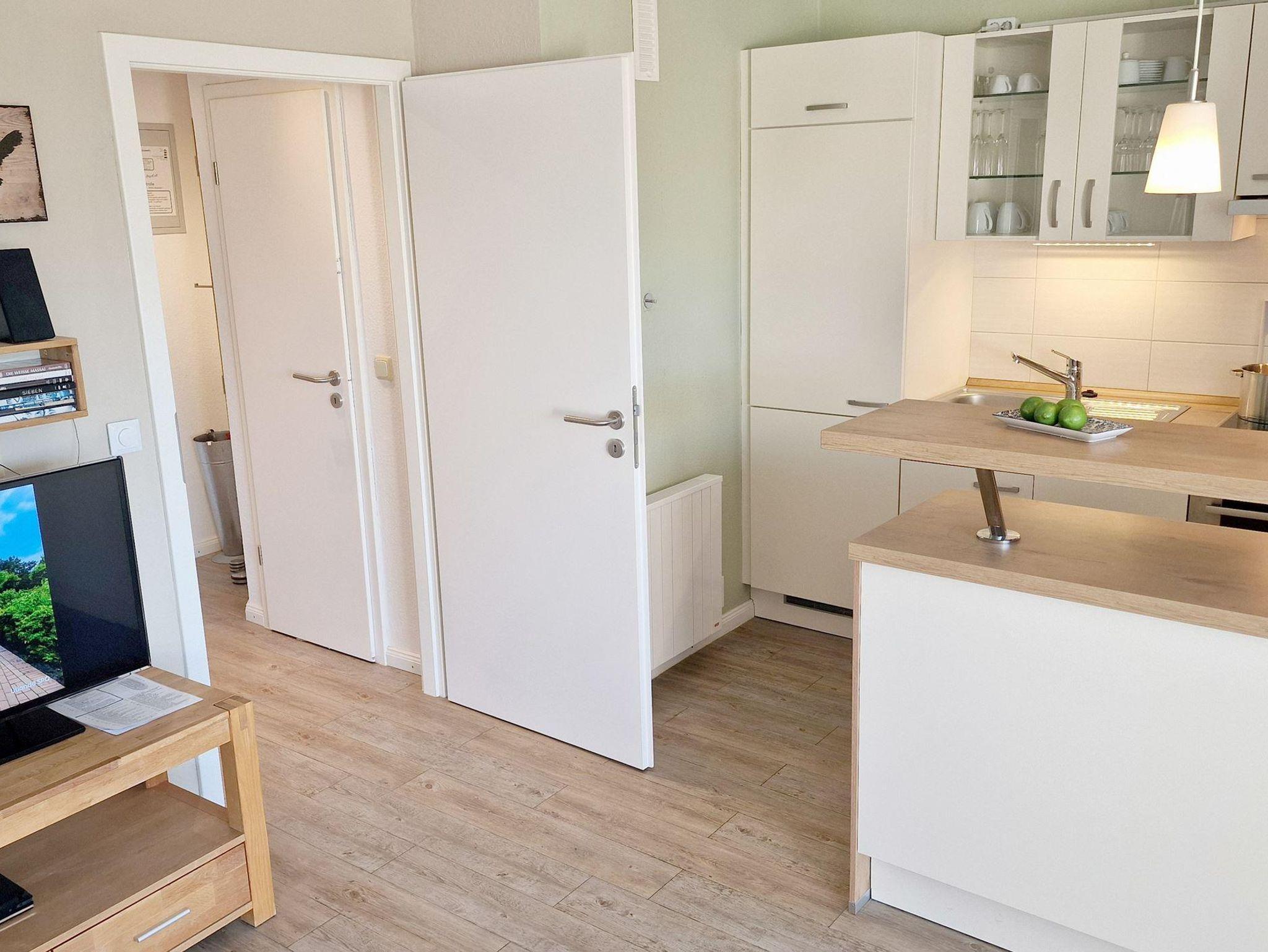 Das helle Wohn-Esszimmer mit offener Küchenzeile lädt zum Entspannen ein und bietet direkten Zugang zu einem Balkon, auf dem Sie die frische Luft genießen können. Ein modernes Duschbad sorgt für zusätzlichen Komfort während Ihres Aufenthalts.