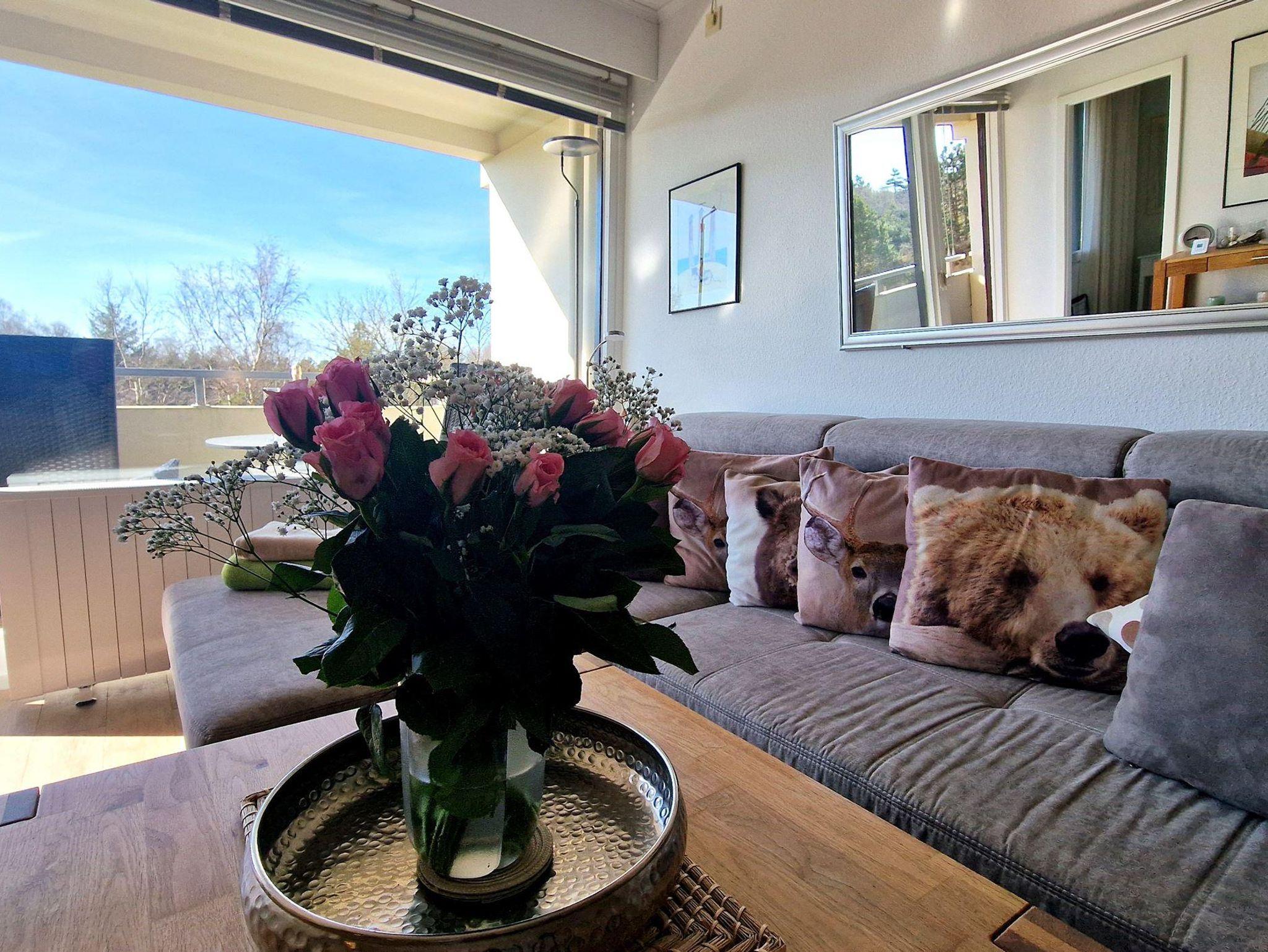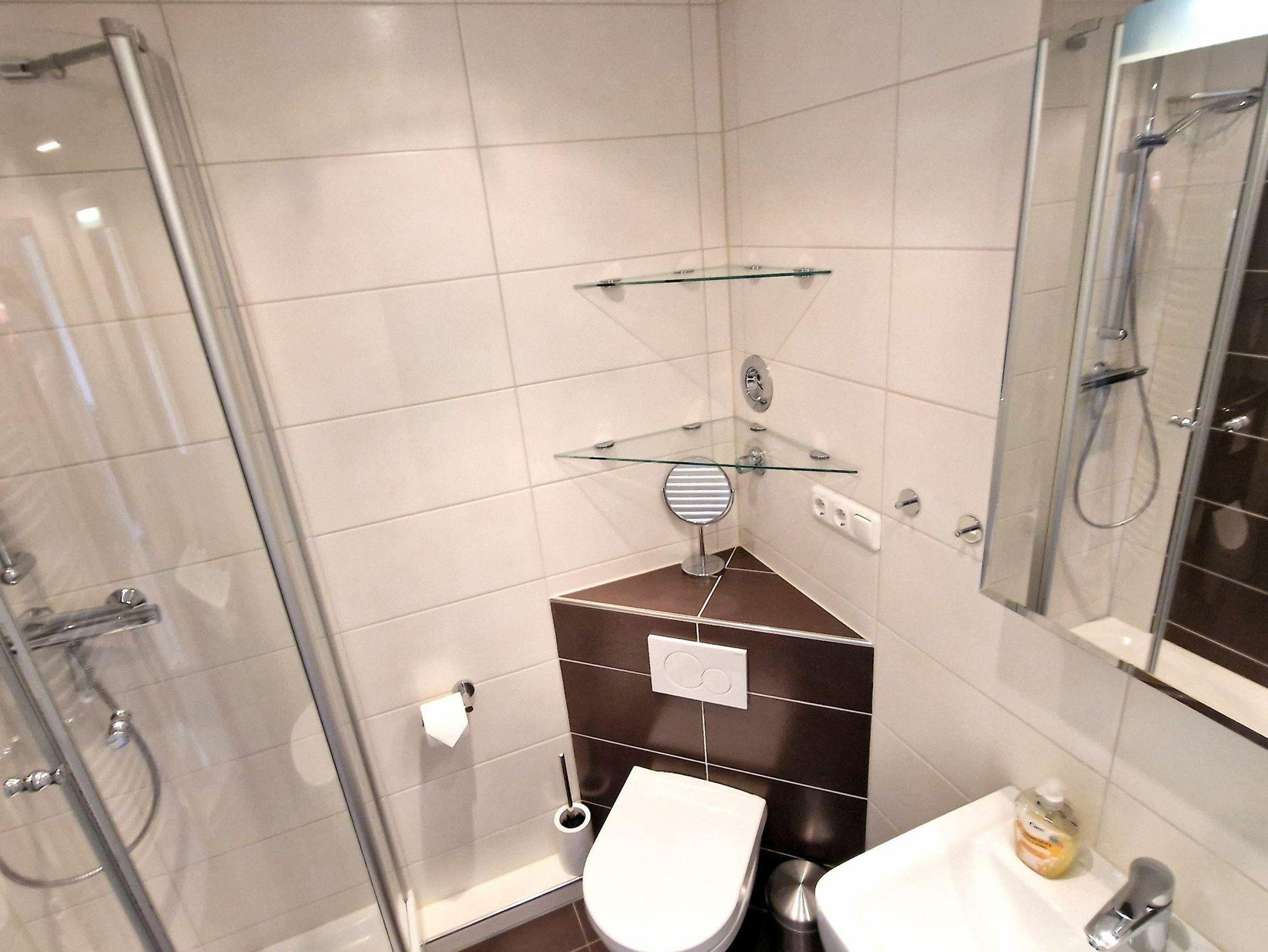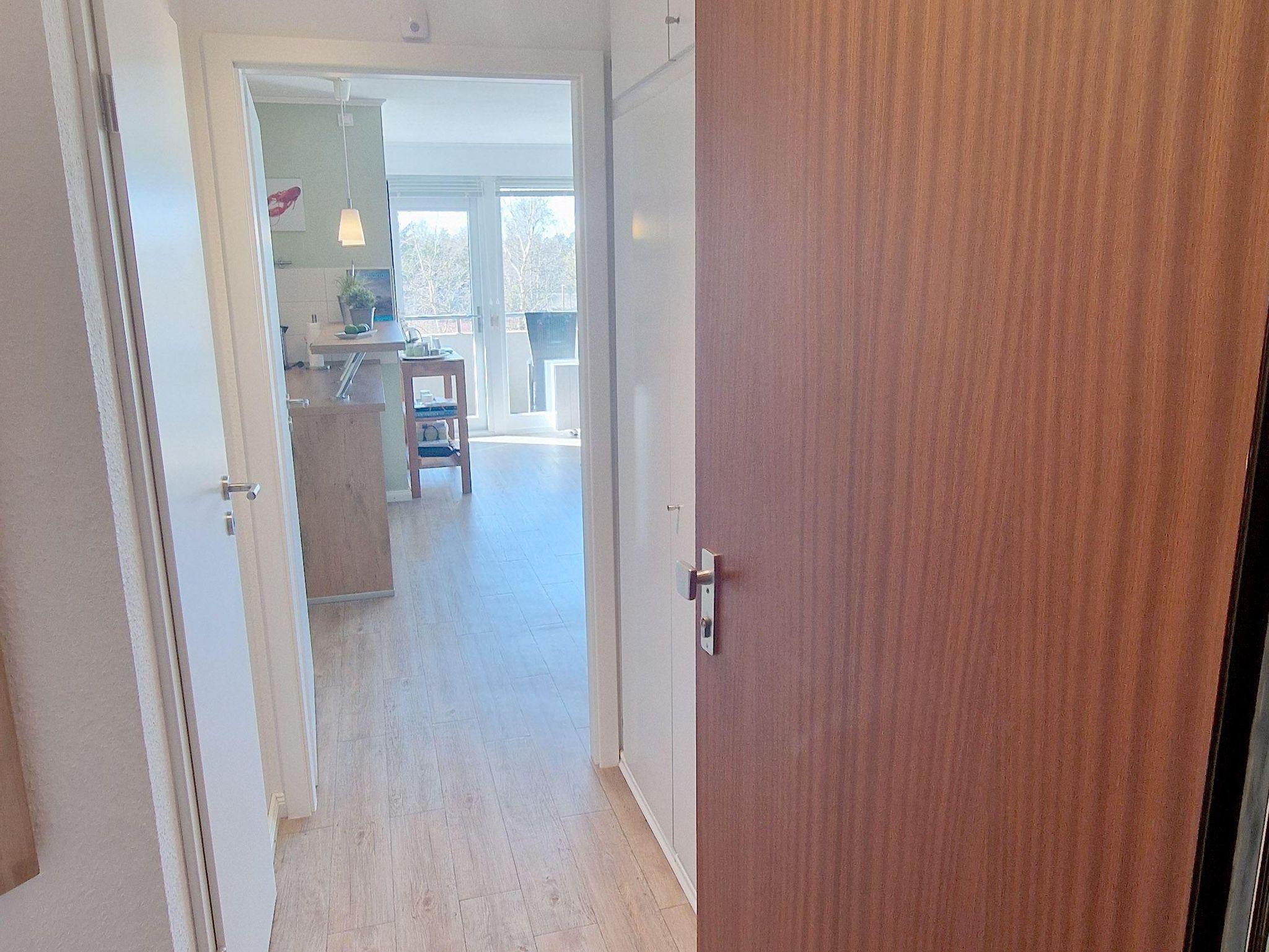 Das helle Wohn-Esszimmer mit offener Küchenzeile lädt zum Entspannen ein und bietet direkten Zugang zu einem Balkon, auf dem Sie die frische Luft genießen können. Ein modernes Duschbad sorgt für zusätzlichen Komfort während Ihres Aufenthalts.