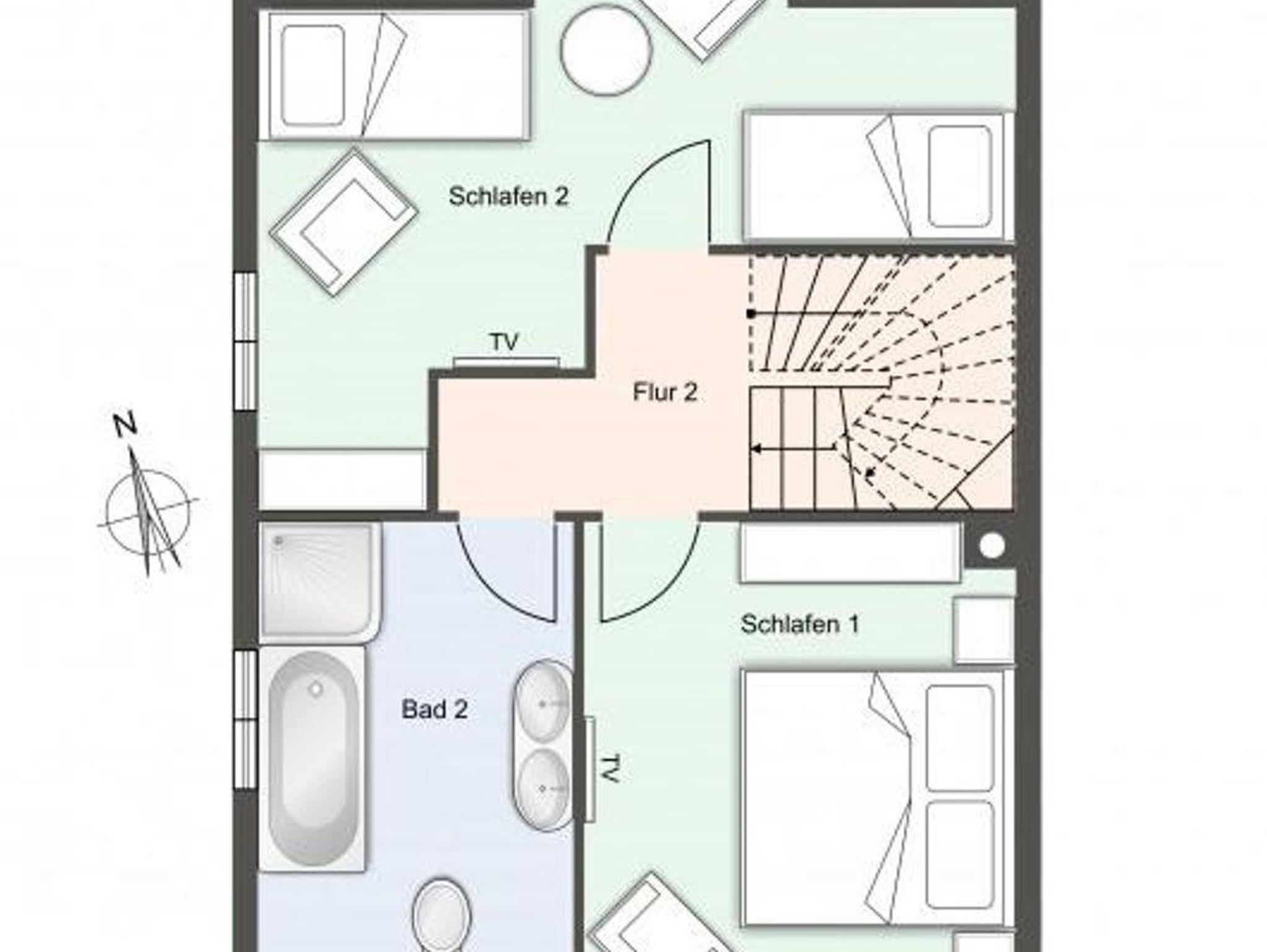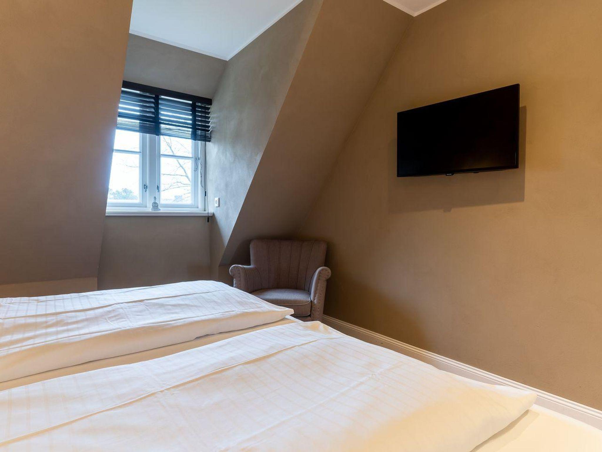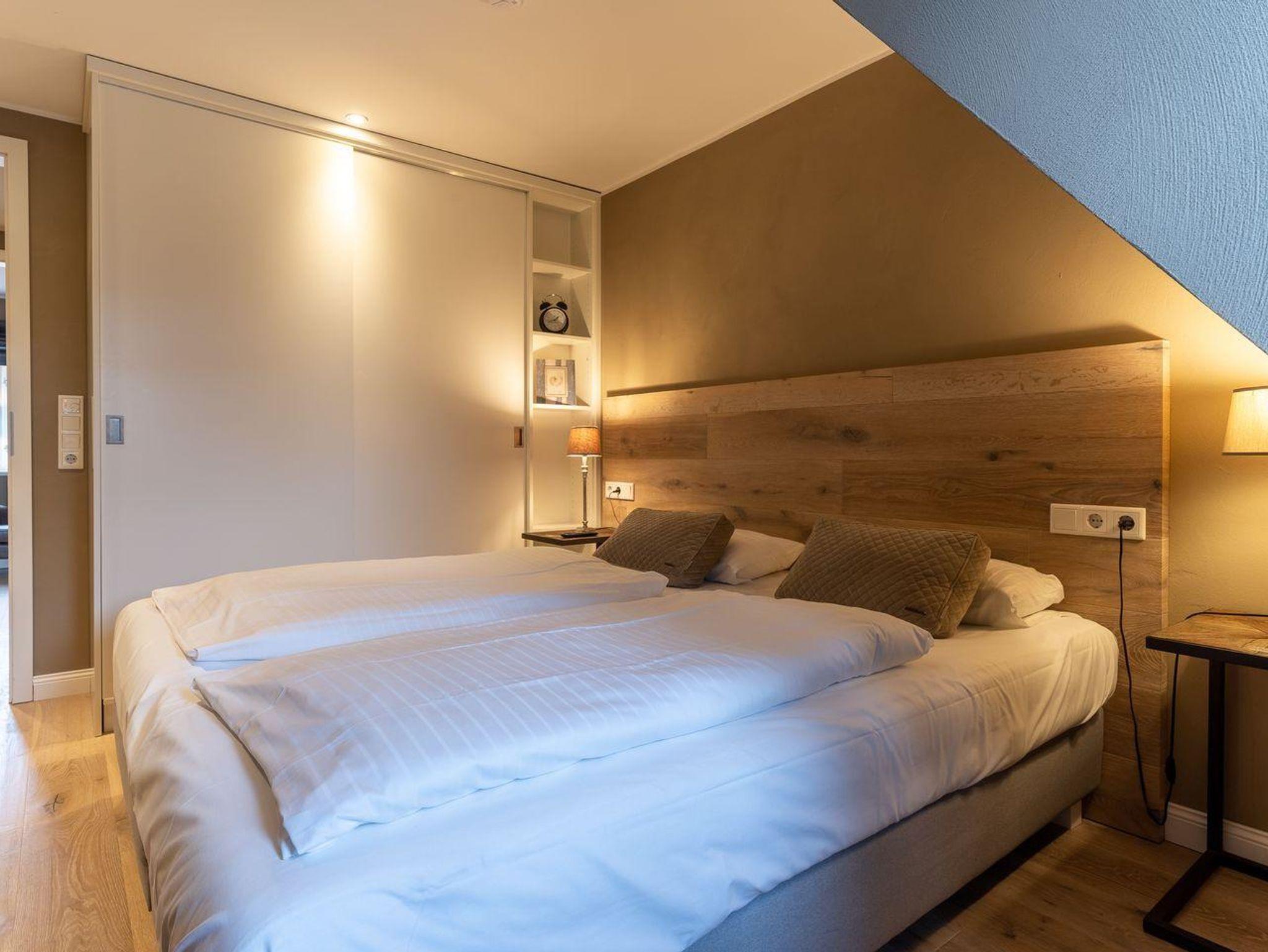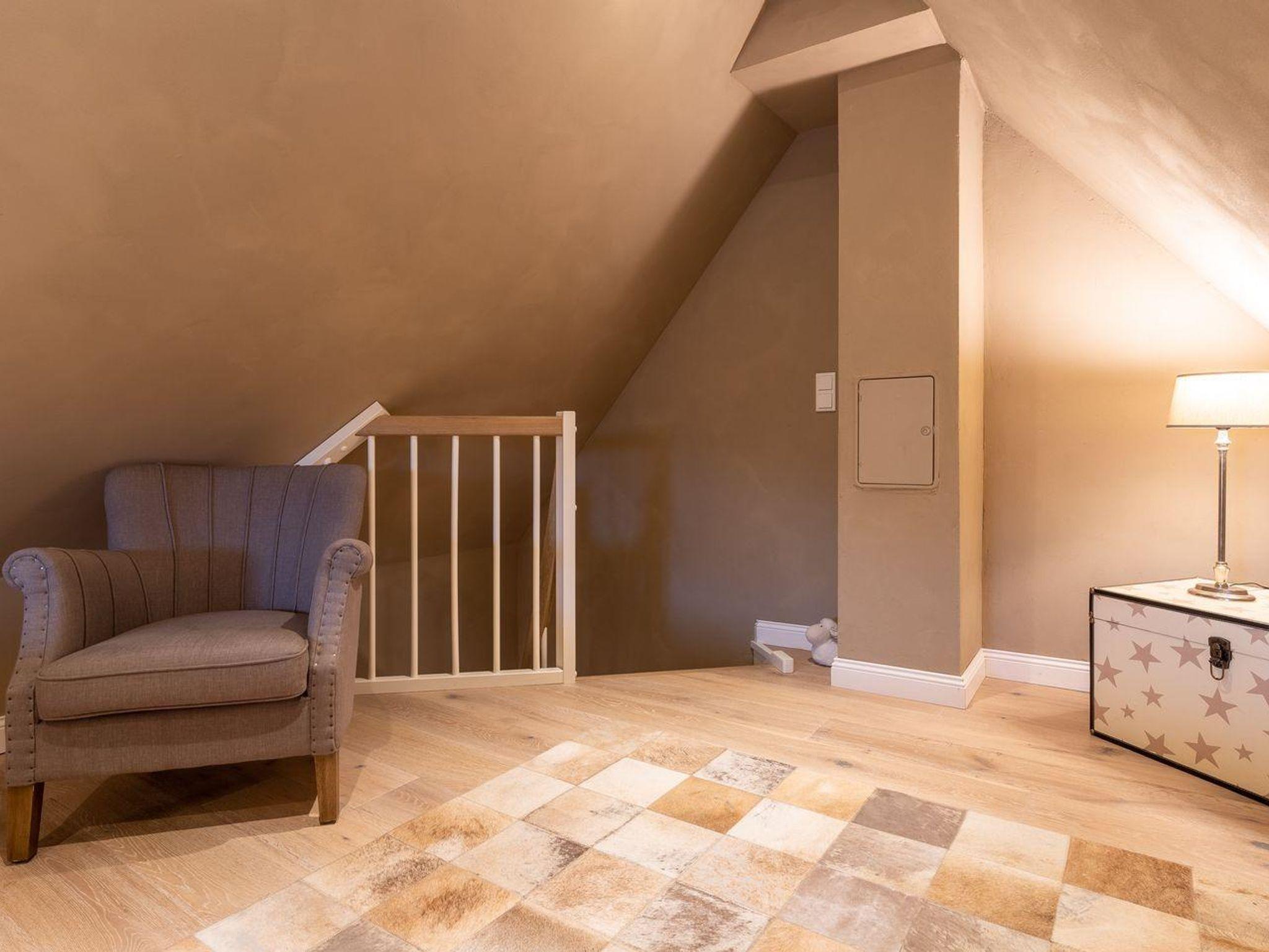 Über eine Holztreppe gelangt man in das mit Parkett ausgelegte Obergeschoss. Dieses verfügt ebenfalls über eine Fußbodenheizung. Die beiden Schlafzimmer, eines mit einem Boxspring-Doppelbett und eines mit 2 Boxspring-Einzelbetten, sind ebenfalls jeweils mit TV ausgestattet. Einbauschränke gewähren Ihnen hinreichend Ablageflächen. Darüber hinaus befindet sich im Obergeschoss ein weiteres, geräumiges Bad mit Dusche und Badewanne. Vom Obergeschoss führt die Holztreppe hinauf in das Dachgeschoss. Hier befindet sich ein zusätzliches Schlafzimmer mit 2 Boxspring-Einzelbetten, die zum Doppelbett zusammen geschoben werden können. Dieses wunderschöne Haus lässt keine Wünsche offen und bringt Sie sofort in Urlaubsstimmung.