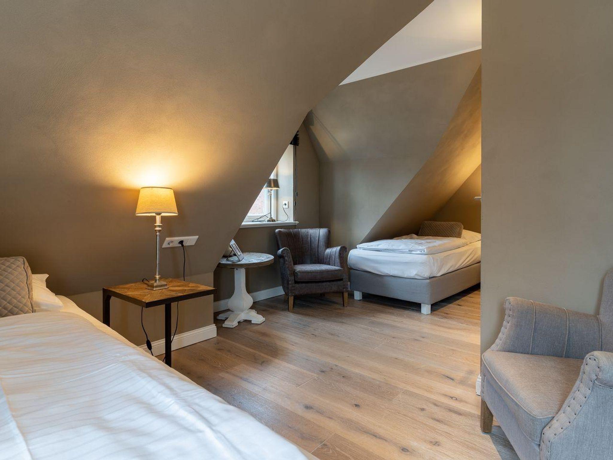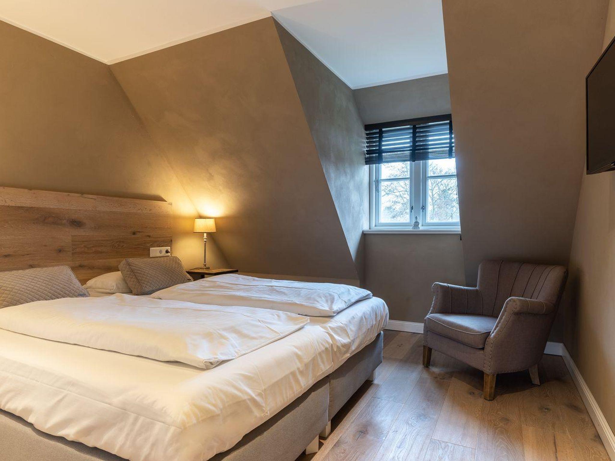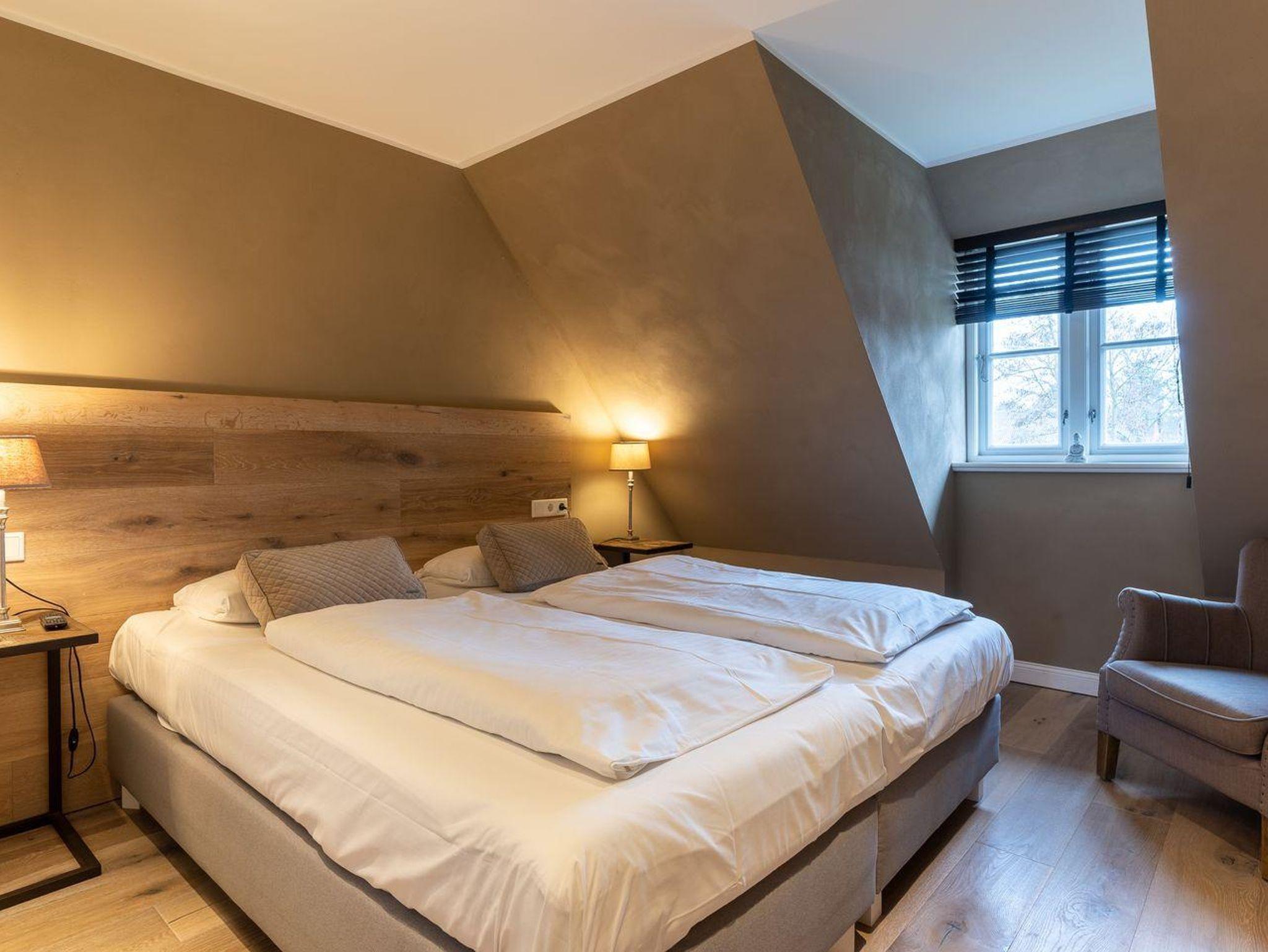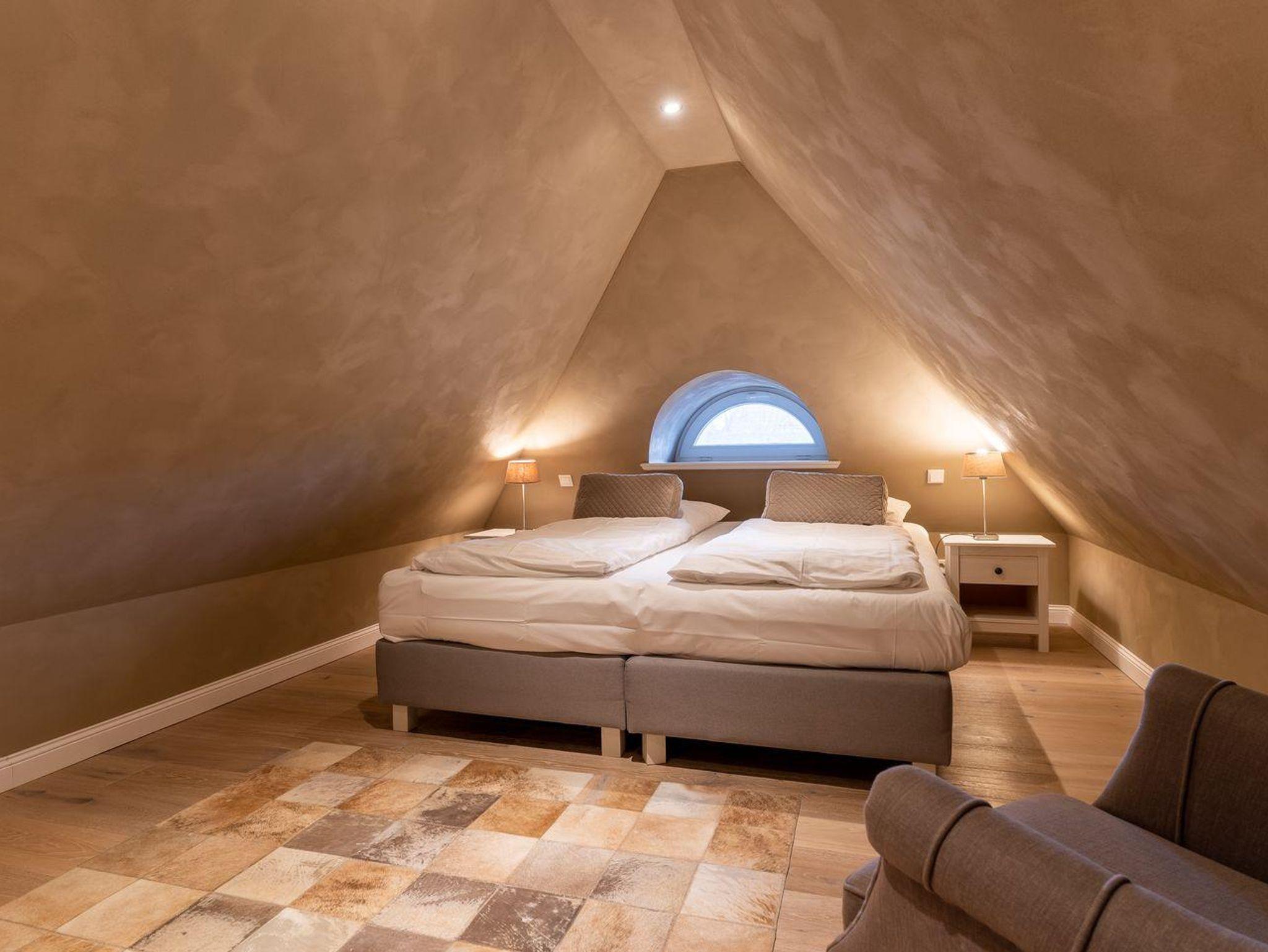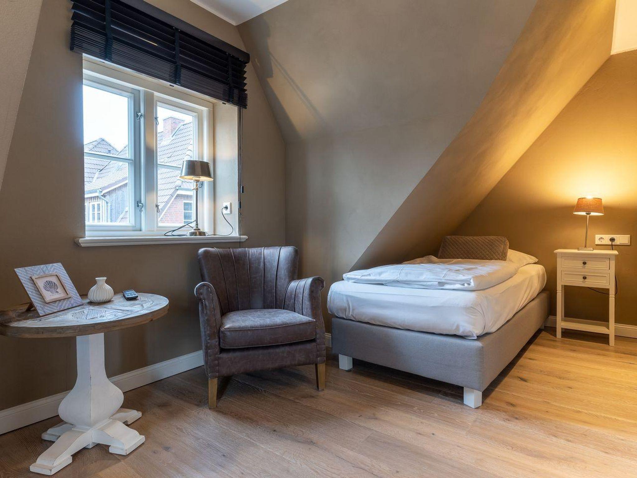 Über eine Holztreppe gelangt man in das mit Parkett ausgelegte Obergeschoss. Dieses verfügt ebenfalls über eine Fußbodenheizung. Die beiden Schlafzimmer, eines mit einem Boxspring-Doppelbett und eines mit 2 Boxspring-Einzelbetten, sind ebenfalls jeweils mit TV ausgestattet. Einbauschränke gewähren Ihnen hinreichend Ablageflächen. Darüber hinaus befindet sich im Obergeschoss ein weiteres, geräumiges Bad mit Dusche und Badewanne. Vom Obergeschoss führt die Holztreppe hinauf in das Dachgeschoss. Hier befindet sich ein zusätzliches Schlafzimmer mit 2 Boxspring-Einzelbetten, die zum Doppelbett zusammen geschoben werden können. Dieses wunderschöne Haus lässt keine Wünsche offen und bringt Sie sofort in Urlaubsstimmung.
