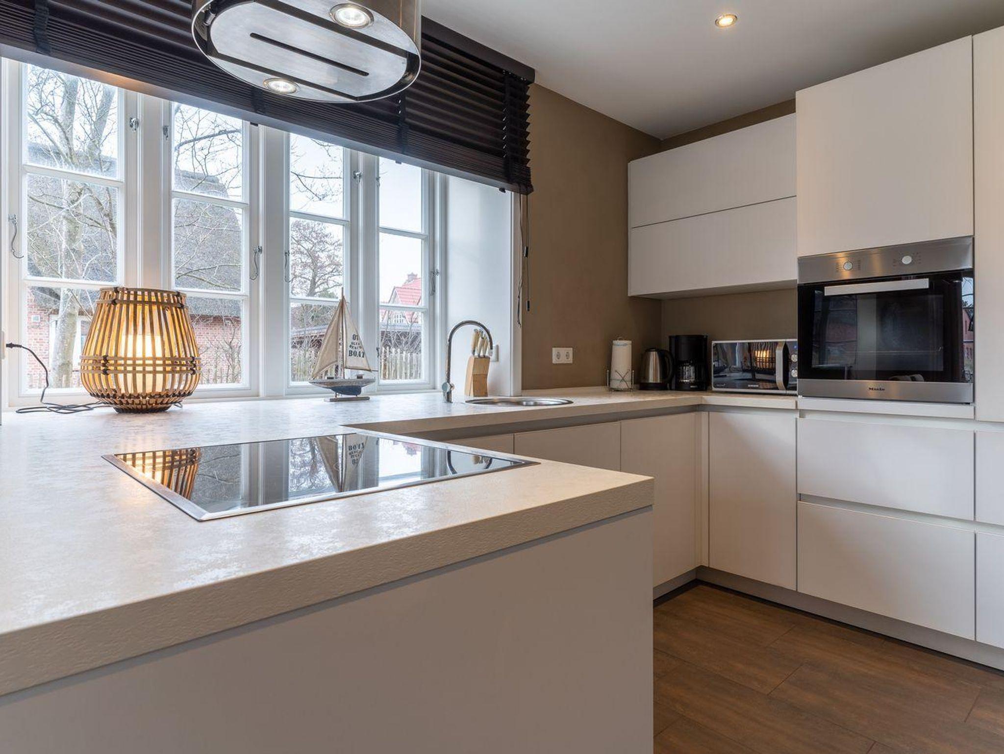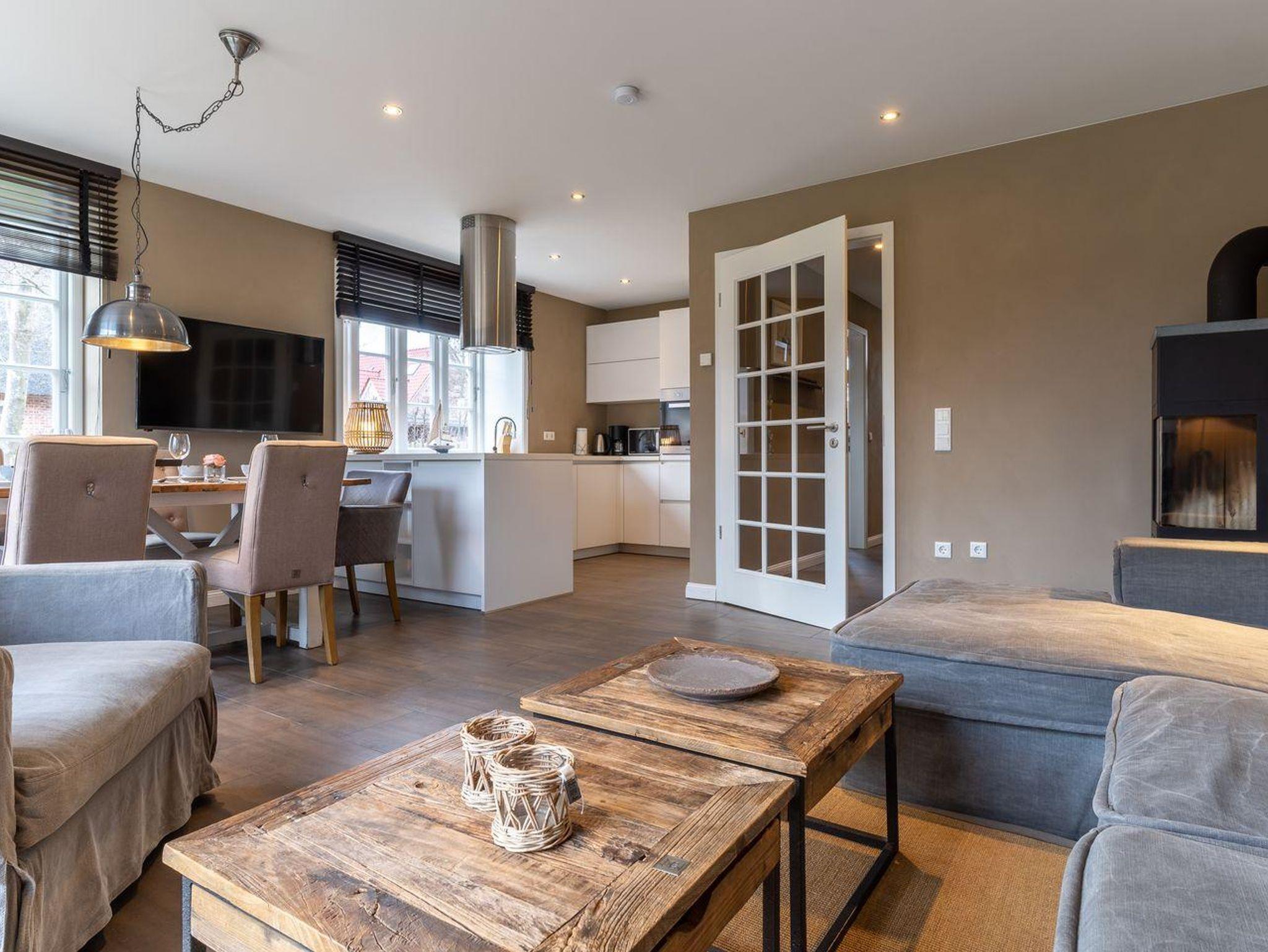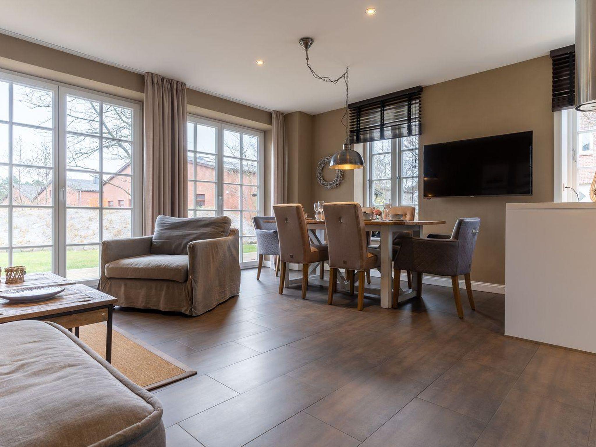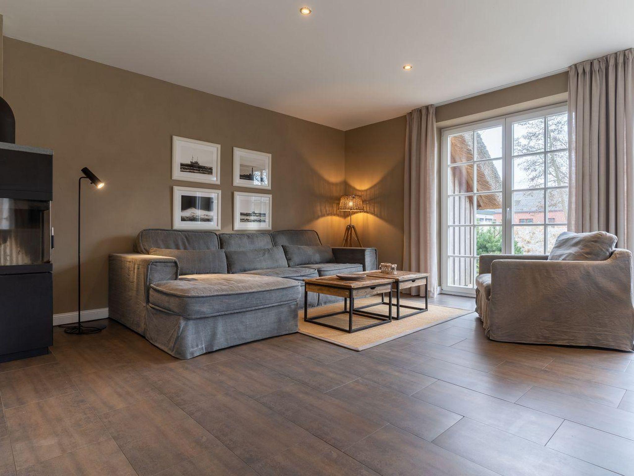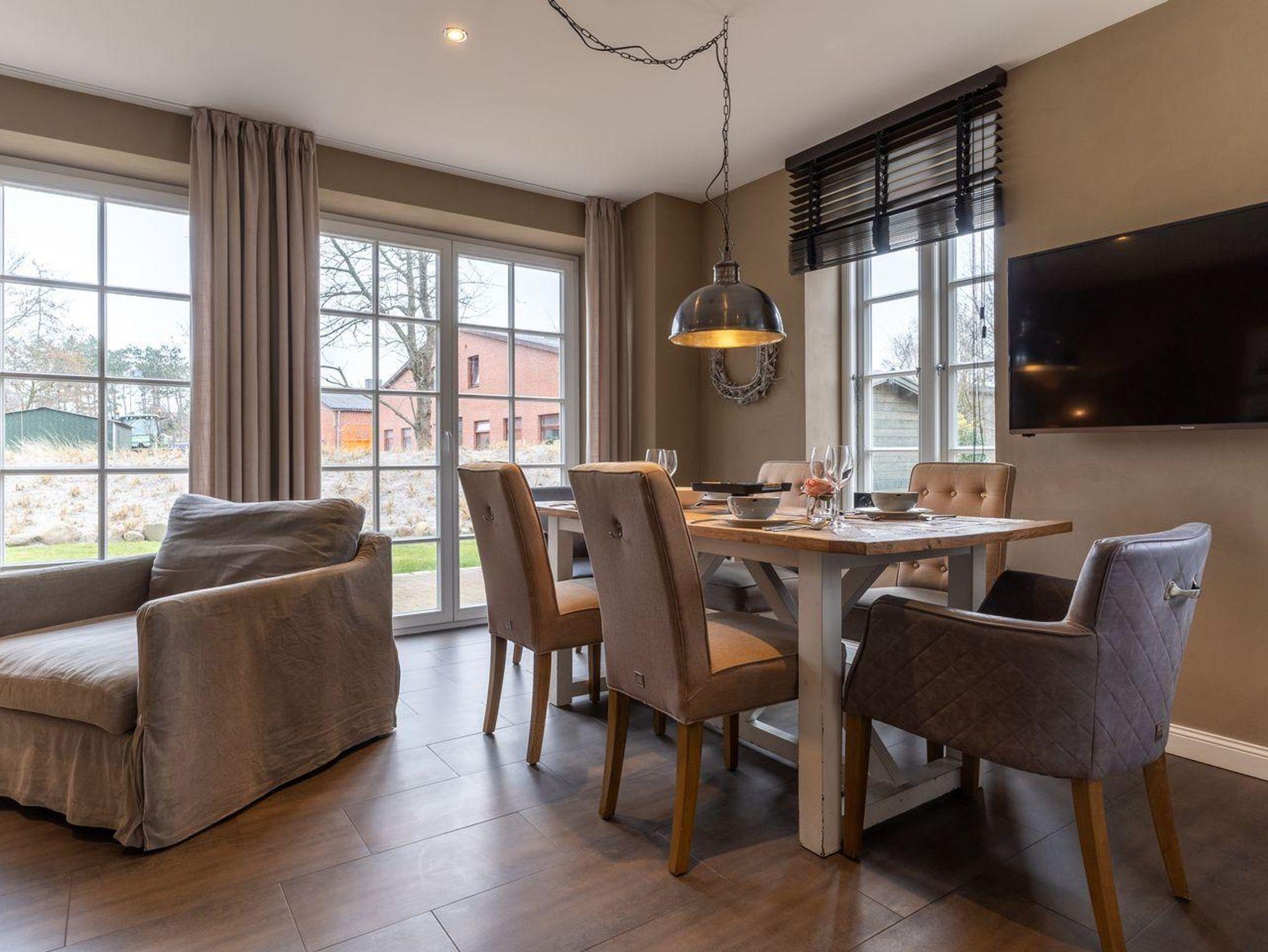 Die luxuriöse Haushälfte unter Reet verfügt über ca. 108 m² Wohnfläche und bietet Platz für 6 Personen. Im Erdgeschoss befindet sich der lichtdurchflutete Wohnraum mit TV, Kamin, einer offenen Küche sowie einem stilvollen Essbereich. Die Wohnräume sind mit exklusiven Möbeln von Riviera Maison ausgestattet. Die Küche verfügt über hochwertige Elektrogeräte. An den Wohnbereich schließen sich ein Flur mit eingebauter Garderobe, ein Hauswirtschaftsraum und ein Duschbad an. Das gesamte Erdgeschoss verfügt über geschmackvolle Fußbodenfliesen, die über eine Fußbodenheizung (Erdwärme) beheizt werden können.