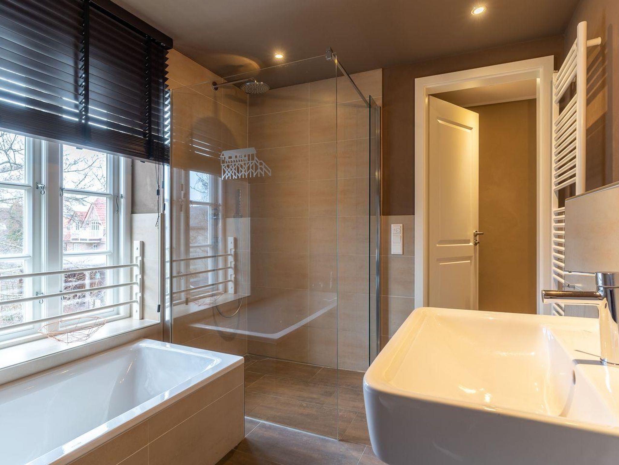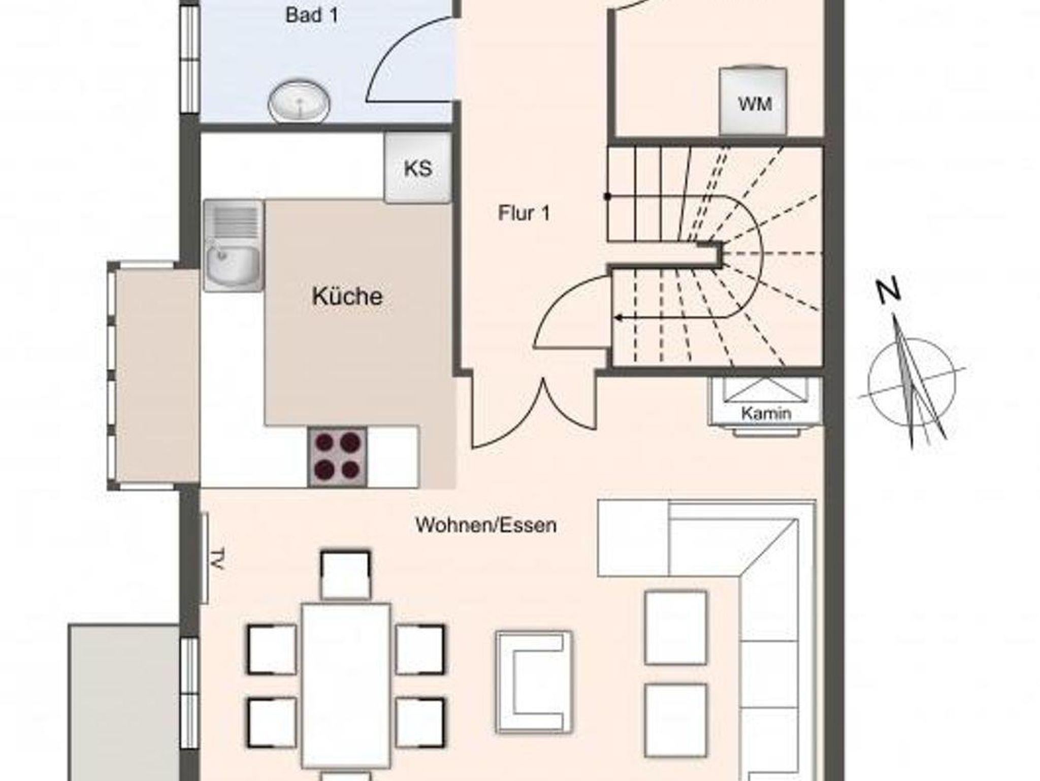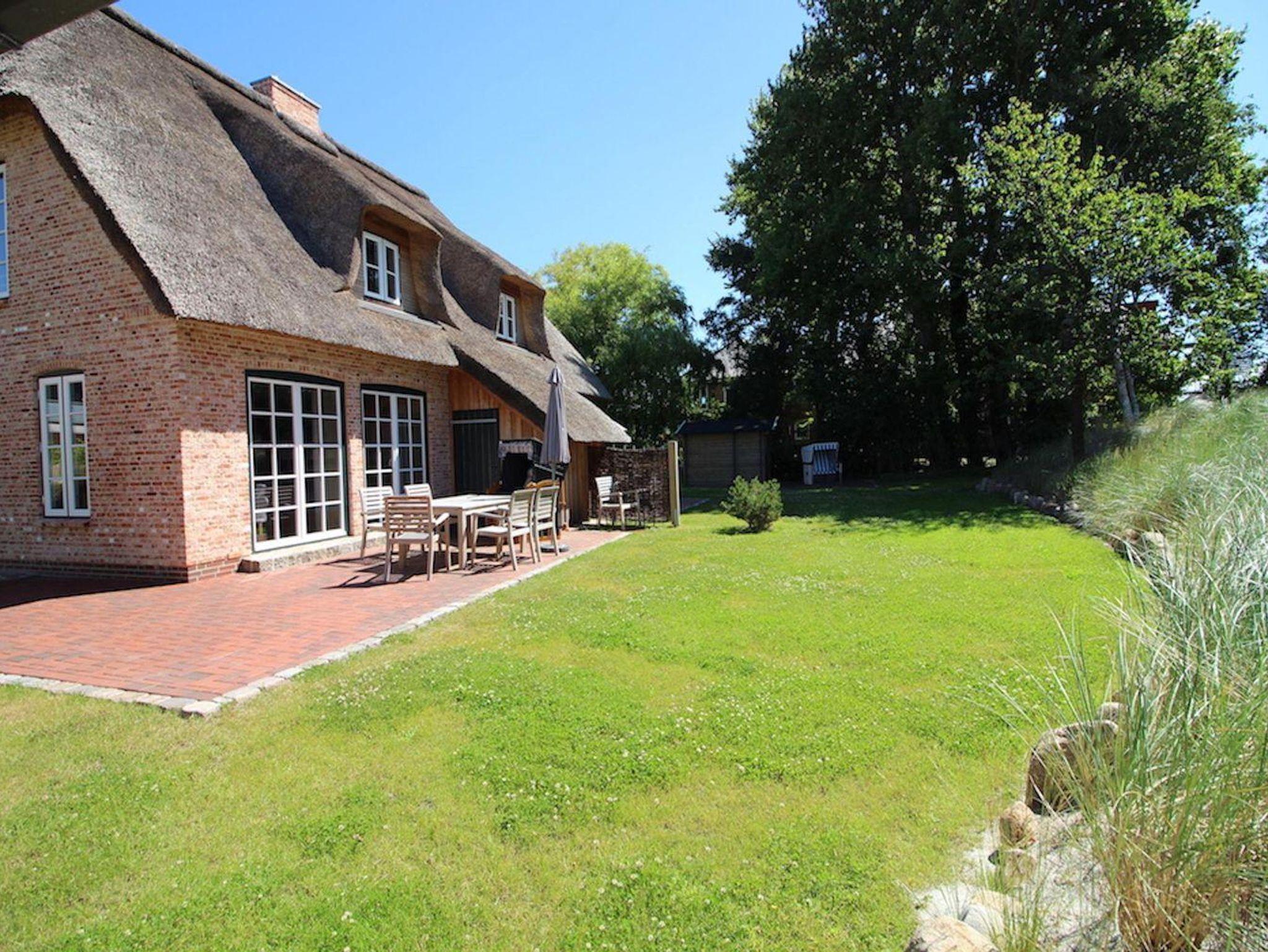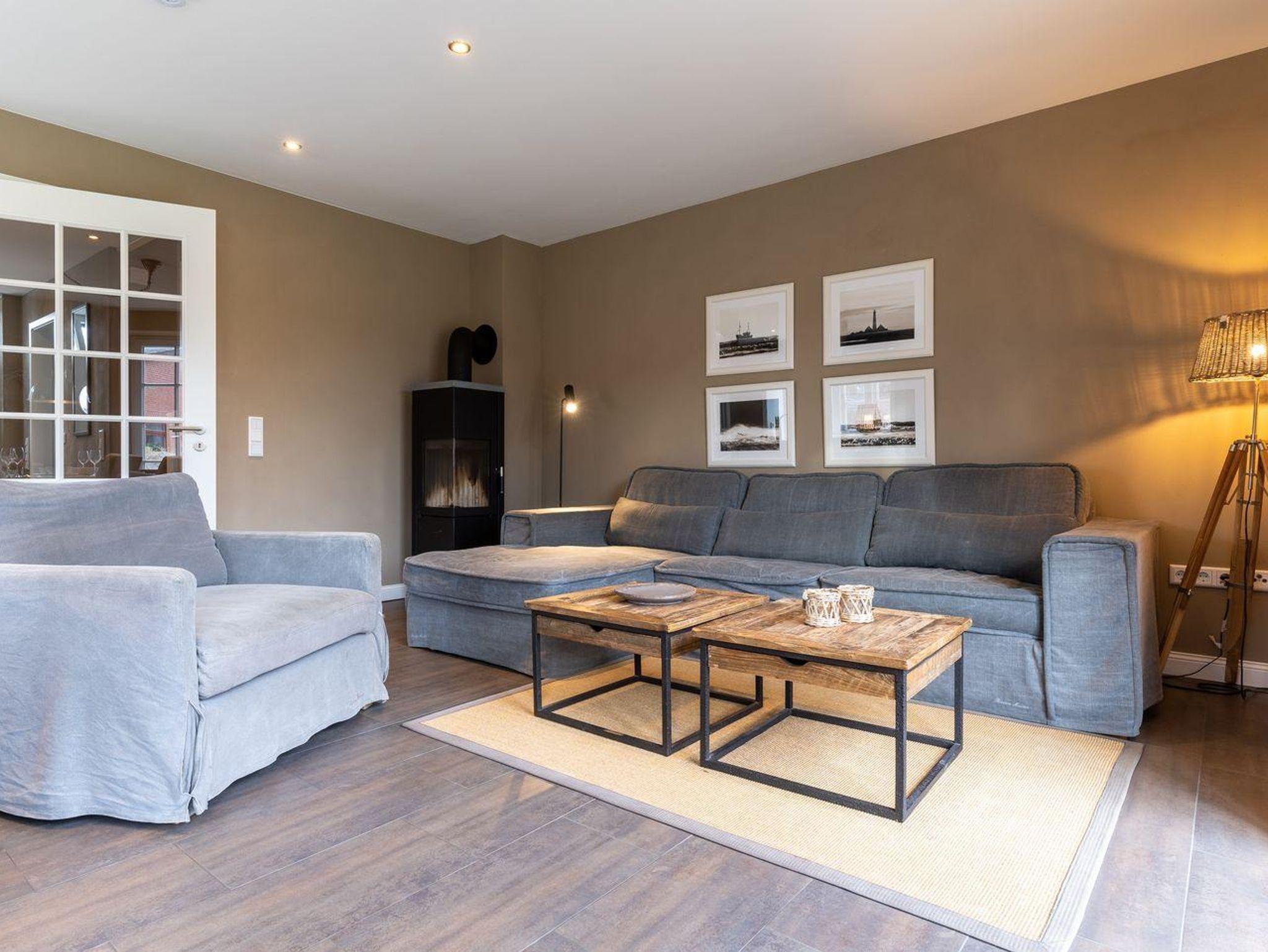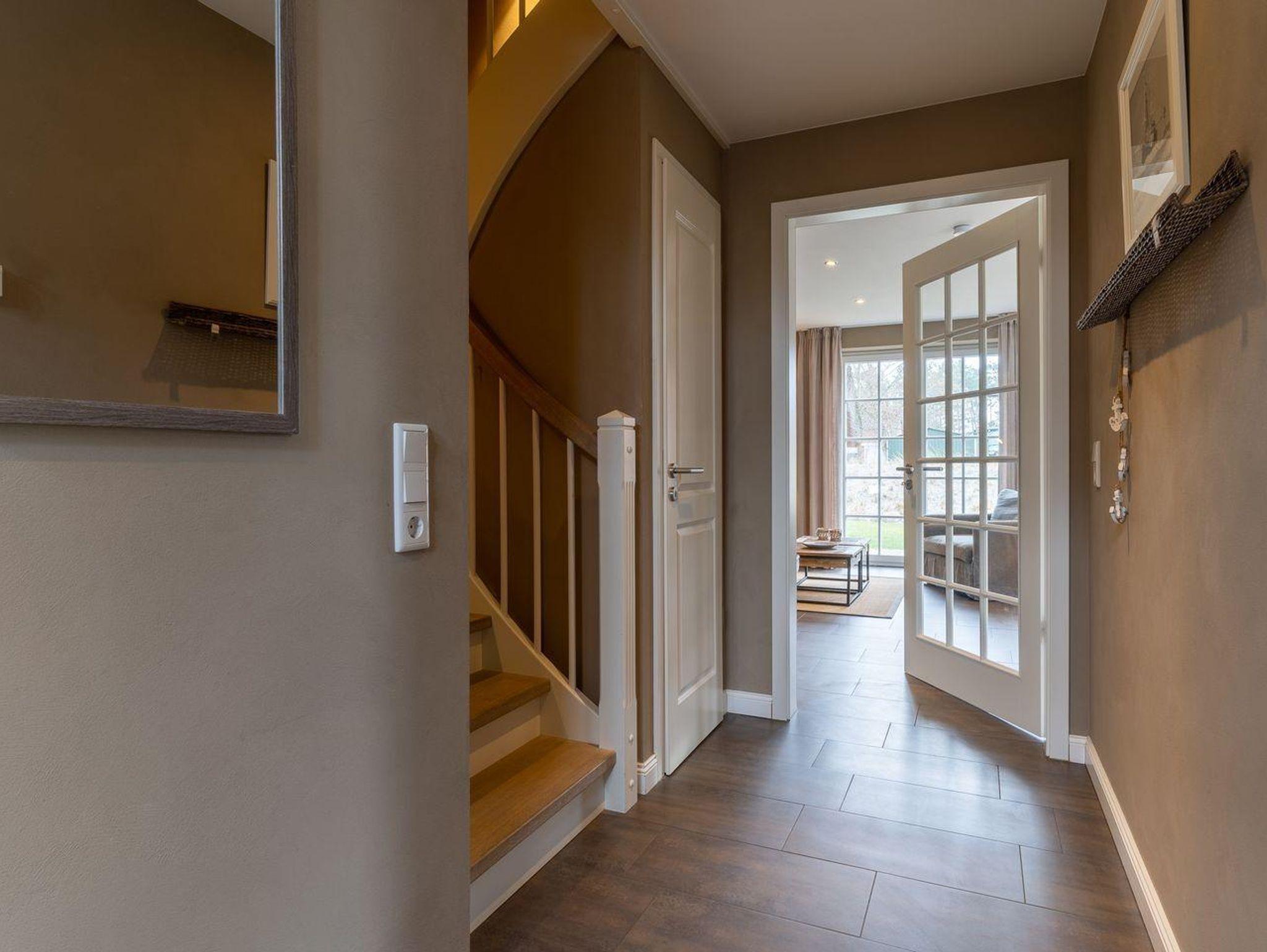 Die luxuriöse Haushälfte unter Reet verfügt über ca. 108 m² Wohnfläche und bietet Platz für 6 Personen. Im Erdgeschoss befindet sich der lichtdurchflutete Wohnraum mit TV, Kamin, einer offenen Küche sowie einem stilvollen Essbereich. Die Wohnräume sind mit exklusiven Möbeln von Riviera Maison ausgestattet. Die Küche verfügt über hochwertige Elektrogeräte. An den Wohnbereich schließen sich ein Flur mit eingebauter Garderobe, ein Hauswirtschaftsraum und ein Duschbad an. Das gesamte Erdgeschoss verfügt über geschmackvolle Fußbodenfliesen, die über eine Fußbodenheizung (Erdwärme) beheizt werden können.