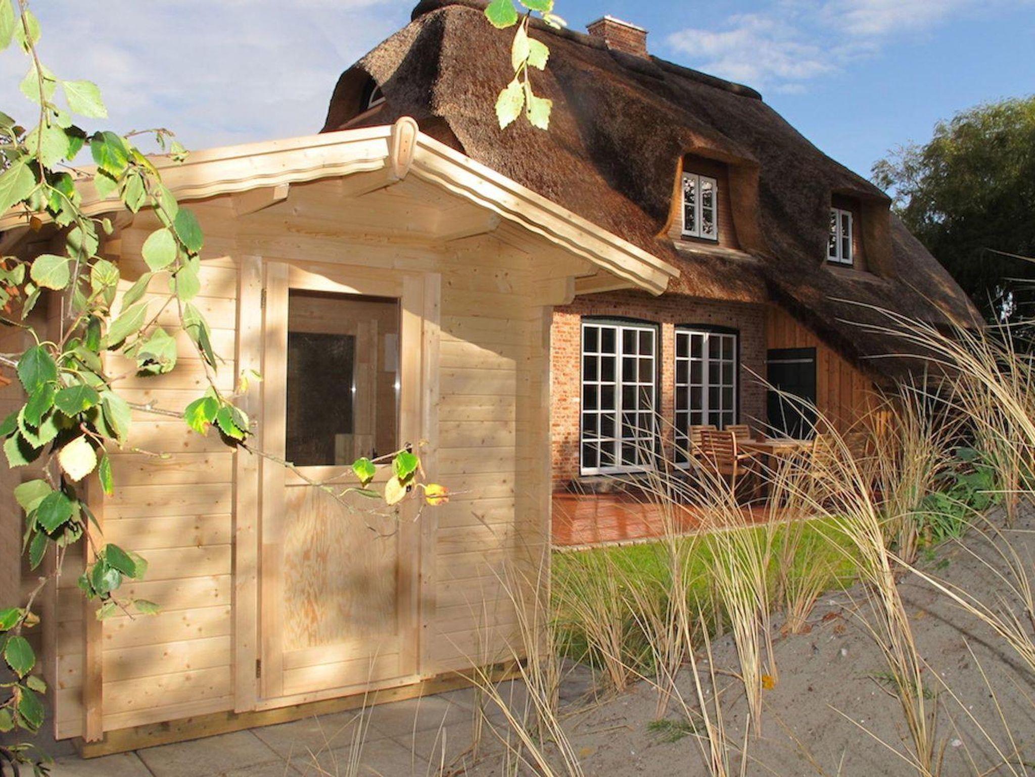 Das Grundstück mit Stellplatz, großer Rasenfläche und einer geschützten, sonnigen Terrasse ist mit heimischen Pflanzen und einer Düne angelegt. Aus einem Strandkorb können Sie den Blick auf das Haus oder die Düne genießen.