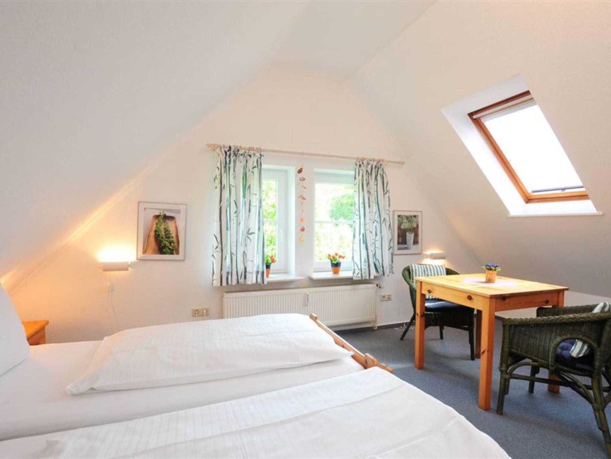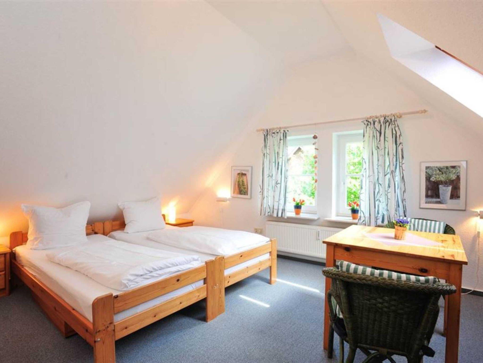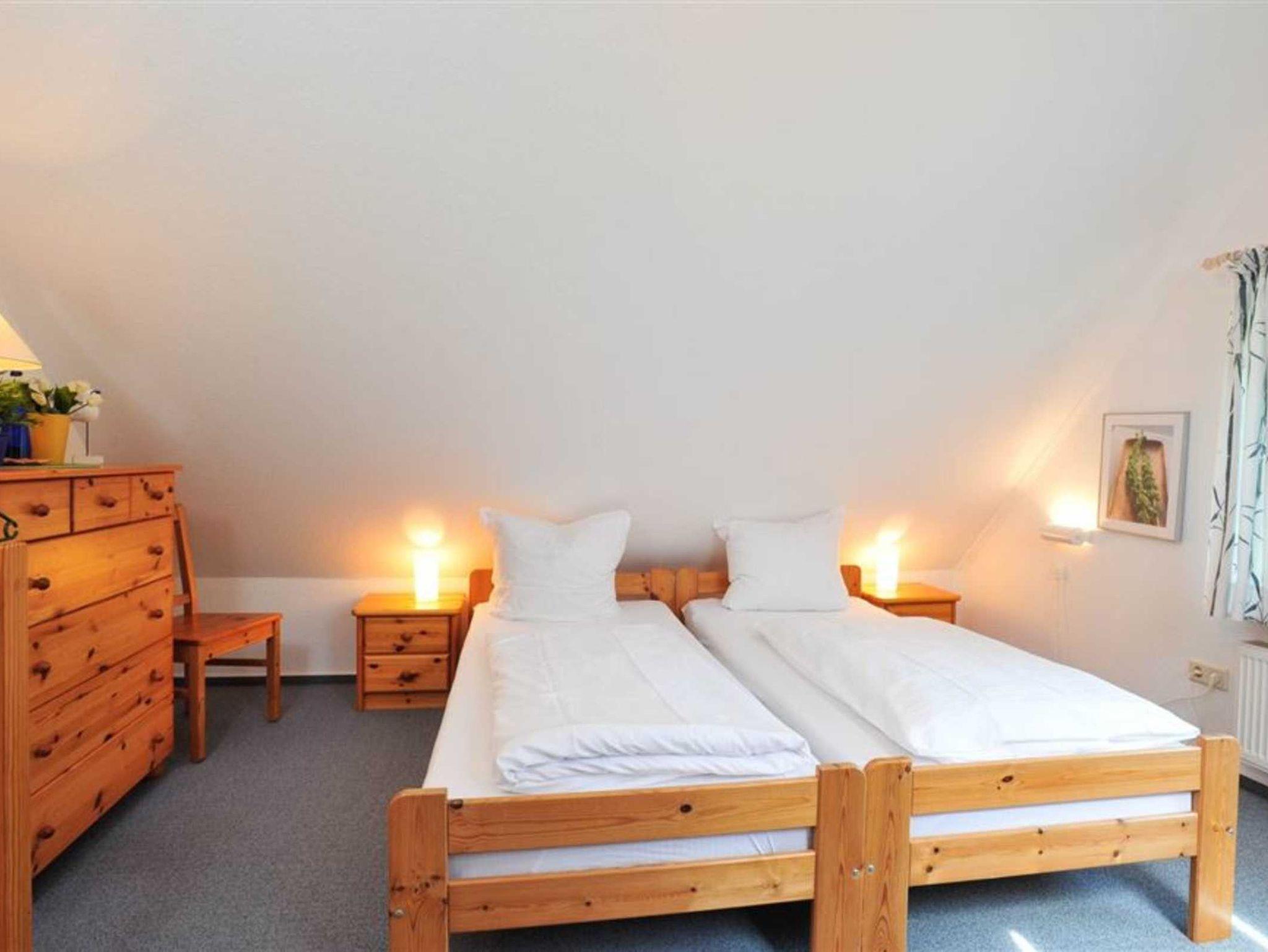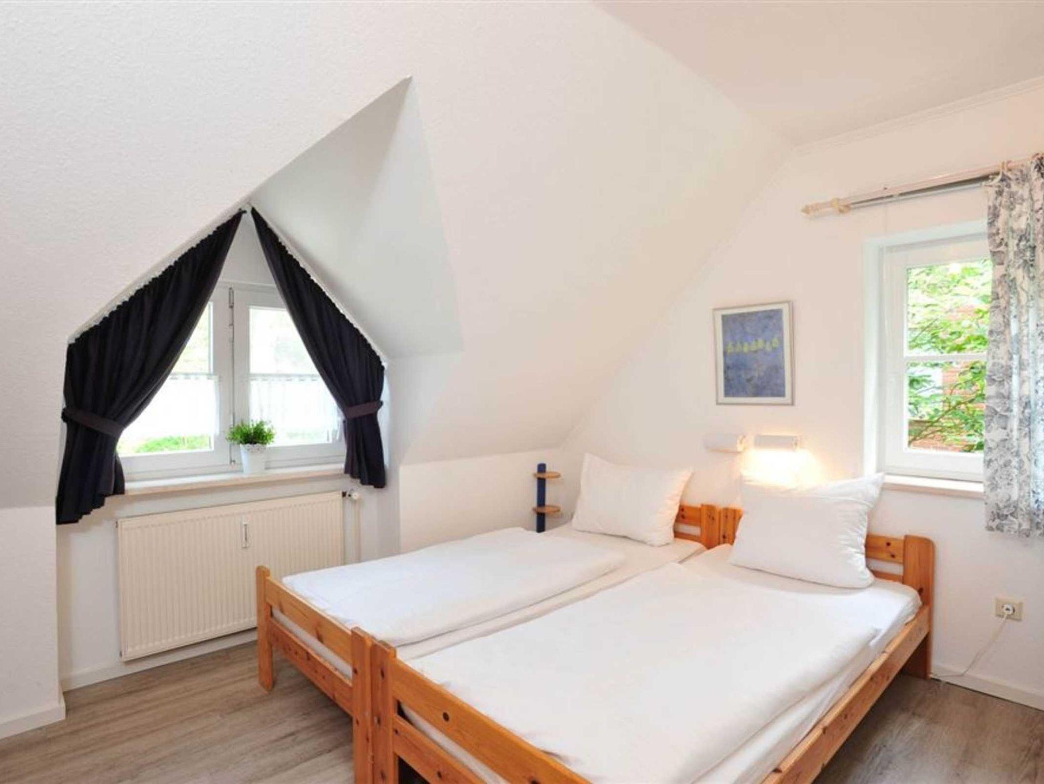 2. Schlafzimmer (halboffen) mit 2 Einzelbetten (je 90x200cm), Kommode, Tisch, 2 Sesseln und Stuhl. Zugang über eine steile Wendeltreppe vom Wohnzimmer.