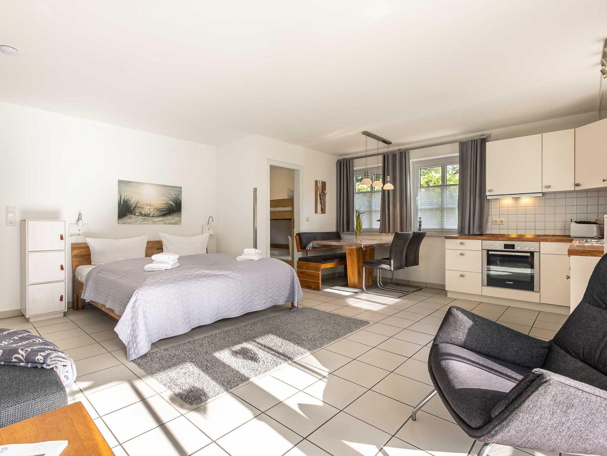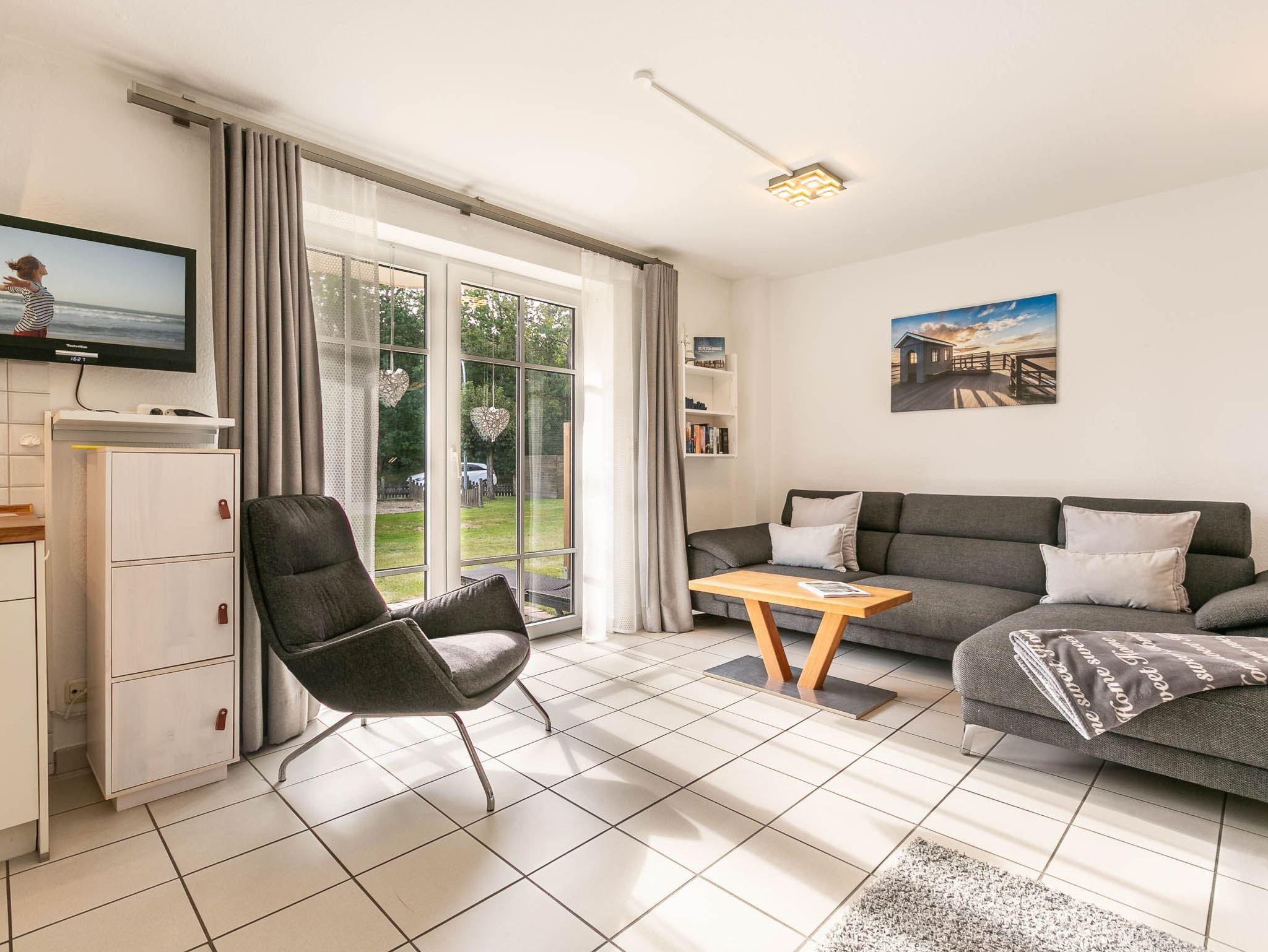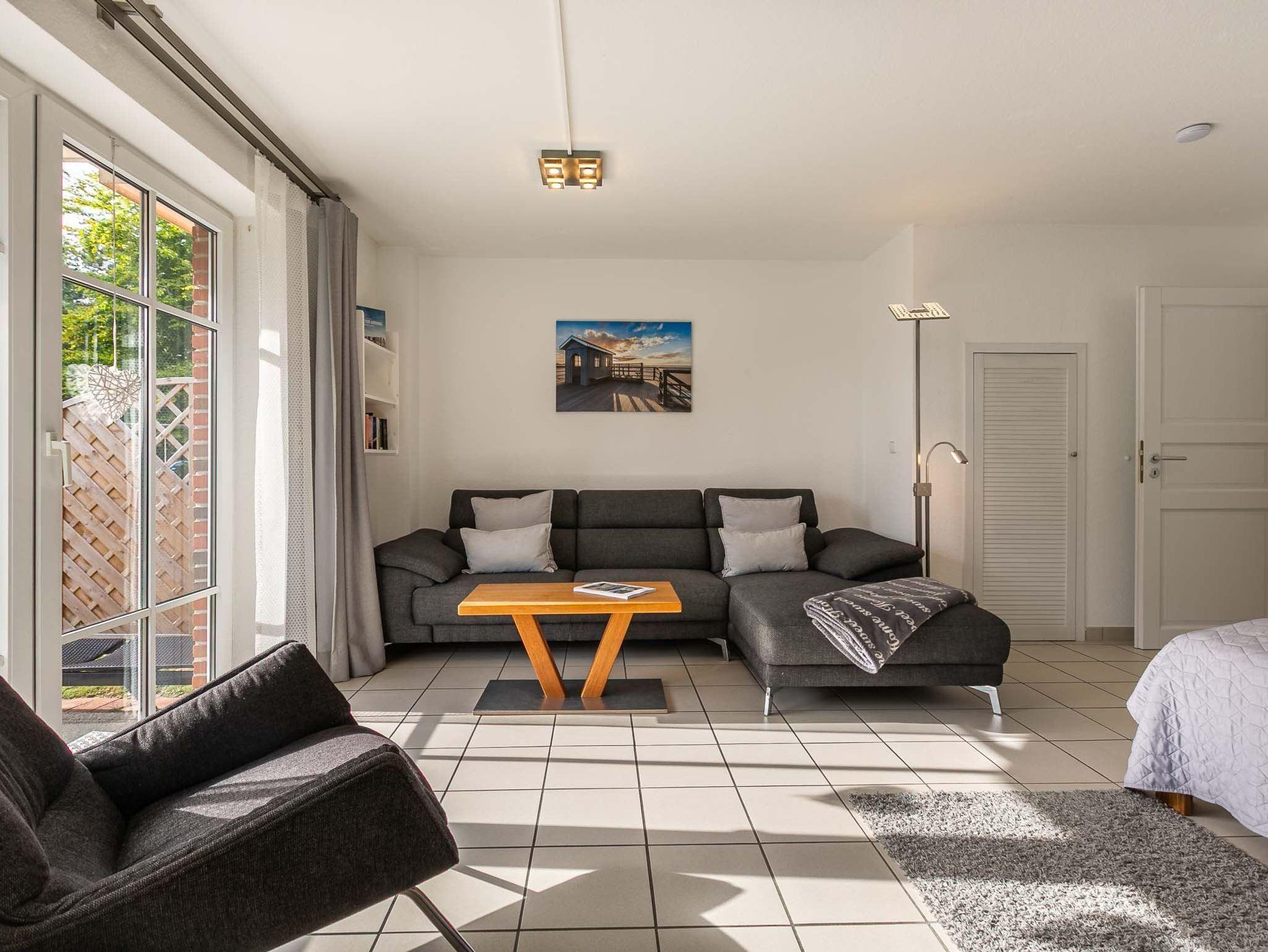 Wohnzimmer mit Doppelbett (2x 90x200cm), großem Sofa mit Ottomane, TV (Kabel) und Esstisch mit gepolsterter Sitzbank und 2 Stühlen. Direkter Zugang zur sonnigen Garten-Terrasse nach Südwesten mit Gartenmöbeln und Sonnenliege. Offene Küche mit Backofen, Geschirrspüler, Kühlschrank mit Gefrierfach und Tchibo Caffissimo Kapsel-Kaffeemaschine.