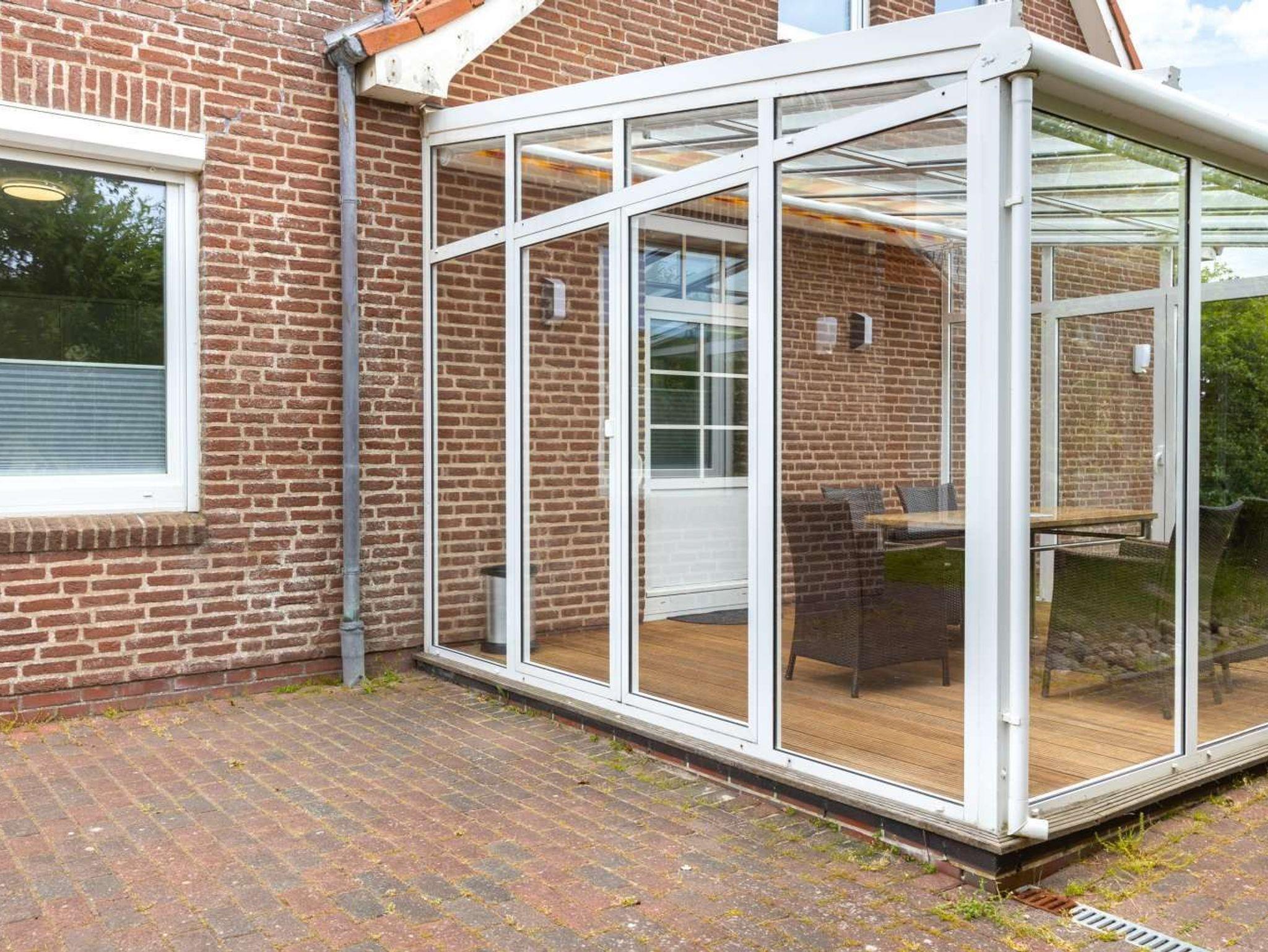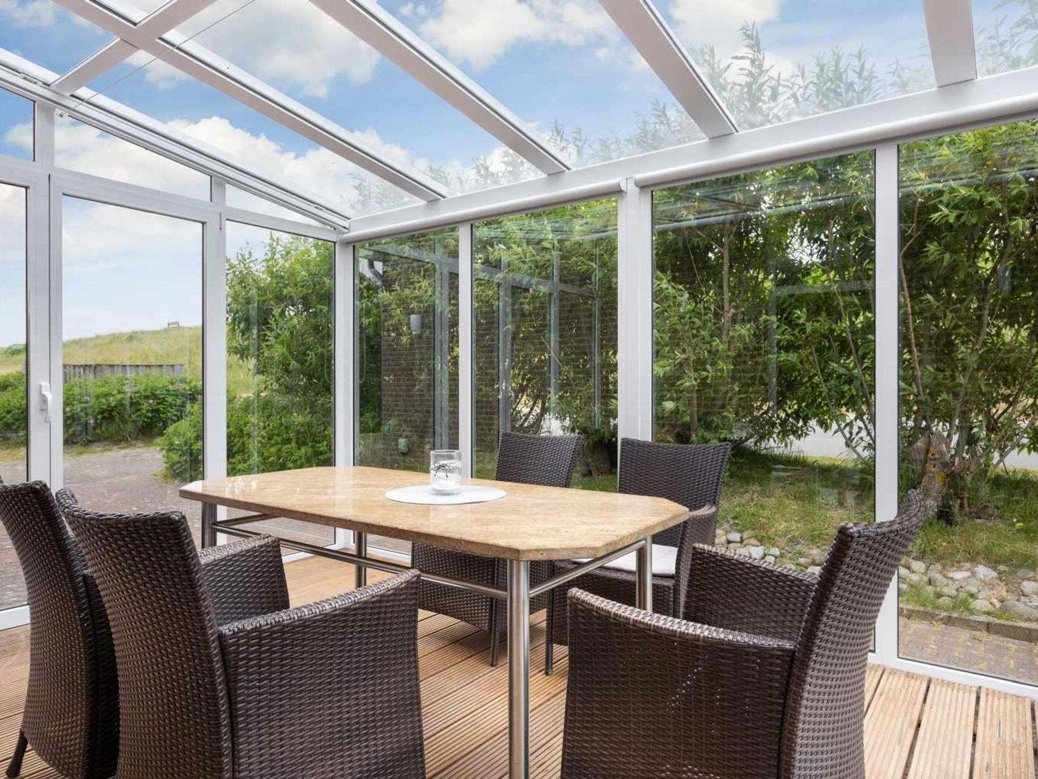 Wohnzimmer mit gemütlichem Ecksofa und TV (Sat). Direkter Zugang zum möblierten Wintergarten mit elektrischer Sonnenmarkise. Offene Küche mit Backofen, Mikrowelle, Geschirrspüler, Kühlschrank mit Gefrierfach und Esstisch mit 4 Stühlen.