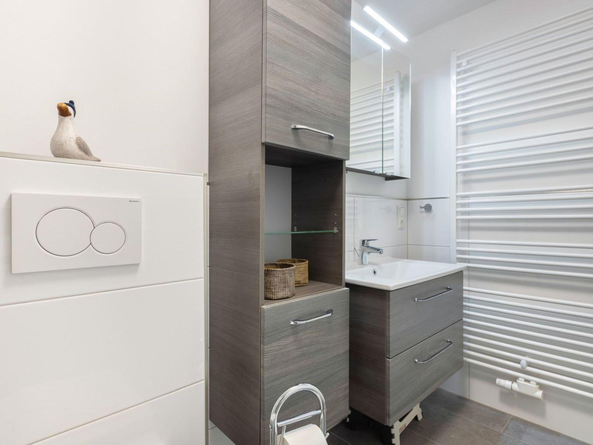 Badezimmer (Duschbad) mit ebenerdiger Regen-Dusche, WC, Handtuchwärmer und Föhn.