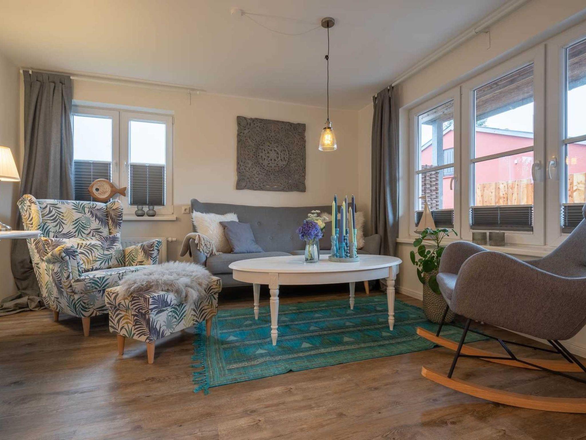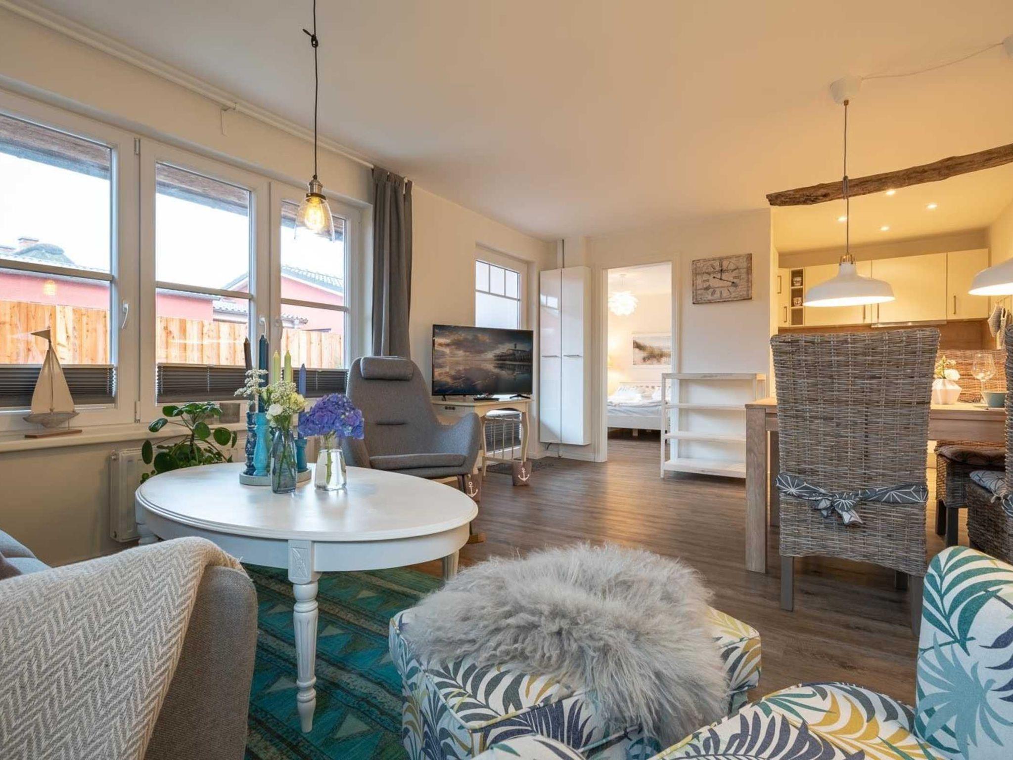 Wohnzimmer mit Sofa für 2-3 Personen, Ruhesessel mit Fußstück, Schaukelstuhl, großem TV (Kabel) und Esstisch mit 4 Stühlen. Direkter Zugang zur möblierten Gartenterrasse nach Süden - zum ganz privaten Entspannen und Erholen. Offene Küche mit Backofen, Geschirrspüler und Kühlschrank mit Gefrierfach.