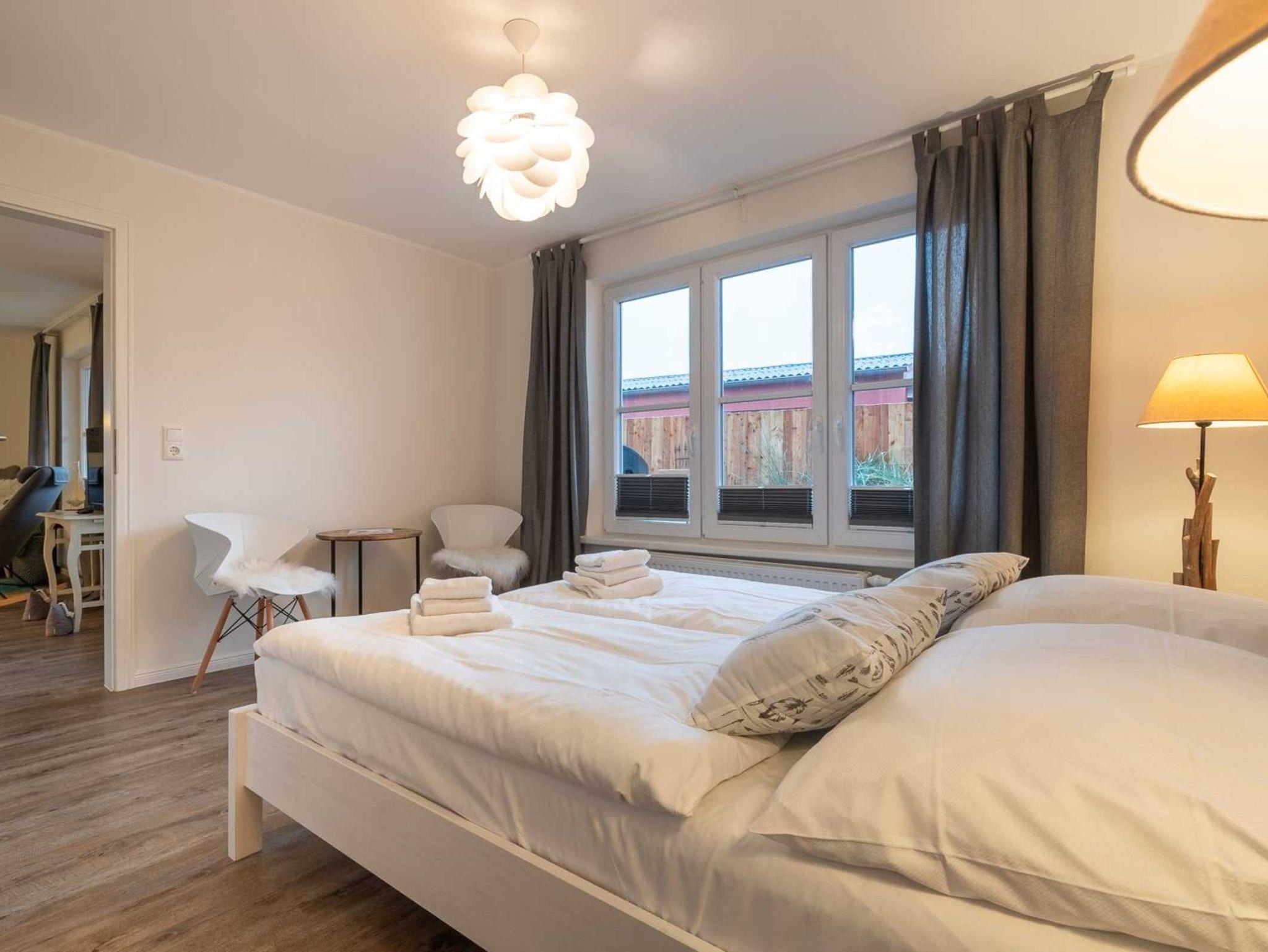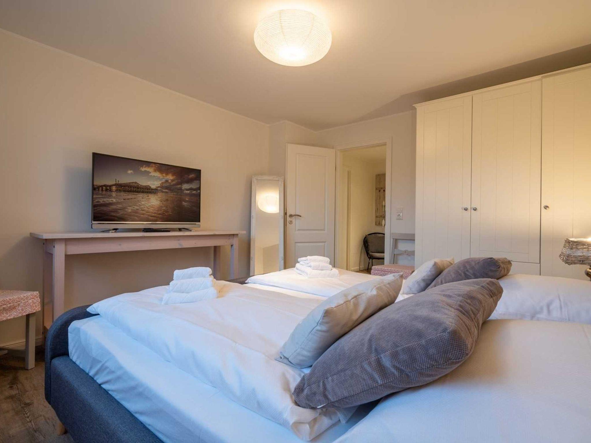 1. Schlafzimmer mit Doppelbett (2x 90x200cm), Kleiderschrank, Stuhl und großem TV mit BluRay-Player.