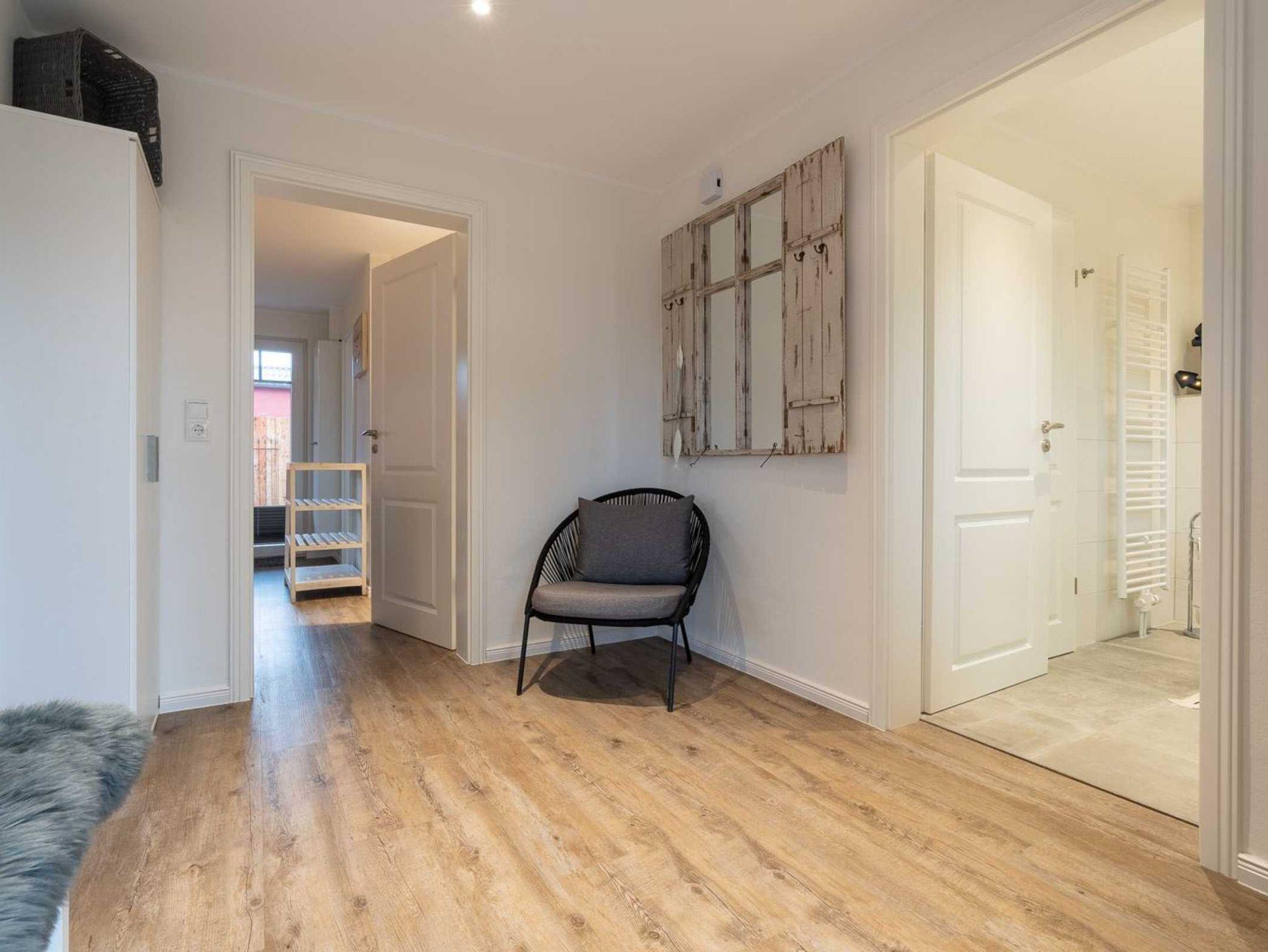Flur mit Garderobe, Schuhbank und Spiegel im Eingangsbereich. Separater Eingang zur Wohnung. Kostenloses Kinderreisebett und Kinderhochstuhl vorhanden. Kostenloses WLAN (Glasfaser).