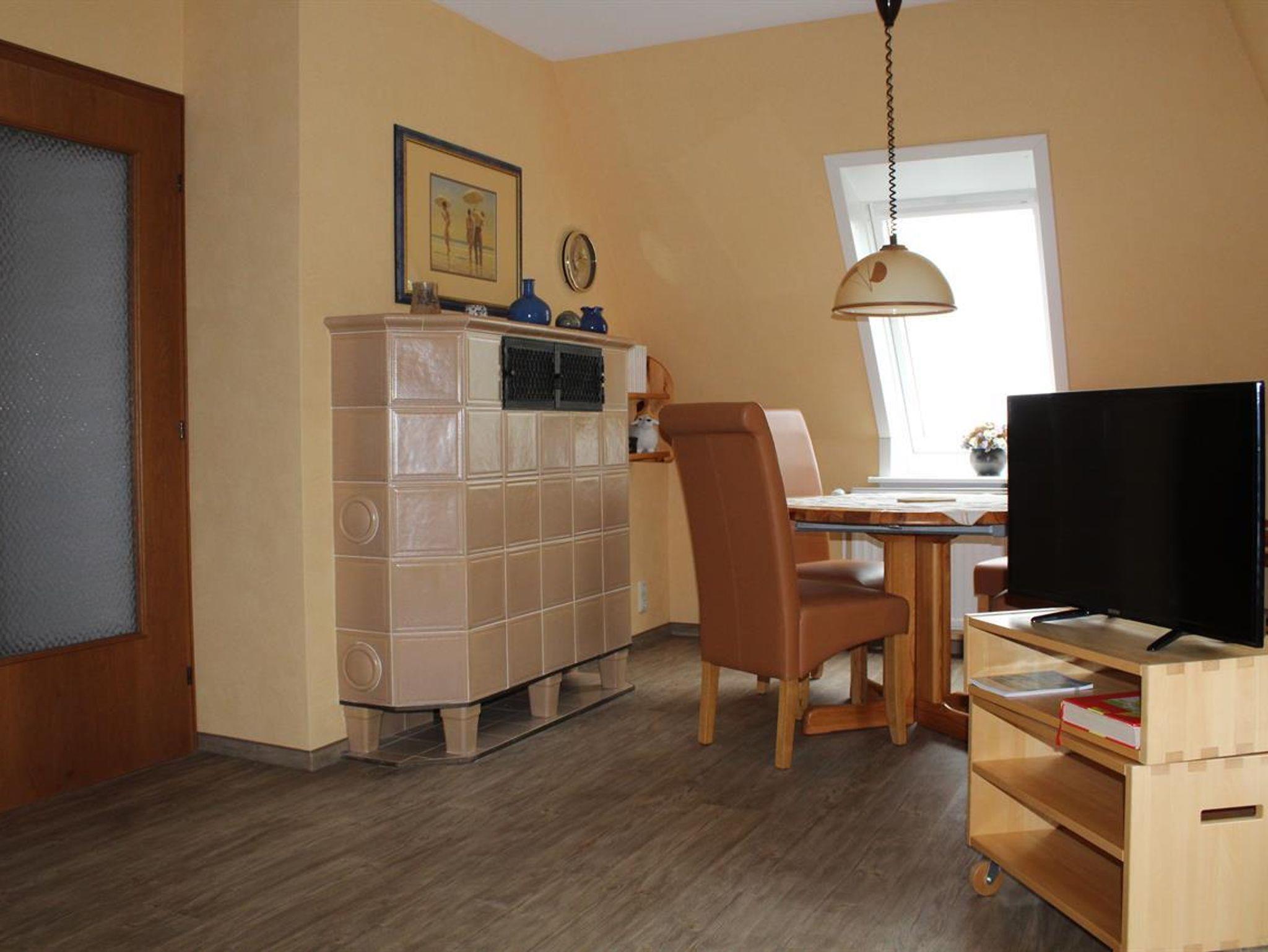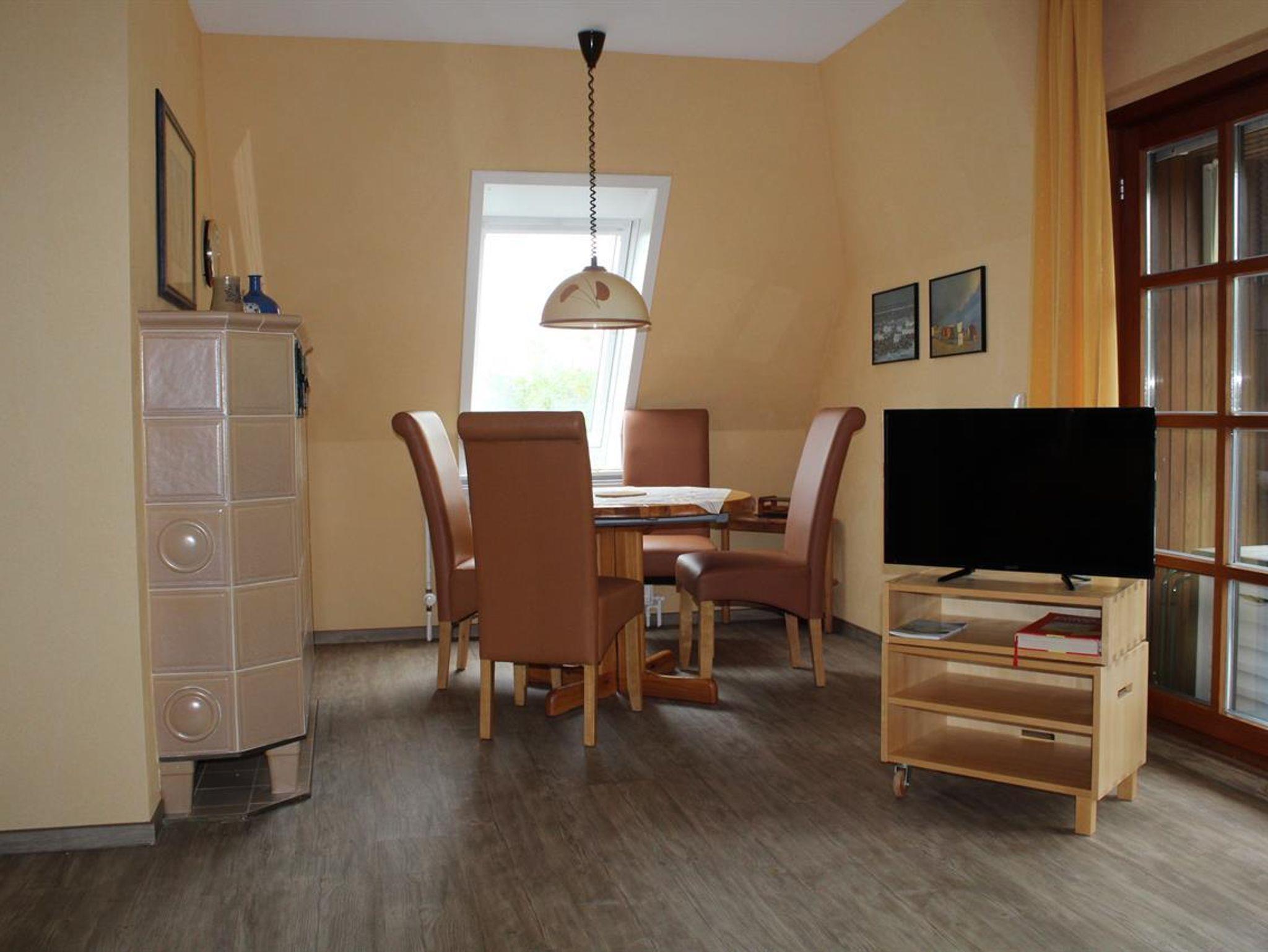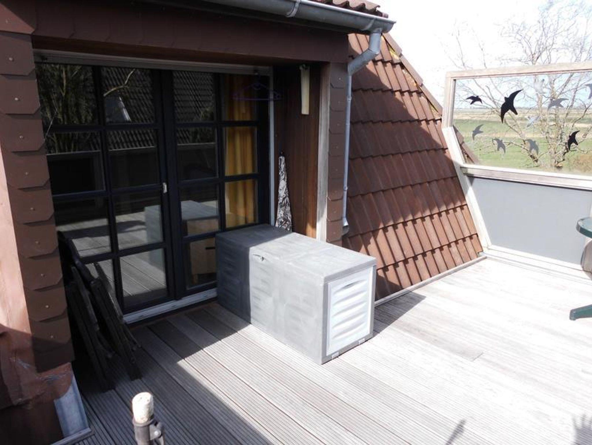 Großzügige, wohnlich gestaltete 61qm-DG-Wohnung mit komplett ausgestatteter Küche mit Essplatz mit Weitblick in die Eiderstedter Landschaft, Wohnzimmer mit extra Lesenische, edel skandinavisch möbliert, davor eine Ost-Süd-West-Dach-Terrasse (12qm) , sonnig vom Frühstück bis Abendbrot. Schlafzimmer mit Doppelbett (180x200), Vollbad mit Dusche, Wanne u. WC. Diele, Garderobe, Nichtraucherhaus, Tiere nicht erlaubt, nicht Allergiker geeignet, Rollläden an allen Fenstern, Fliegengaze am Schlafzimmer-Fenster, Internetanschluss W-LAN.