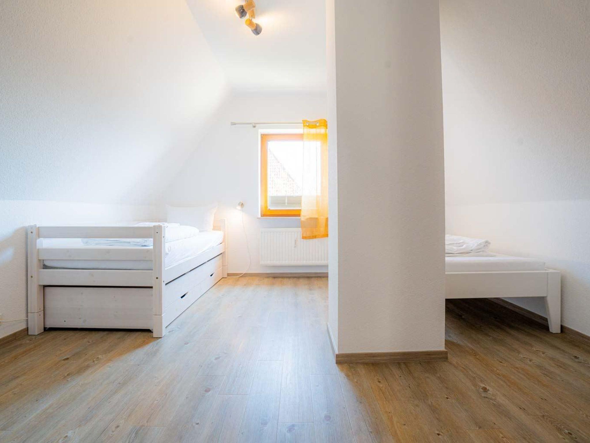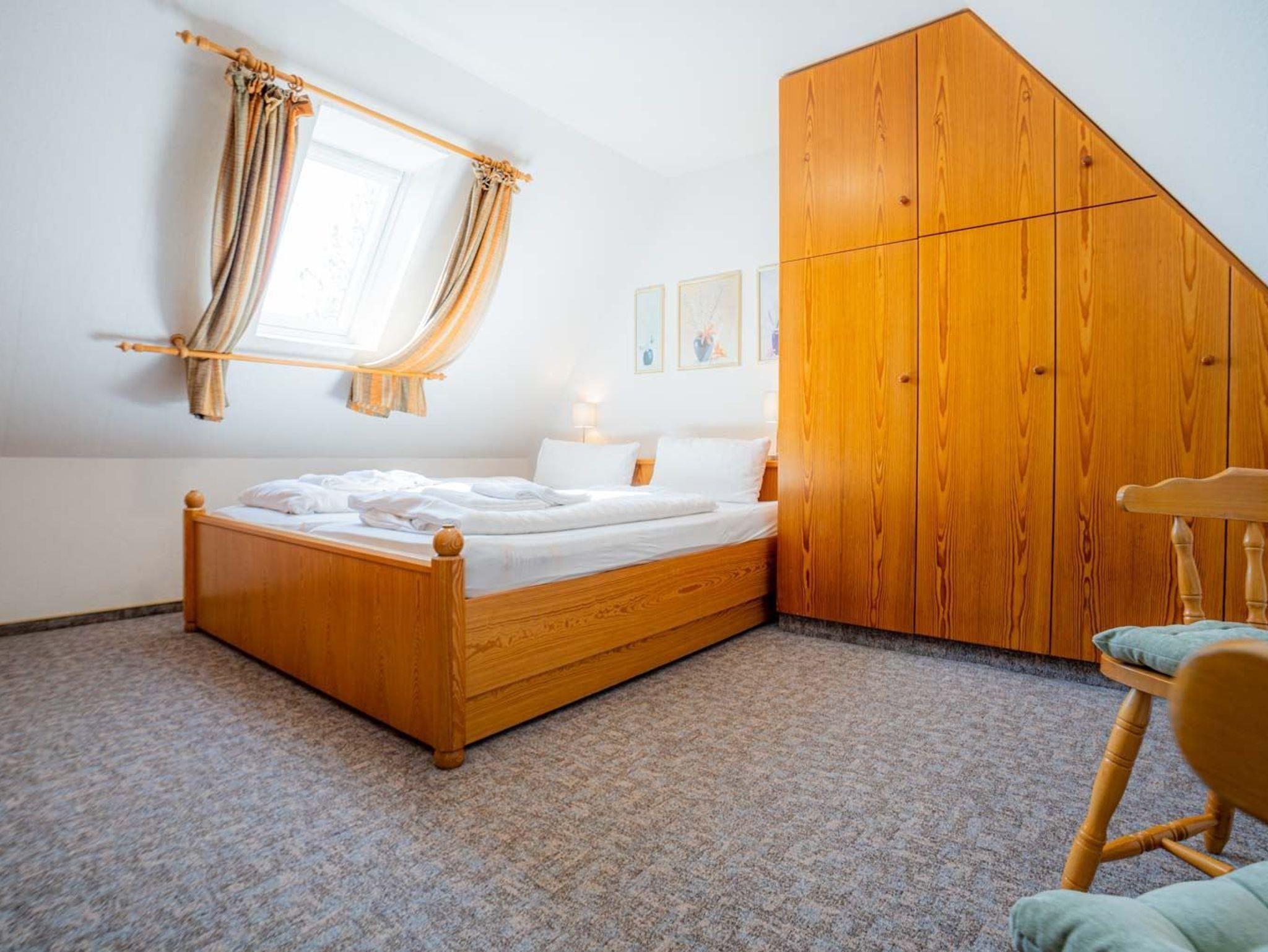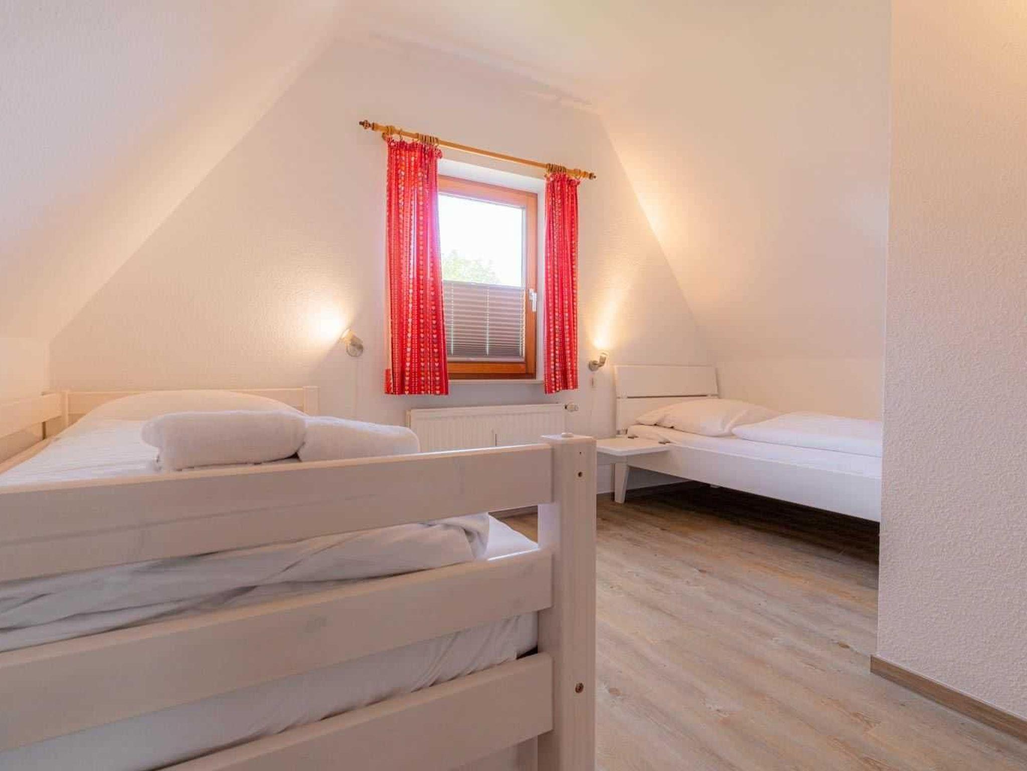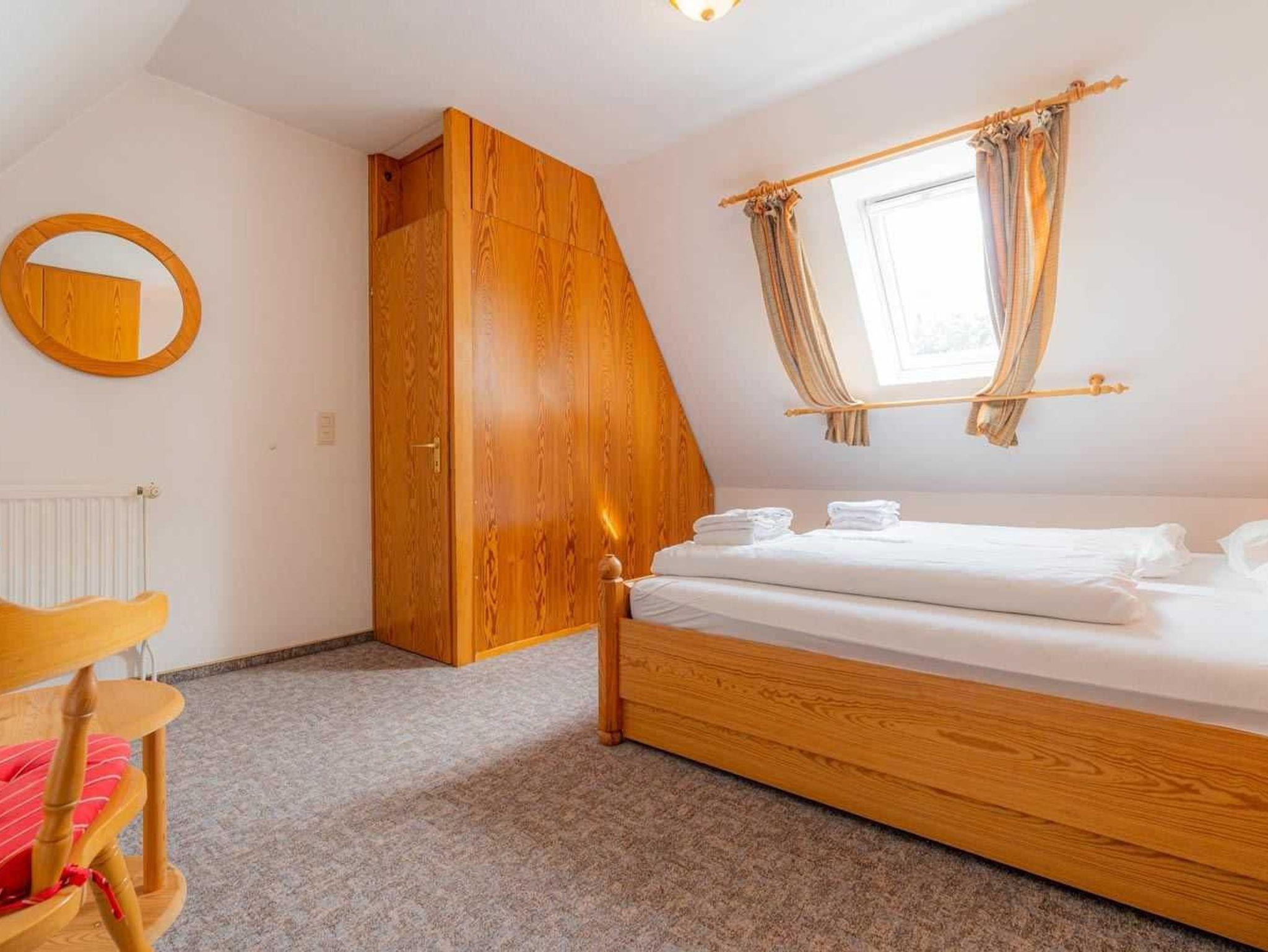1. Schlafzimmer mit 2 Einzelbetten (je 90x200cm, das eine davon ist zu einem Doppelbett ausziehbar), Kleiderschrank, Kommode, Tisch und 2 Stühlen