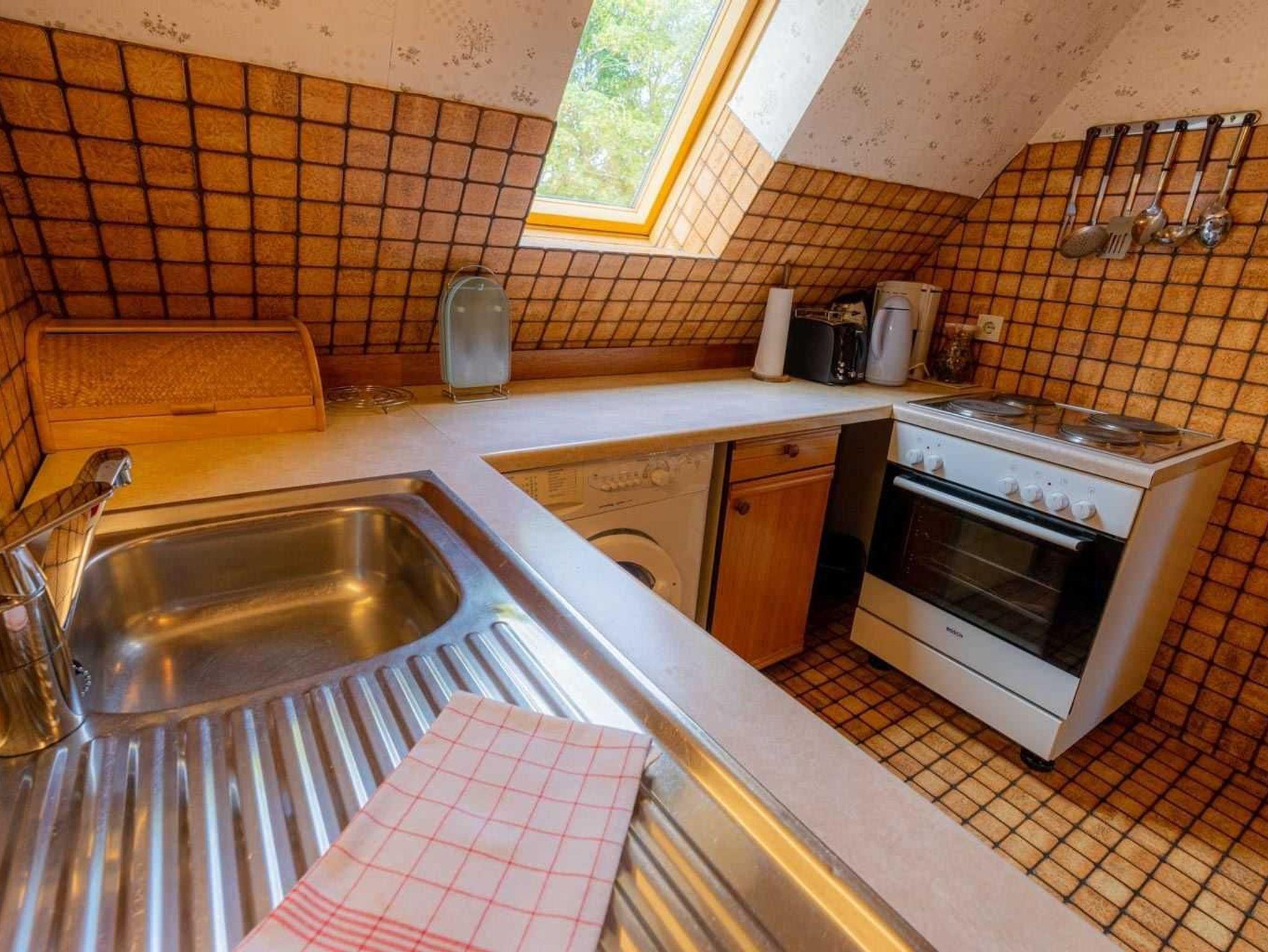 Halboffene Küche mit Backofen, Mikrowelle, Geschirrspüler, Kühlschrank mit Gefrierfach, Radio und Waschmaschine.