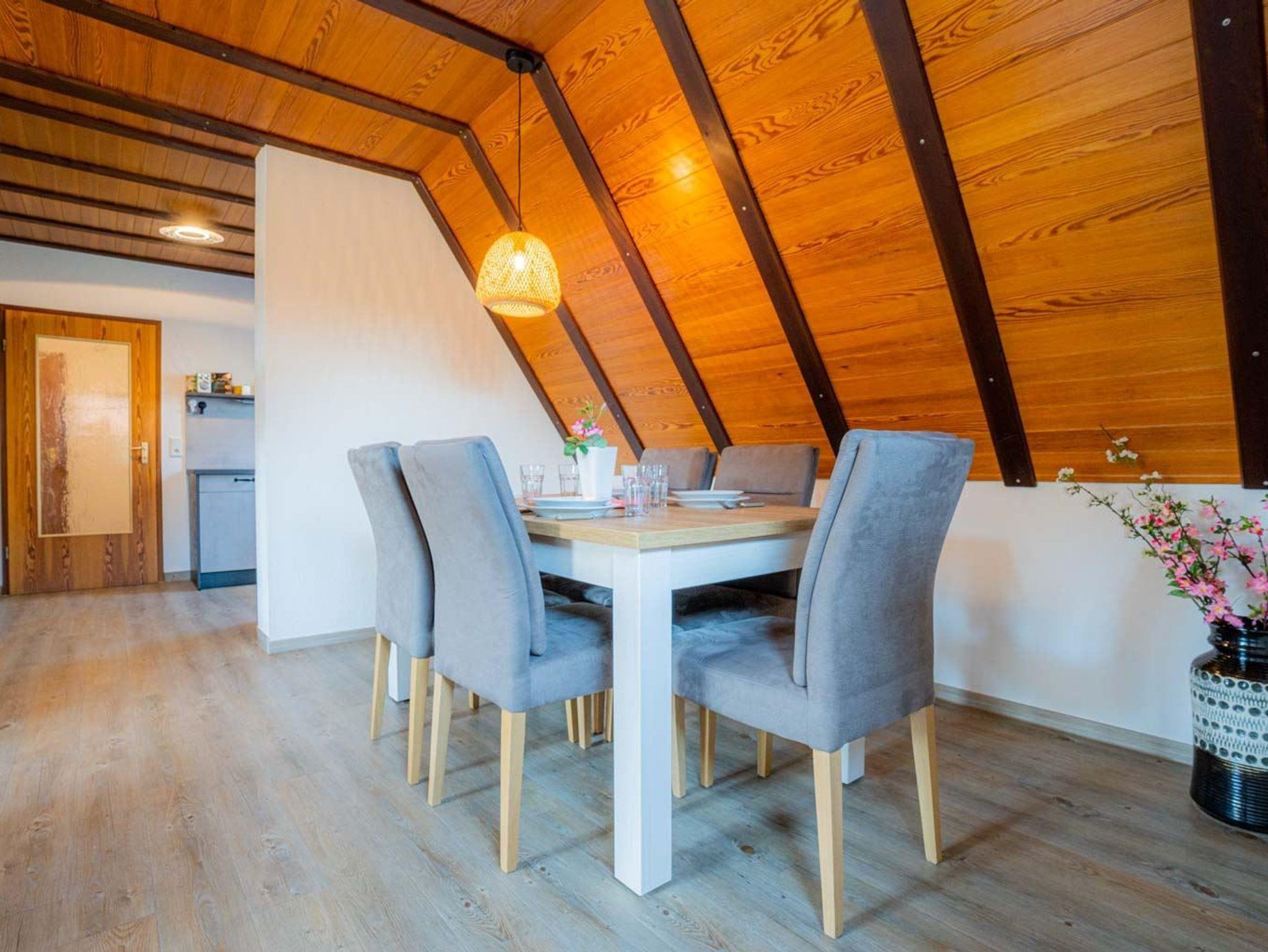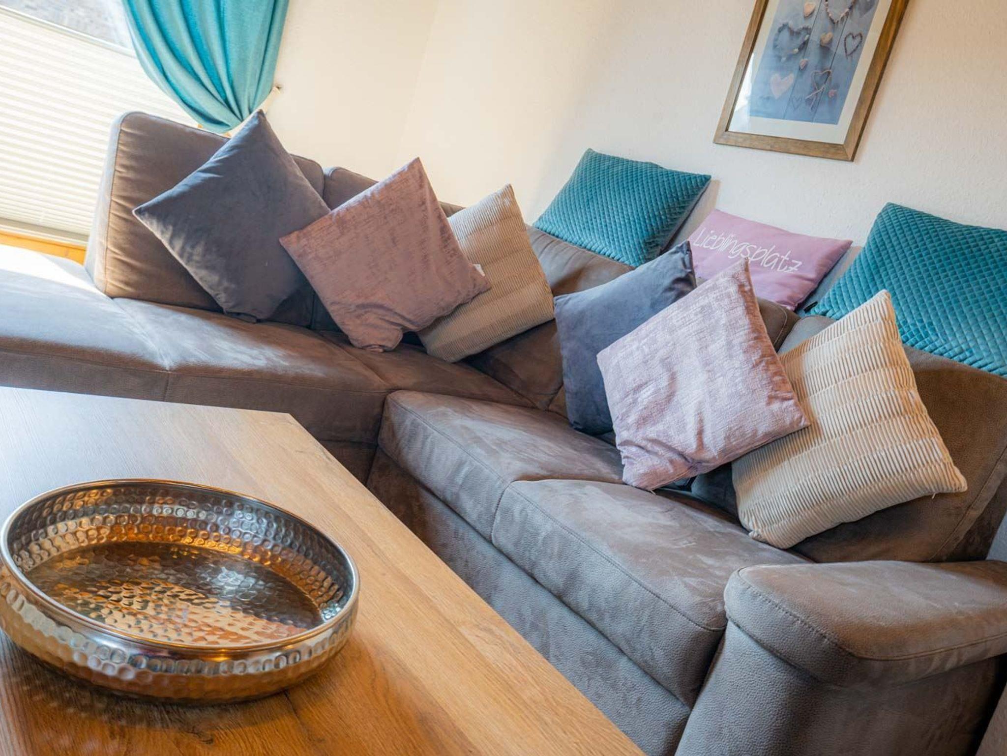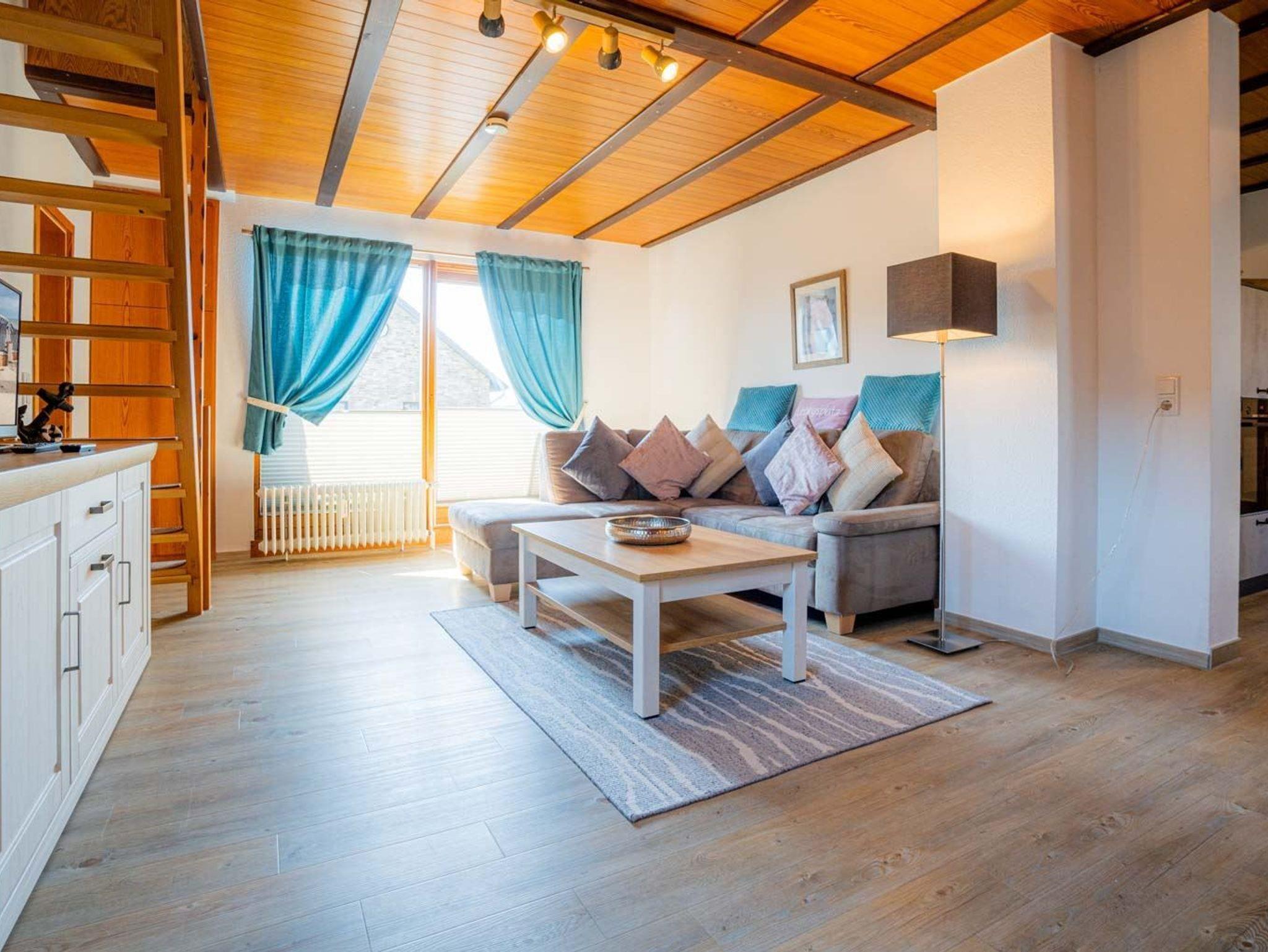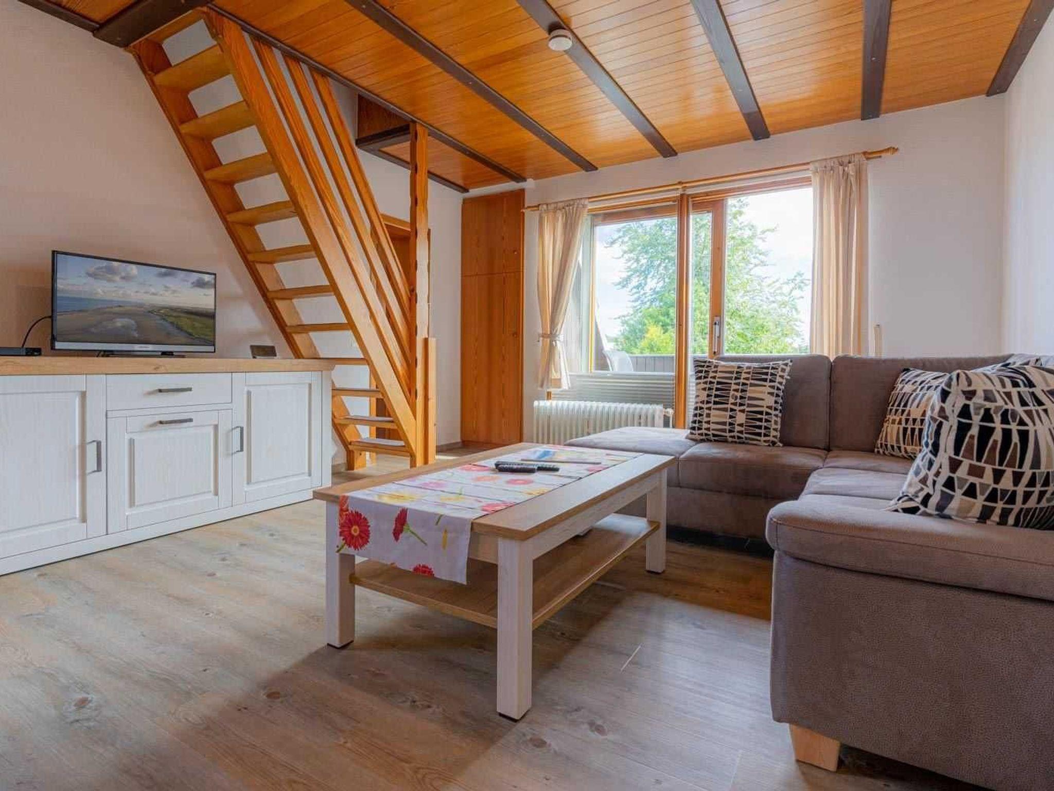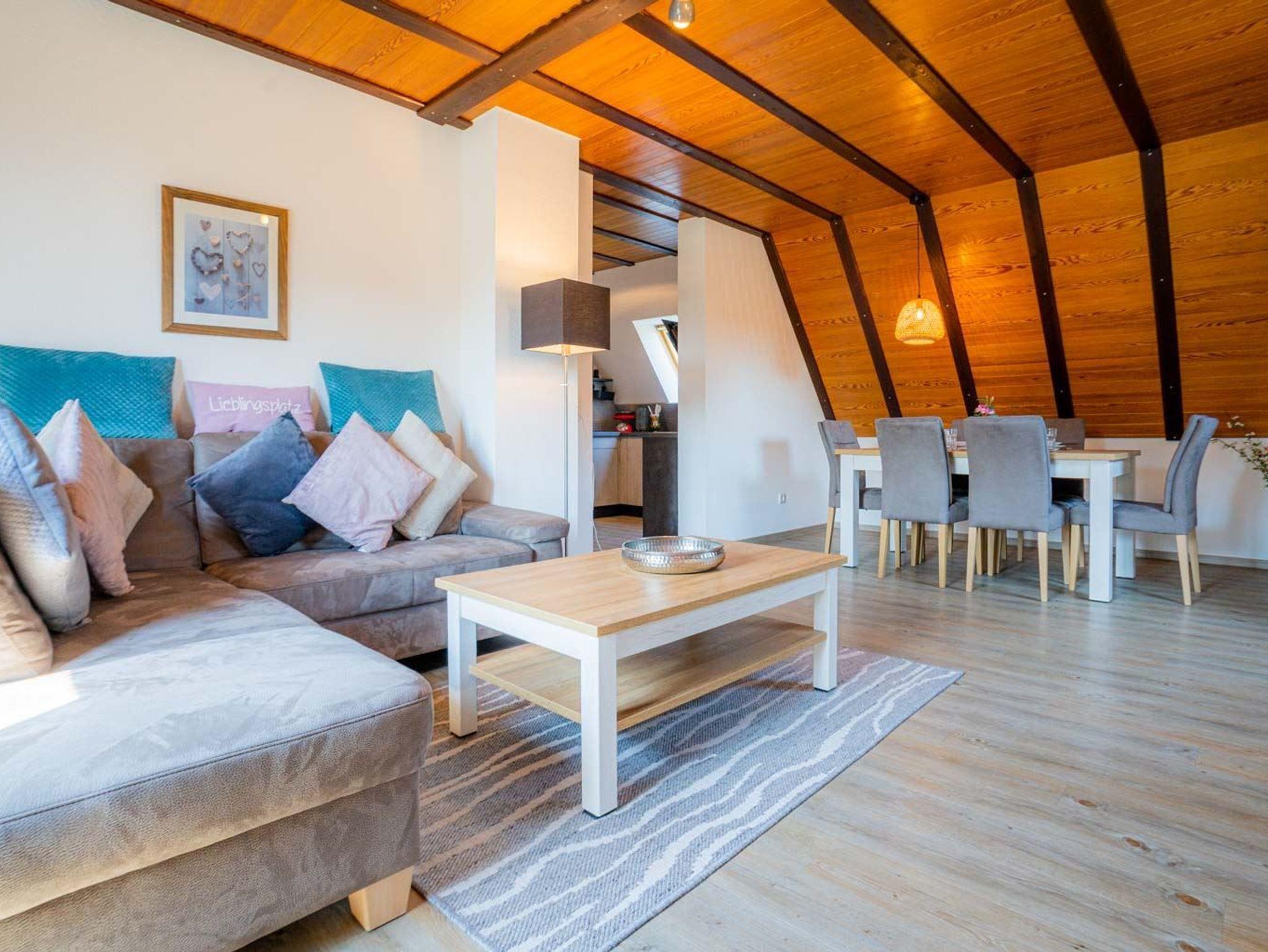 Wohnzimmer mit großem Ecksofa, TV (Sat), Stereo-Kompaktanlage und Esstisch mit 6 Stühlen. Direkter Zugang zum möblierten Balkon nach Süden. Vom Wohnzimmer führt eine steile Treppe zum 2. Schlafzimmer. Abstellkammer mit Staubsauger und Bügelset.