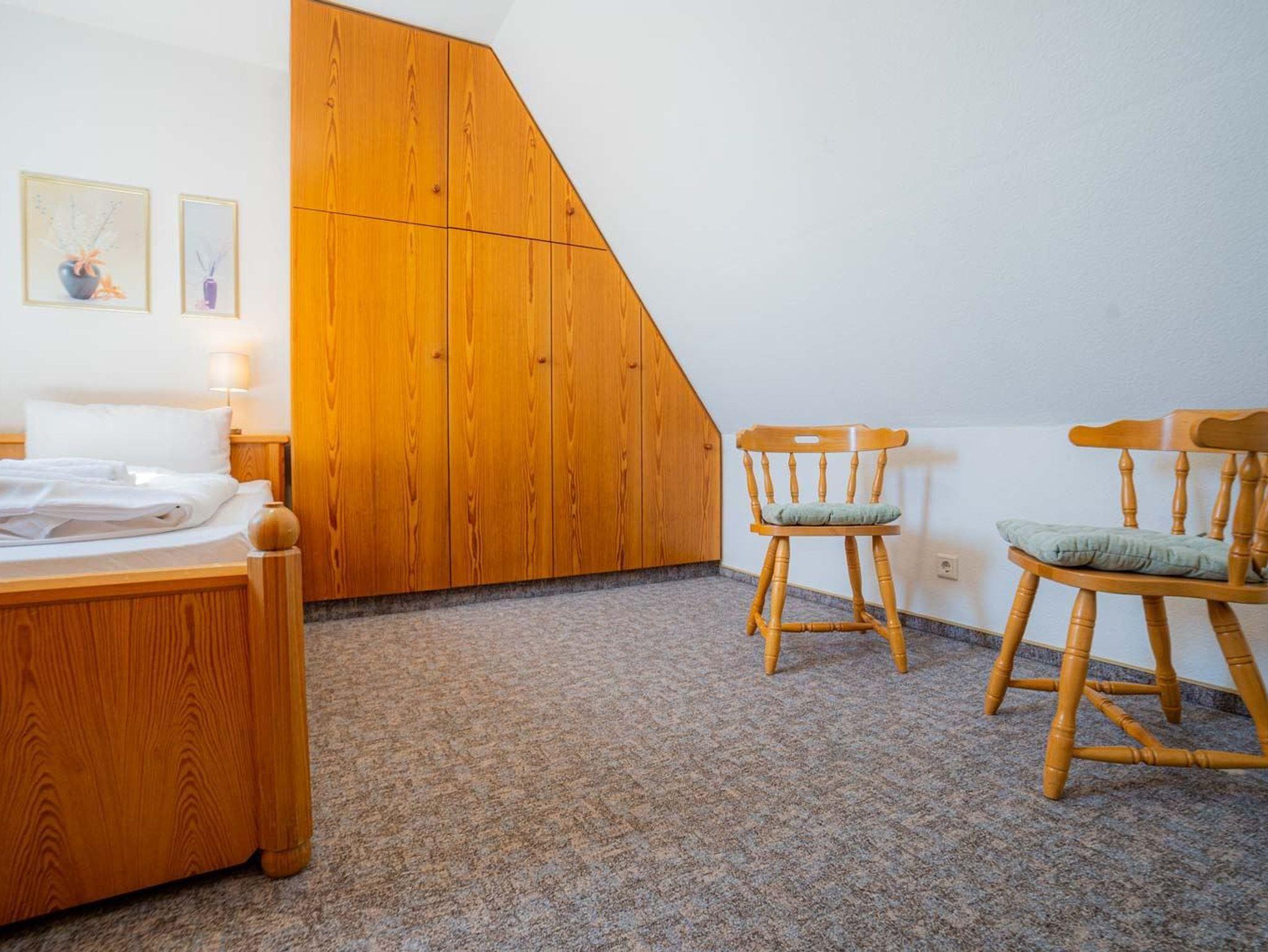 2. Schlafzimmer mit Doppelbett (2x 90x200cm), Einbaukleiderschrank und 3 Stühlen.