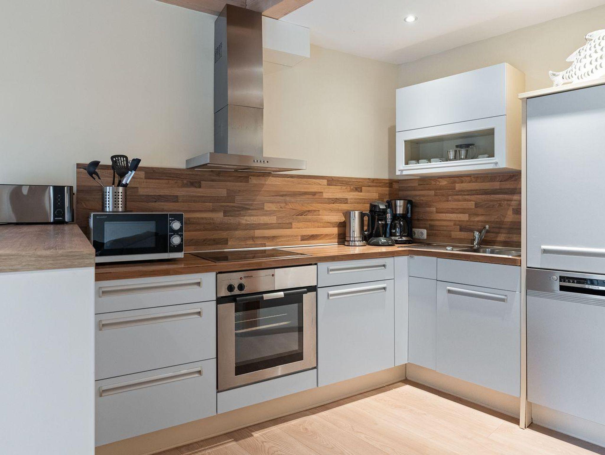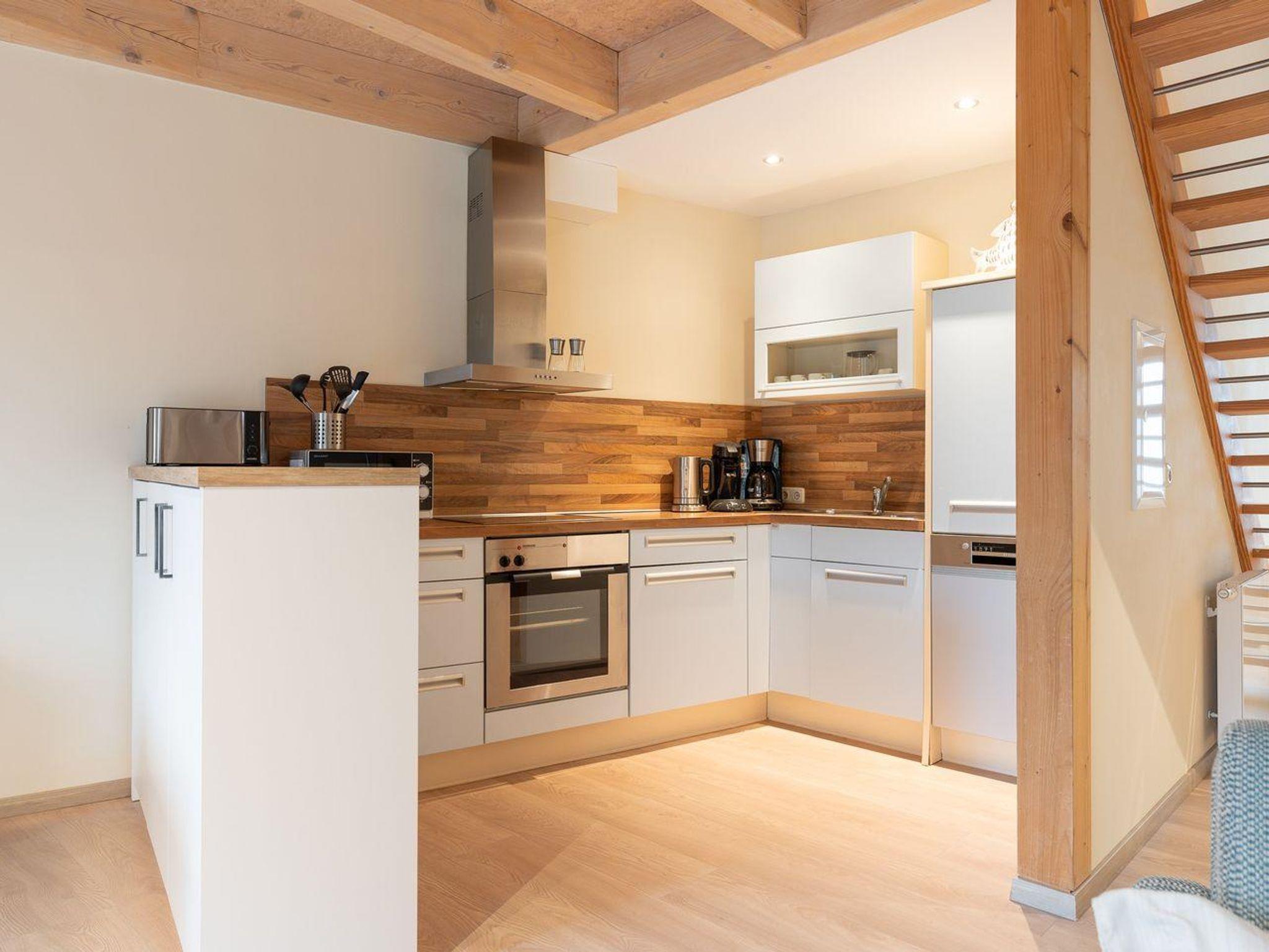 Im Erdgeschoss befindet sich ein großzügiger Wohnraum mit TV und einer modernen Wohnküche. Die Küche verfügt über hochwertige Elektrogeräte, eine Pad-Kaffeemaschine und eine Filter- Kaffeemaschine.