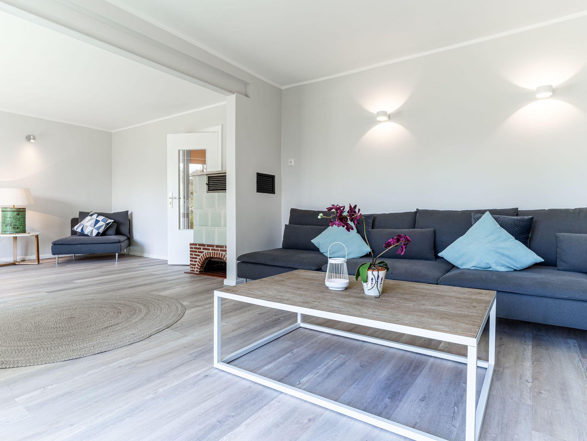 Im großem Wohnzimmer befindet sich ein Kaminofen. Die bodentiefen Fenster gewähren einen wunderschönen Blick auf die große Düne.