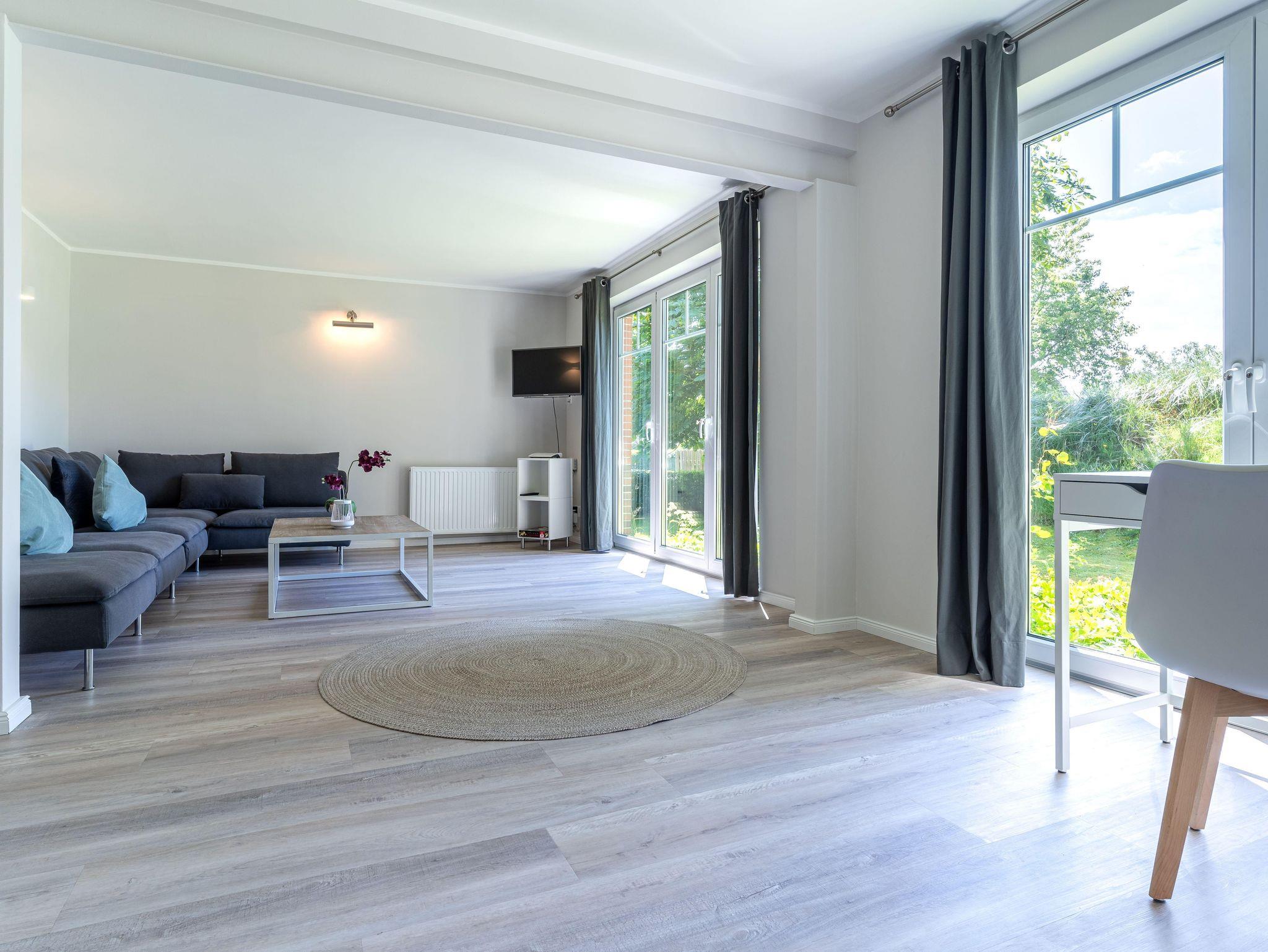 Unsere Wohnung Annika ist unsere größte Wohnung. Mit Küche, Esszimmer, drei Schlafzimmern, Bad, großem Wohnzimmer mit Homeoffice Arbeitsplatz und einem großen Garten ist sie ideal für große Familien.
