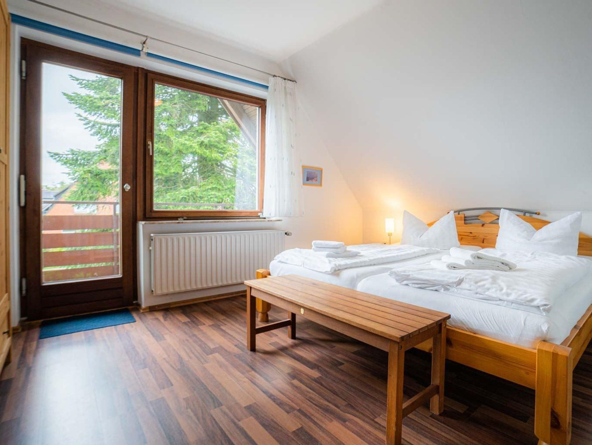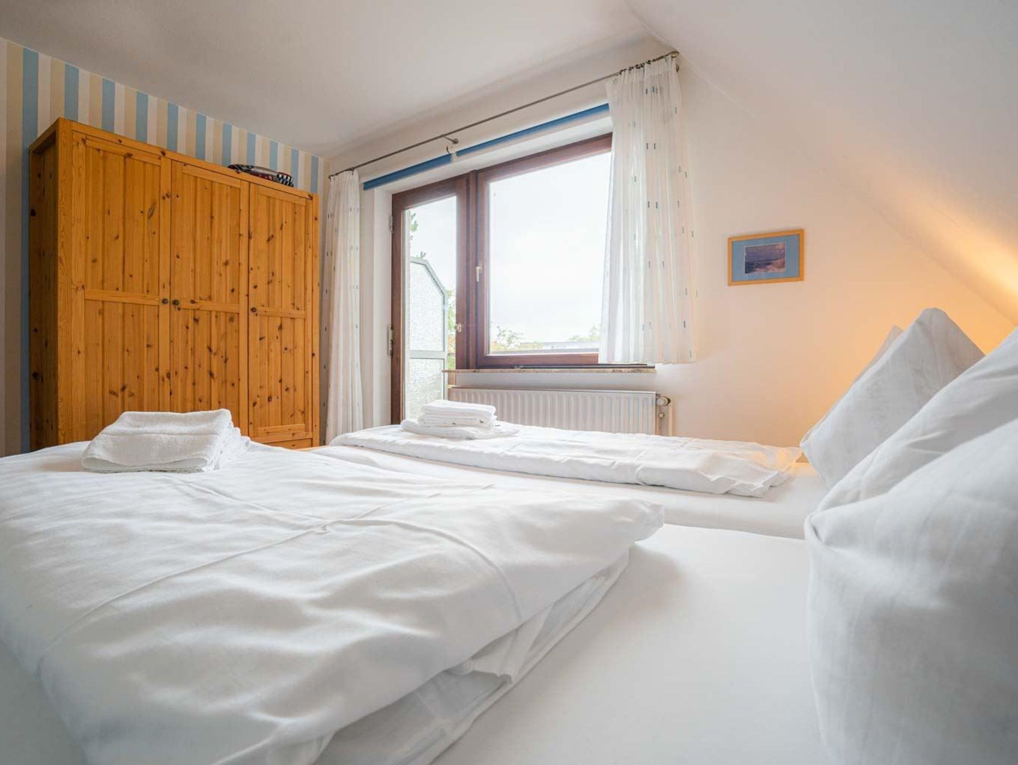 Schlafzimmer mit Doppelbett (2x 90x200cm) und Kleiderschrank. Direkter Zugang zum möblierten Balkon nach Nordosten.