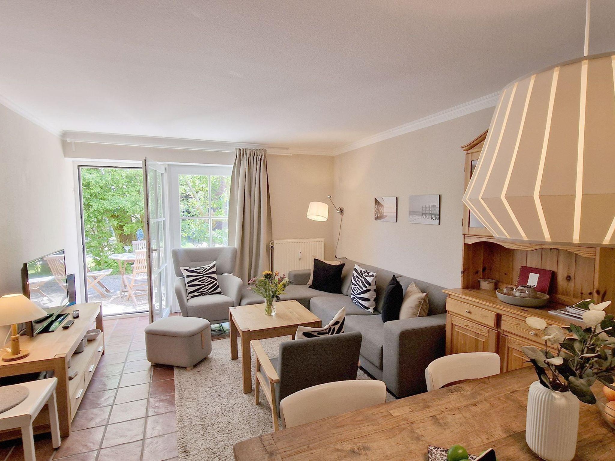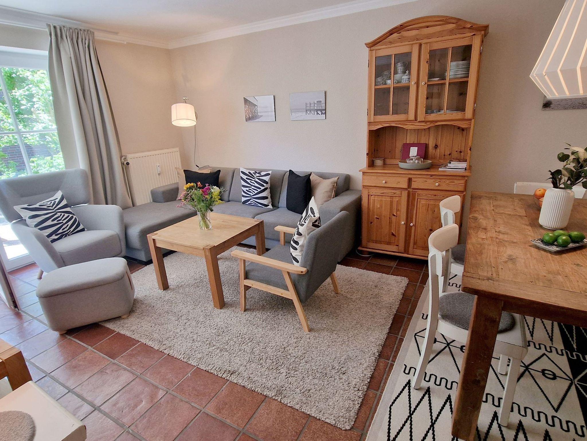 Stilvoll wohnen hinterm Seedeich Passend zu seinem Namen liegt das Haus Achtern Diek direkt hinterm Seedeich und in unmittelbarer Nähe zum Strandweg im Ortsteil Ording. Auf dem Gelände befinden sich ein Abstellraum für Fahrräder und jeweils ein zur Ferienwohnung gehöriger Pkw-Stellplatz. Eine Waschmaschine und ein Trockner können von der Gemeinschaft genutzt werden. In der stilvollen 3-Zimmer-Nichtraucherwohnung Achtern Diek Nr. 02 haben bis zu 5 Gäste ausreichend Platz um einen erholsamen Urlaub zu verbringen. Auf der halb überdachten Terrasse in Süd-Westlage können Sie im Strandkorb den Tag verbummeln. Das in der modernen Küchenzeile mit Cerankochfeld und Backofen zubereitete Essen schmeckt in der schönen Essecke besonders gut. Die Spülmaschine hilft danach beim Abwasch. Das moderne Bad ist mit einem schicken Waschtisch ausgestattet. Pkw-Stellplatz auf dem Grundstück, Nr. 2