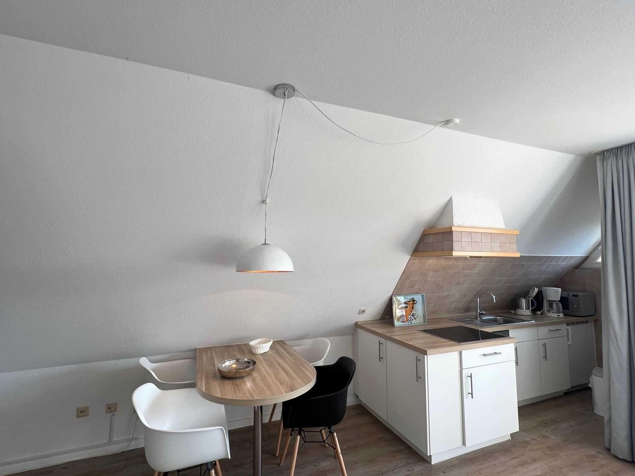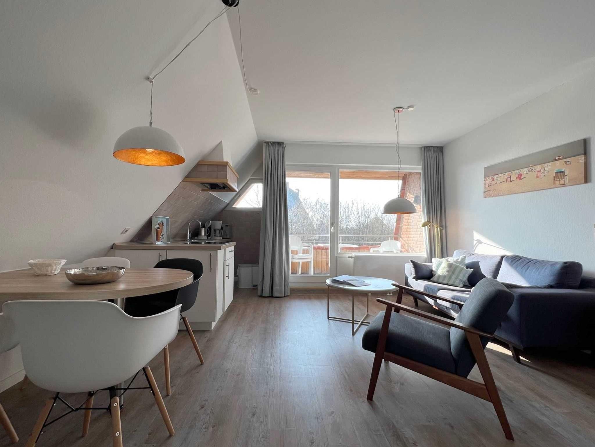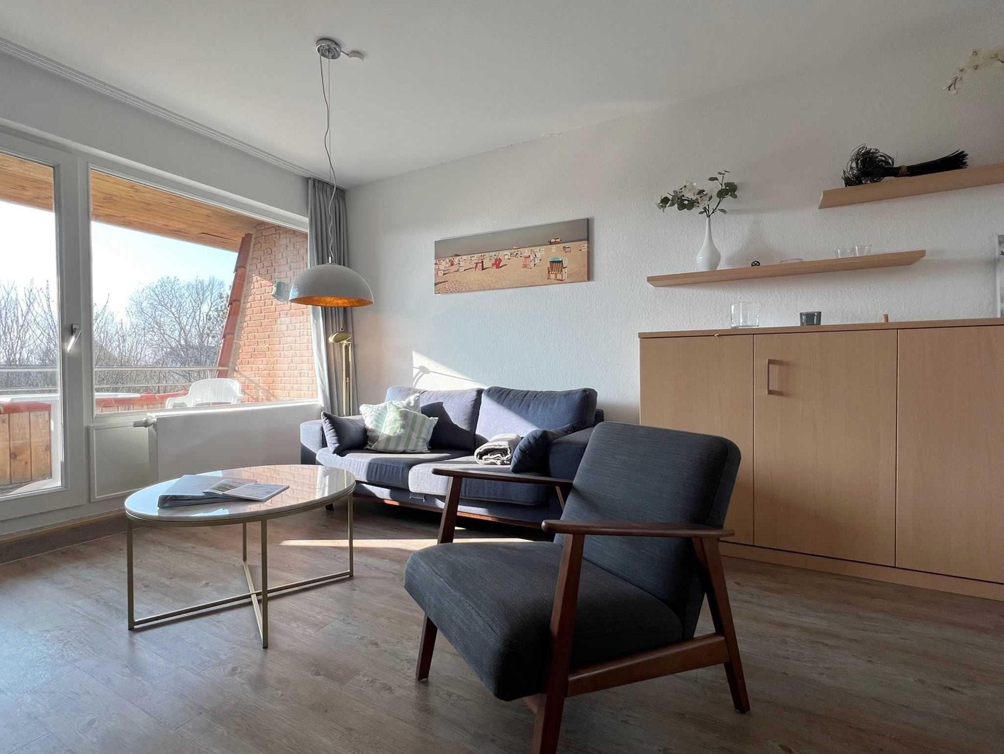 Sie teilt sich wie folgt auf: Eingangsdiele mit Garderobe, Schlafzimmer mit 2 Einzelbetten, Duschbad mit WC. Der großzügige Wohnraum mit direktem Zugang zur Loggia überzeugt mit seiner gemütlichen Sitzecke, der modernen weißen Küche, der Essecke und als weitere Schlafmöglichkeit 1 Schrankbett,