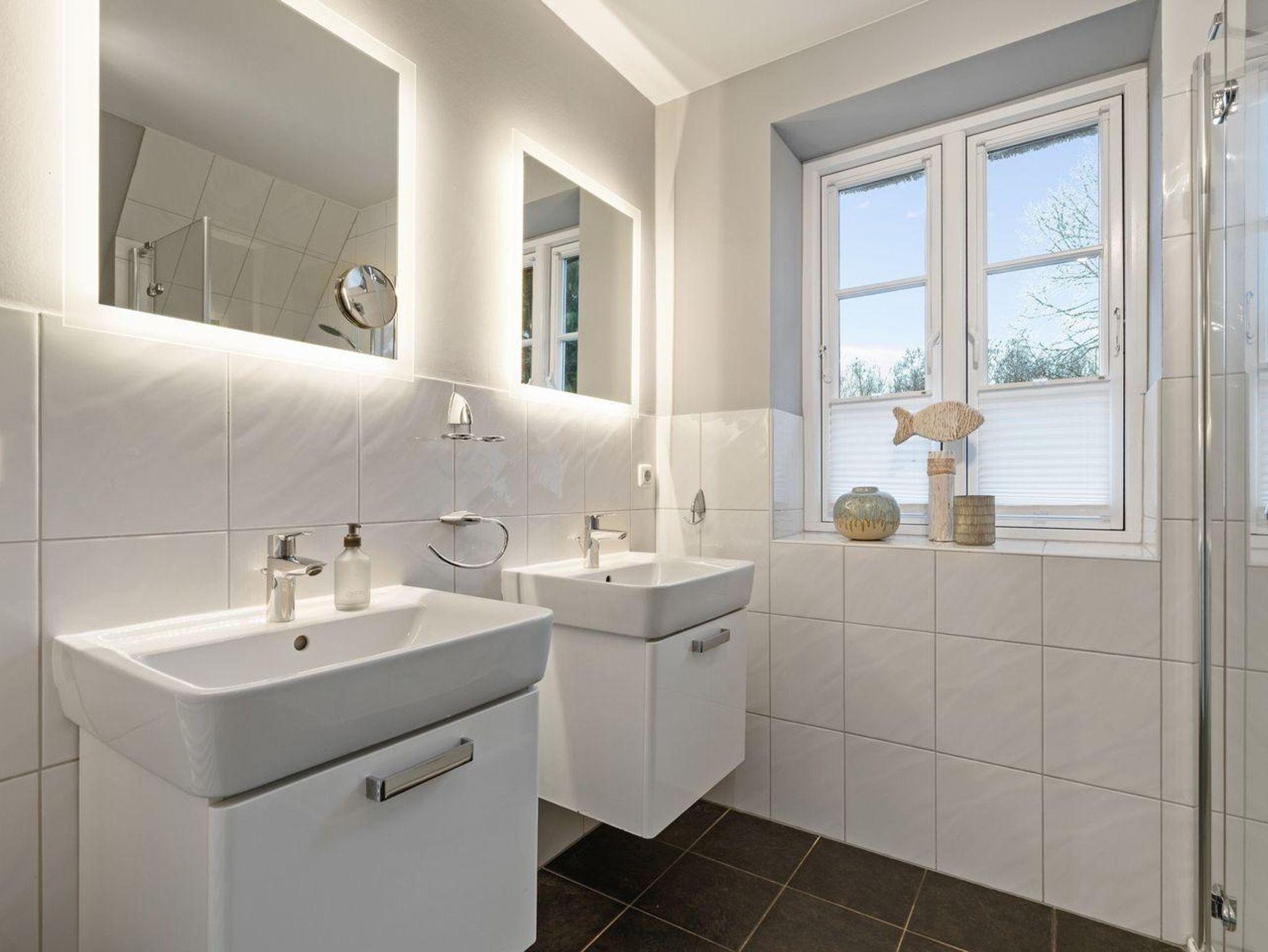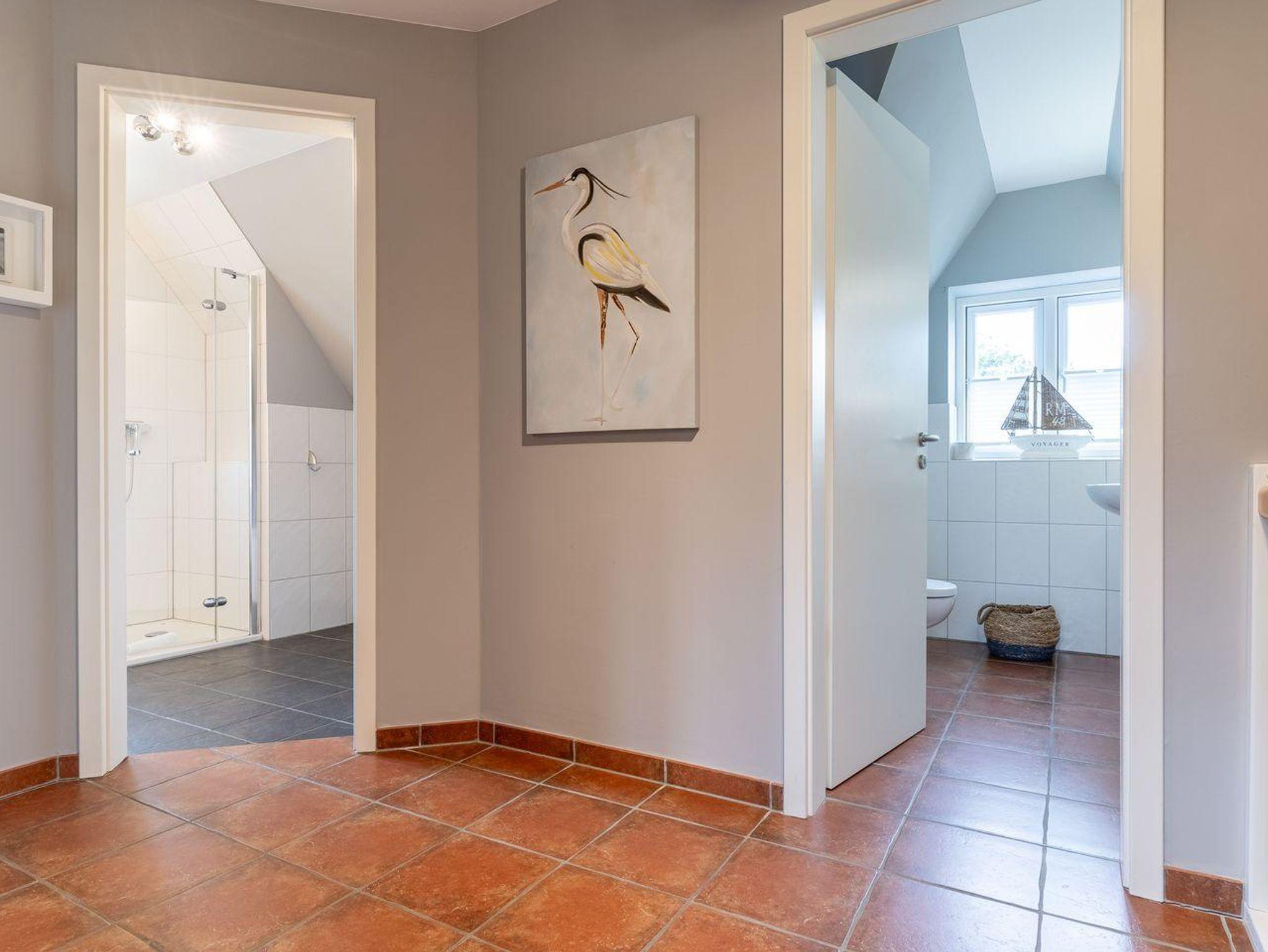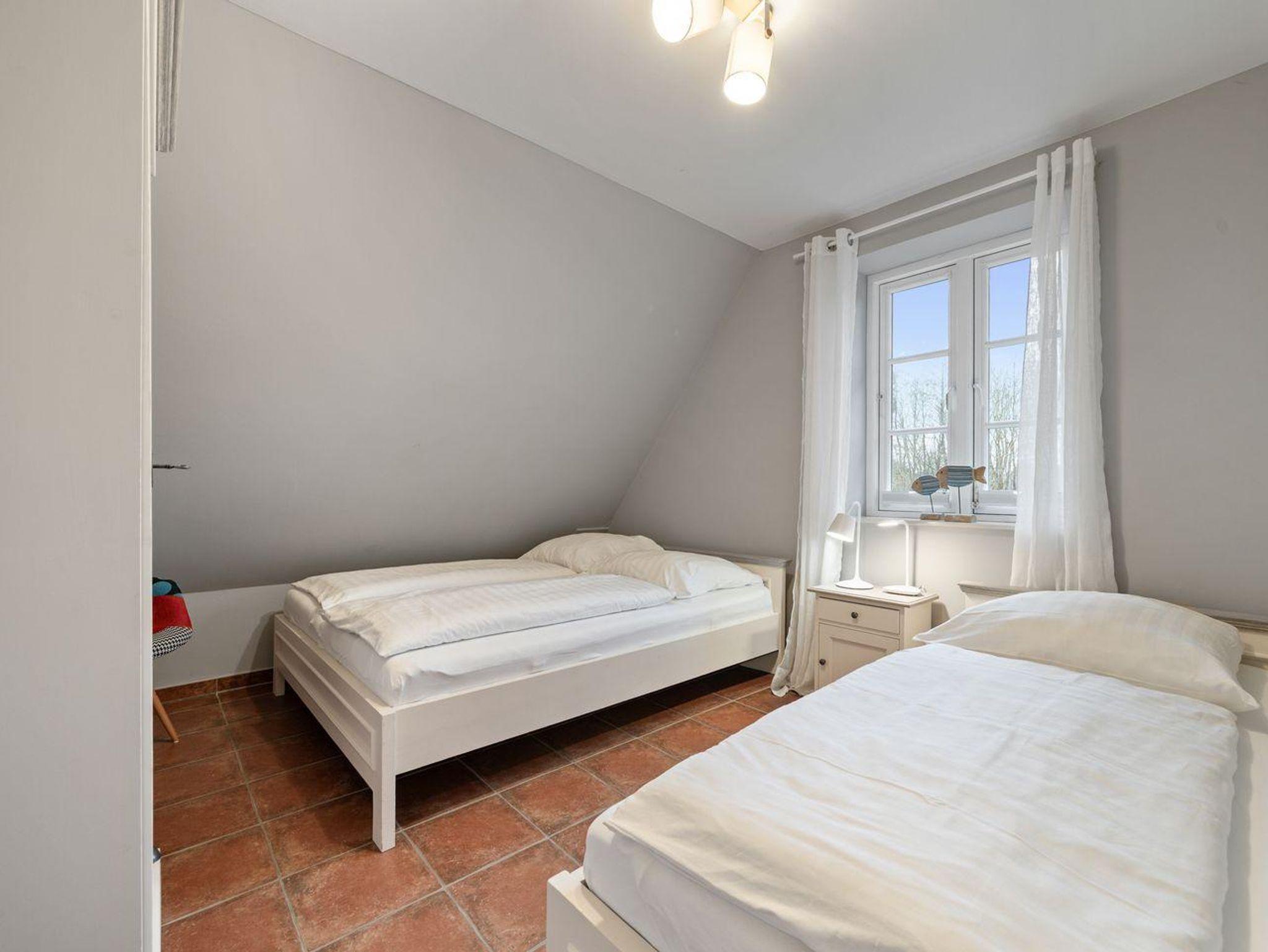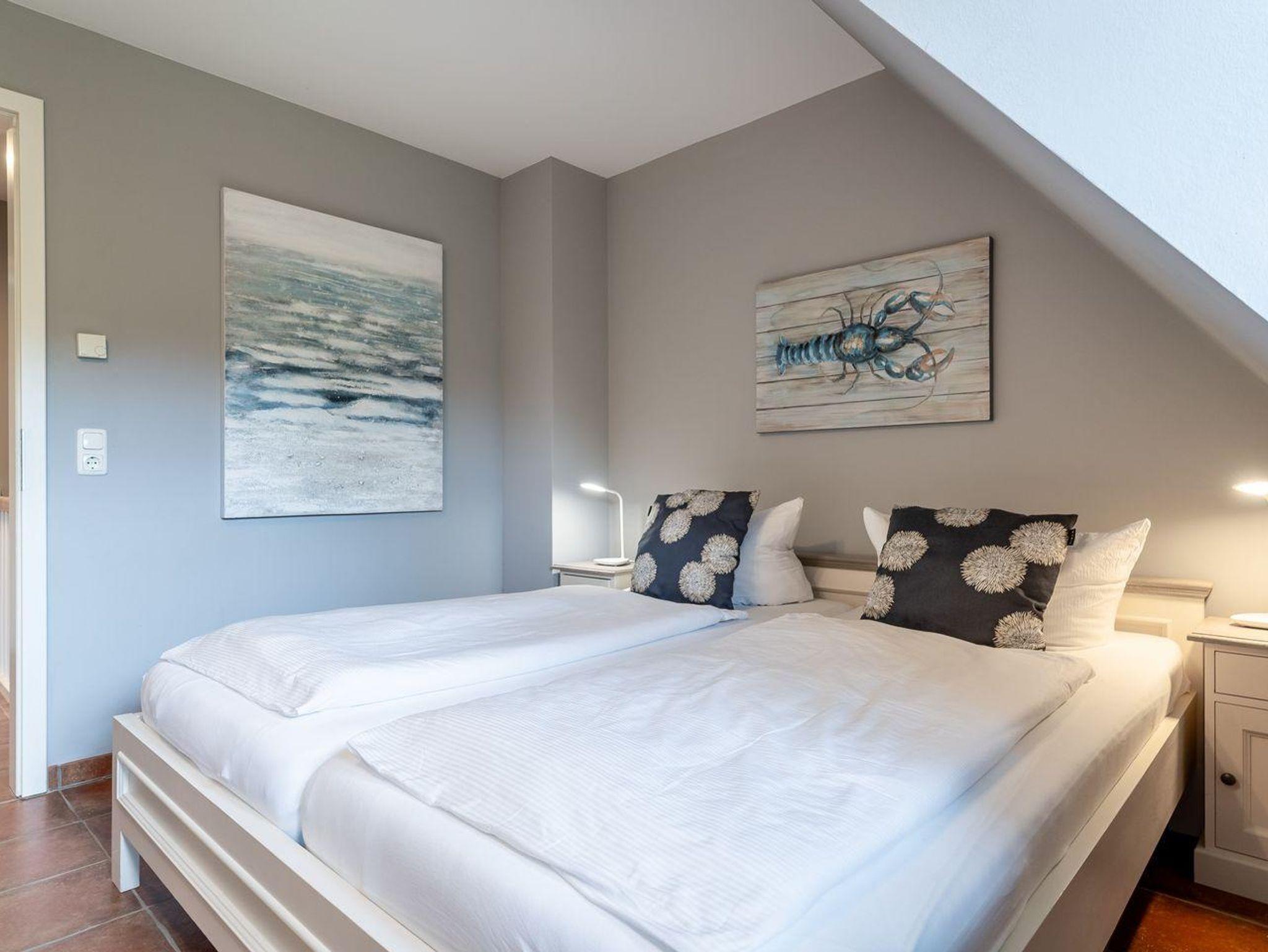 Im Erdgeschoss befindet sich der wunderschöne Wohnraum mit einem gemütlichen Essbereich und Zugang zu 2 Terrassen. Die offene Wohnküche ist mit allen wichtigen Geräten voll ausgestattet und lädt zum gemeinsamen Kochen ein. Ebenso ist im Erdgeschoss ein geräumiger Flur und ein Gäste WC. Im Obergeschoss befinden sich zwei Schlafzimmer. Eines mit einem Doppelbett und großem Kleiderschrank und ein weiteres mit 3 Schlafplätzen, einem Doppelbett und einem Einzelbett. Außerdem ist im Obergeschoss ein geräumiges Vollbad mit Eckbadewanne. Zusätzlicher Luxus im Obergeschoss ist ein weiteres Gäste-WC.