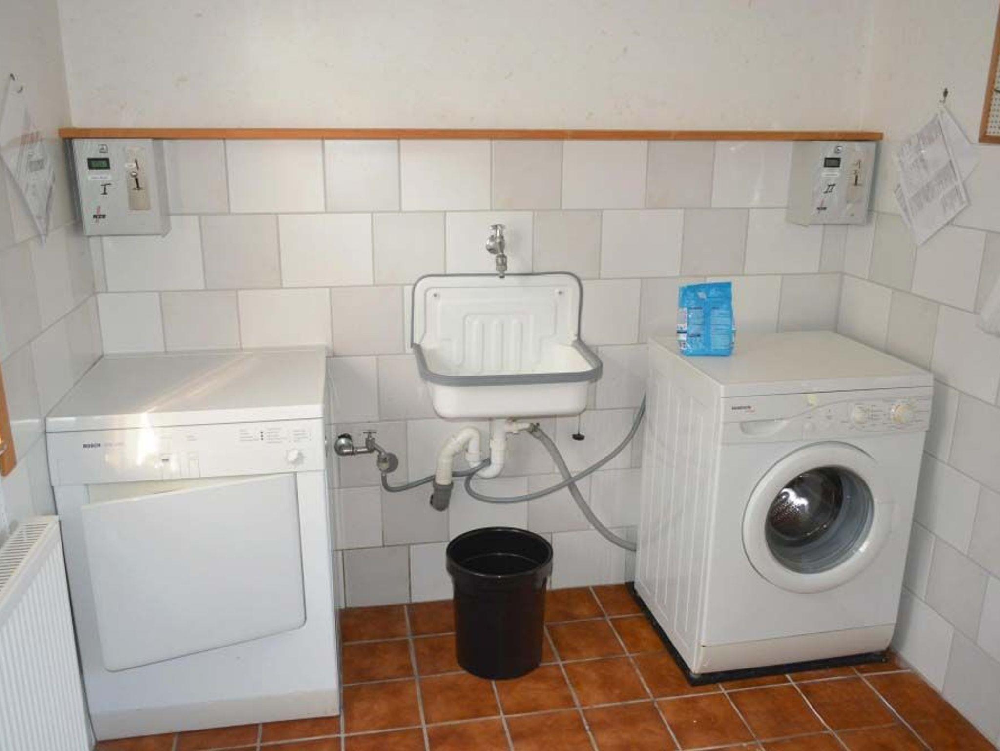 Waschraum: Bügelbrett, Bügeleisen, Regal, Wäscheständer, Waschmaschine und Trockner im Hauswirtschaftsraum gegen eine Gebühr