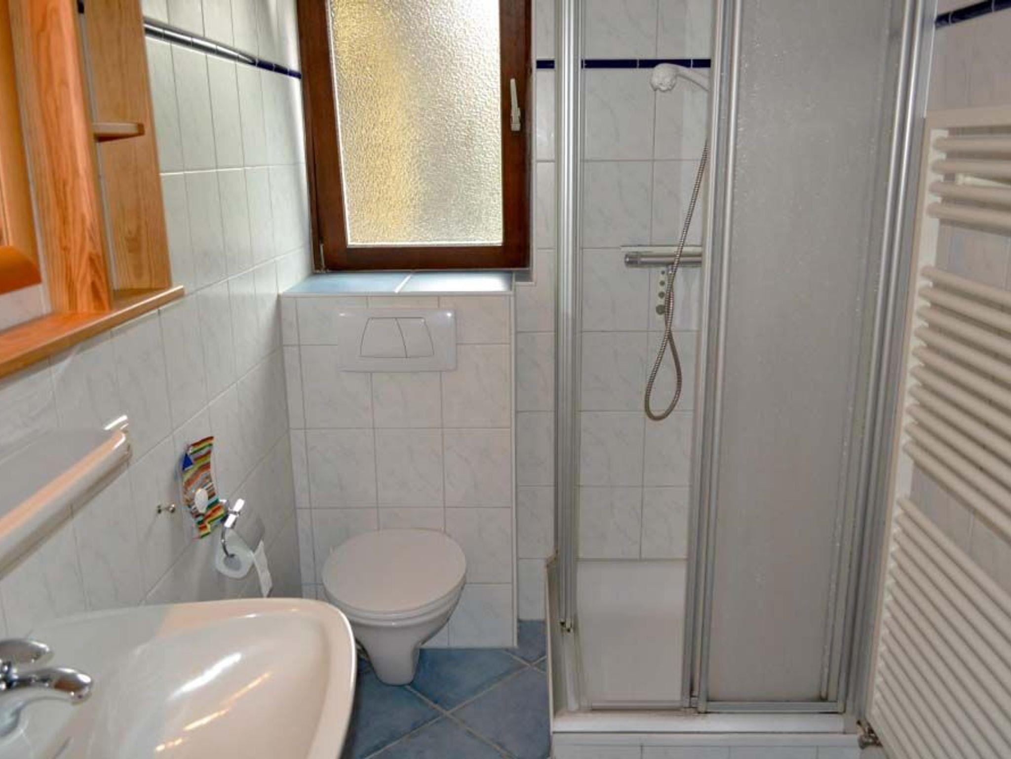 Bad 2: Dusche, Duschkabine, Eckregal, Handtuchheizkörper, Spiegel, Waschbecken, WC