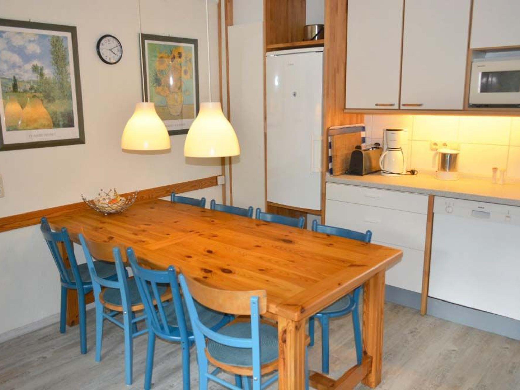 Küche: 4 Plattenherd mit Ceranfeld und Backofen, 8 Stühle, Einbauküche, Esstisch, Geschirr, Handmixer, Kaffeemaschine, Kochtöpfe, Kühlschrank, Mikrowelle, Spülmaschine, Staubsauger, Toaster, Wasserkocher