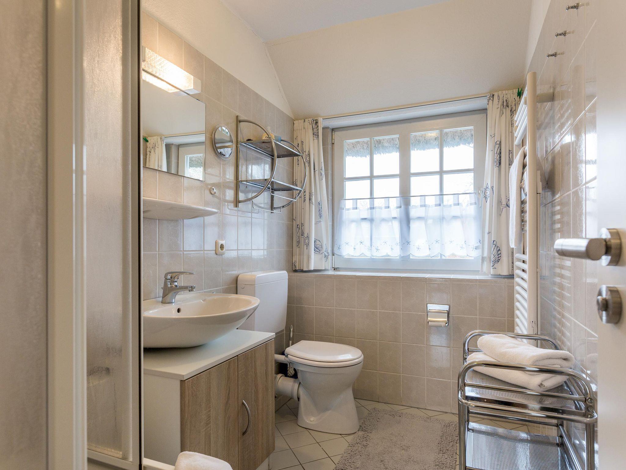 Badezimmer (Duschbad) mit Dusche, WC, Handtuchwärmer, Tageslicht und Föhn.