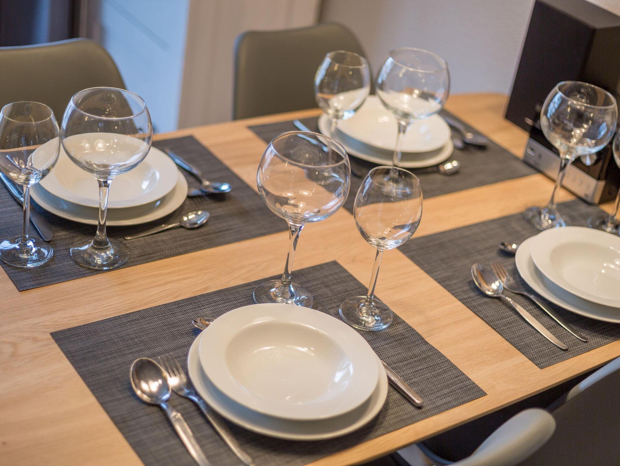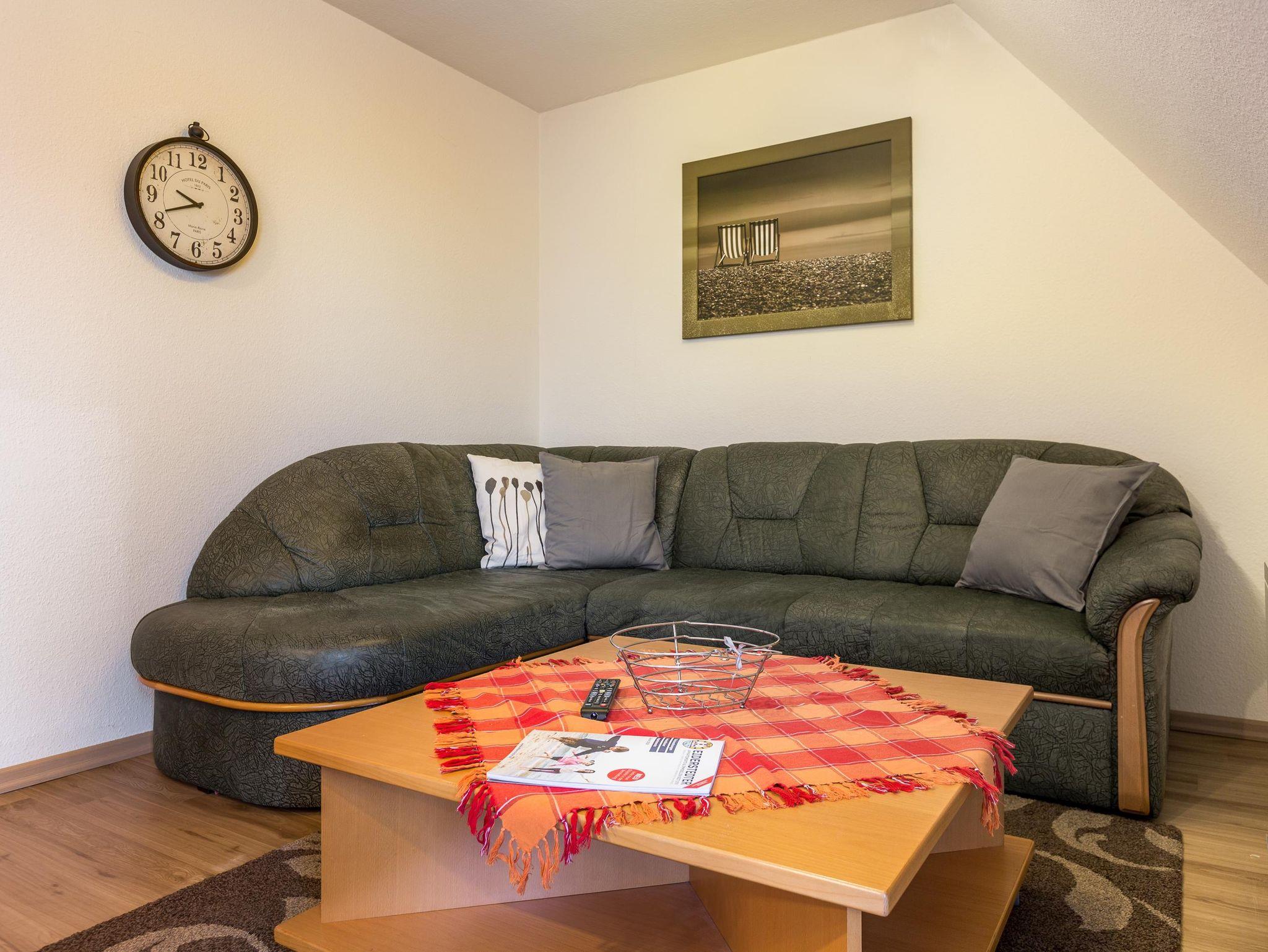 Wohnzimmer mit großem Ecksofa, TV (Kabel), Internet-Radio mit USB-Anschluss und Esstisch mit 5 Stühlen. Direkter Zugang zum möblierten Balkon nach Westen. Halboffene Küche mit Mikrowelle, Kühlschrank mit Gefrierfach, Geschirrspüler und Philips Senseo Switch Kapsel-Kaffeemaschine.