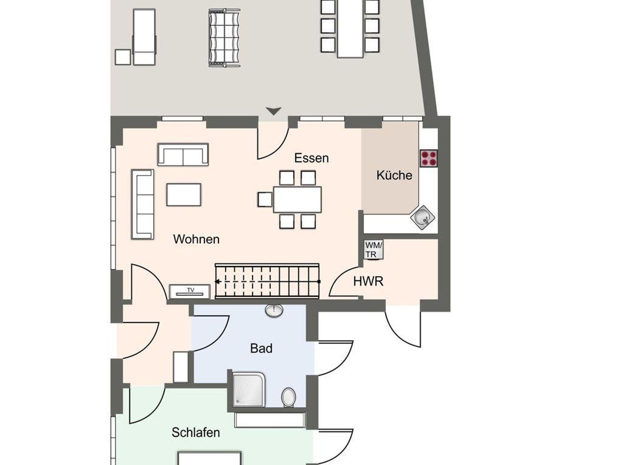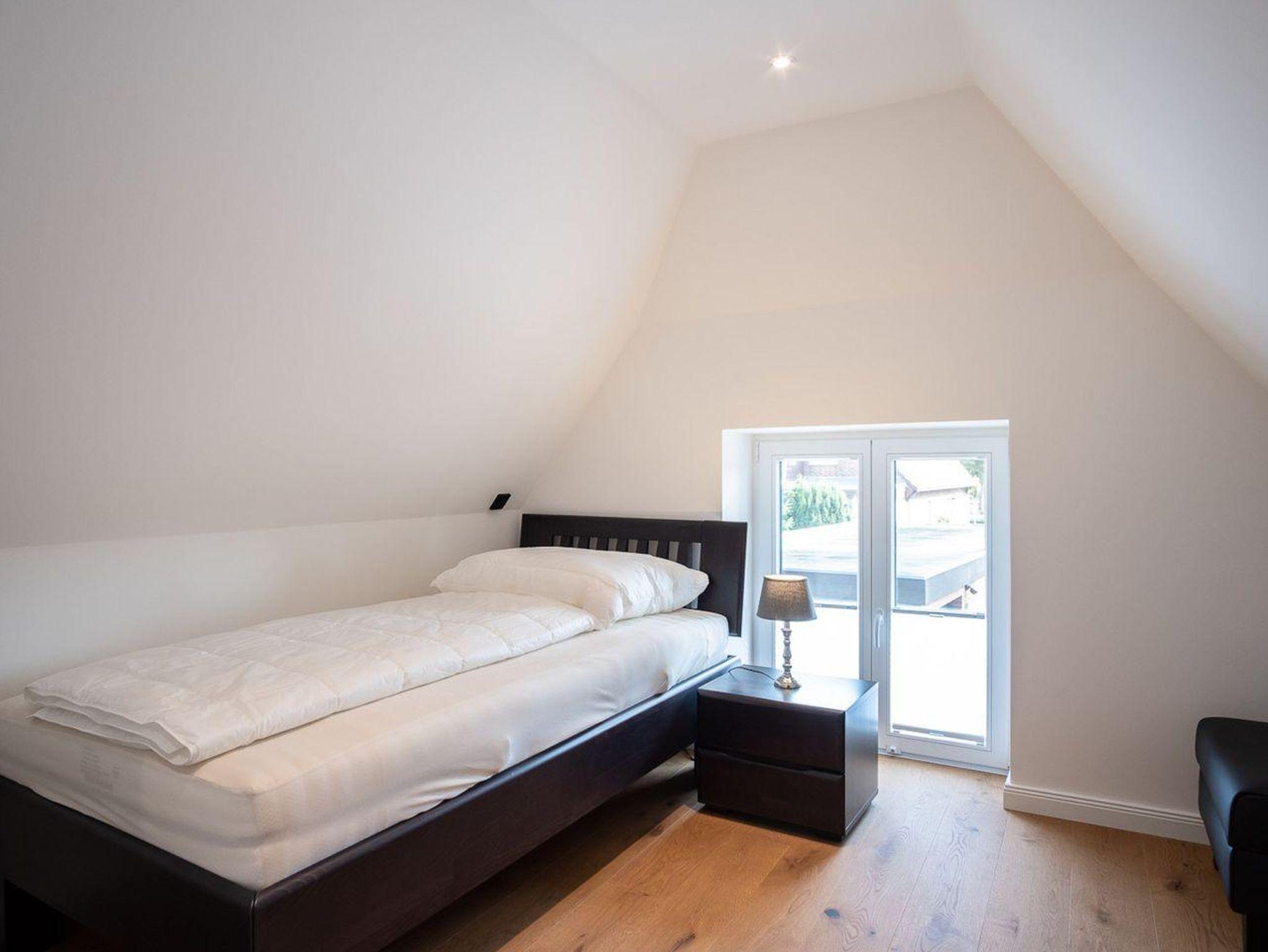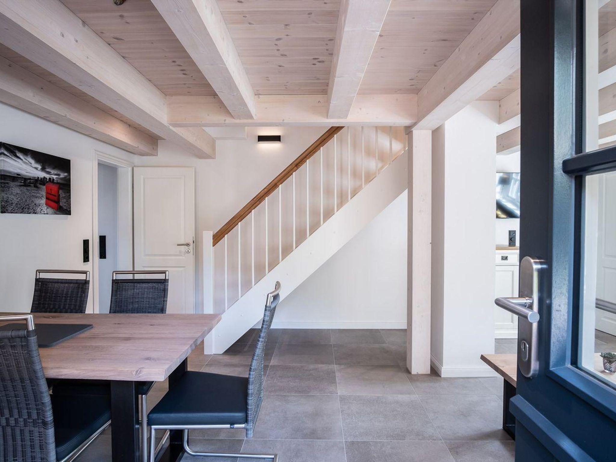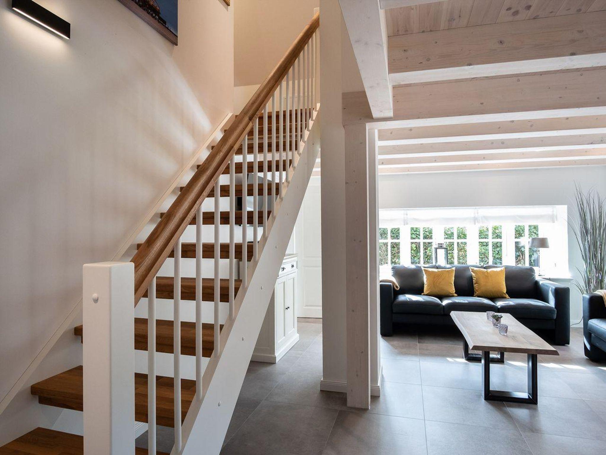 Im Erdgeschoss befindet sich der Wohnraum mit einem gemütlichen Essbereich und Zugang zur überdachten Terrasse, mit wunderschönem Ausblick in den Garten. Die angrenzende Wohnküche ist mit allen wichtigen Geräten voll ausgestattet und lädt zum gemeinsamen Kochen ein. Im Erdgeschoss ist ebenso ein Doppelschlafzimmer, sowie ein Duschbad mit WC und ein Hauswirtschaftsraum. Alle Räume sind mit Zugang nach draußen und bietet in den geschützten, außenliegenden Saunabereich Privatsphäre. Im Obergeschoss befindet sich ein Doppelschlafzimmer mit TV und ein Schlafzimmer mit Einzelbett. Auswärtsschlagende Fenster sorgen für besondere Atmosphäre. Außerdem befindet sich im Obergeschoss ein Duschbad.
