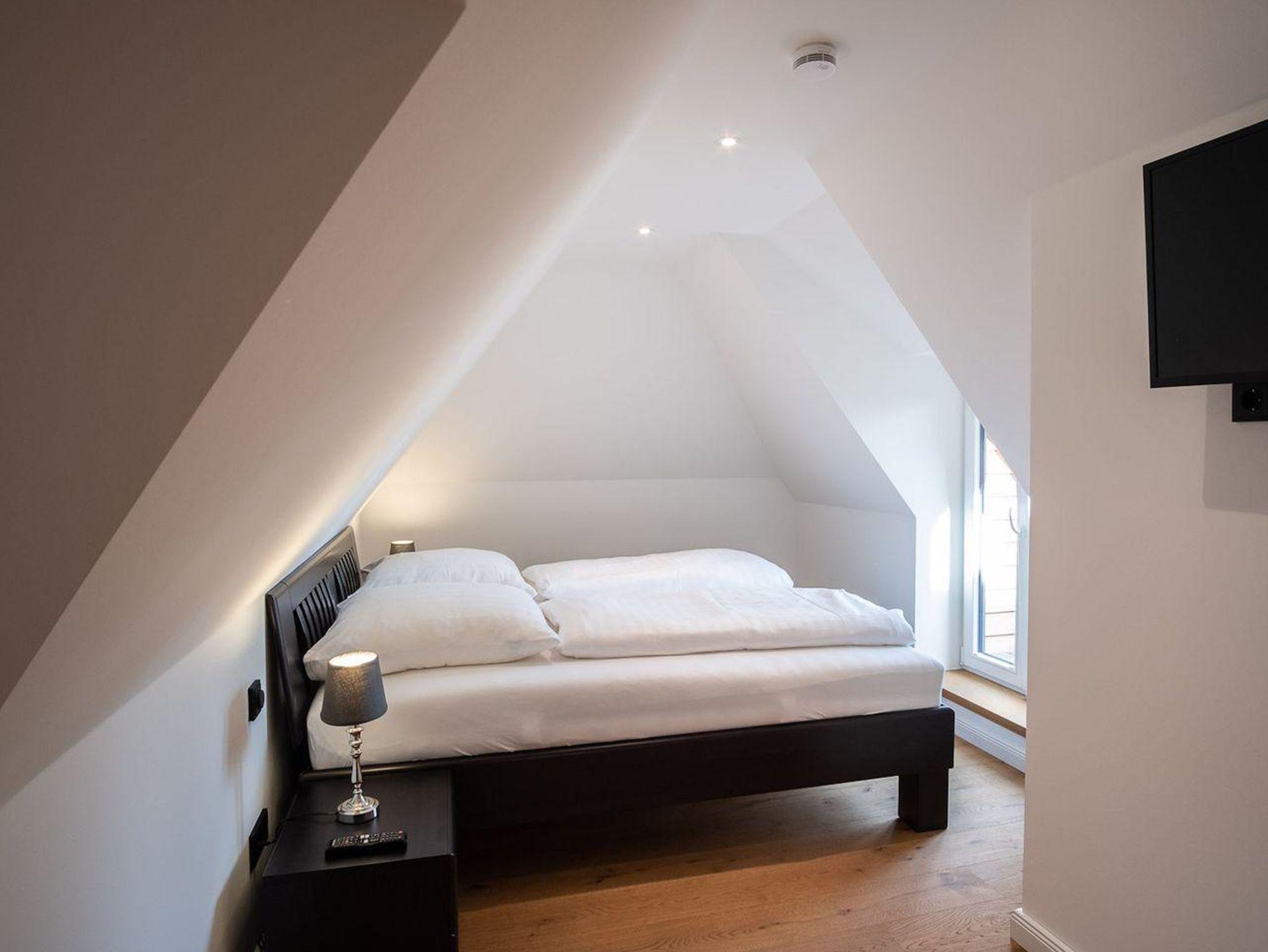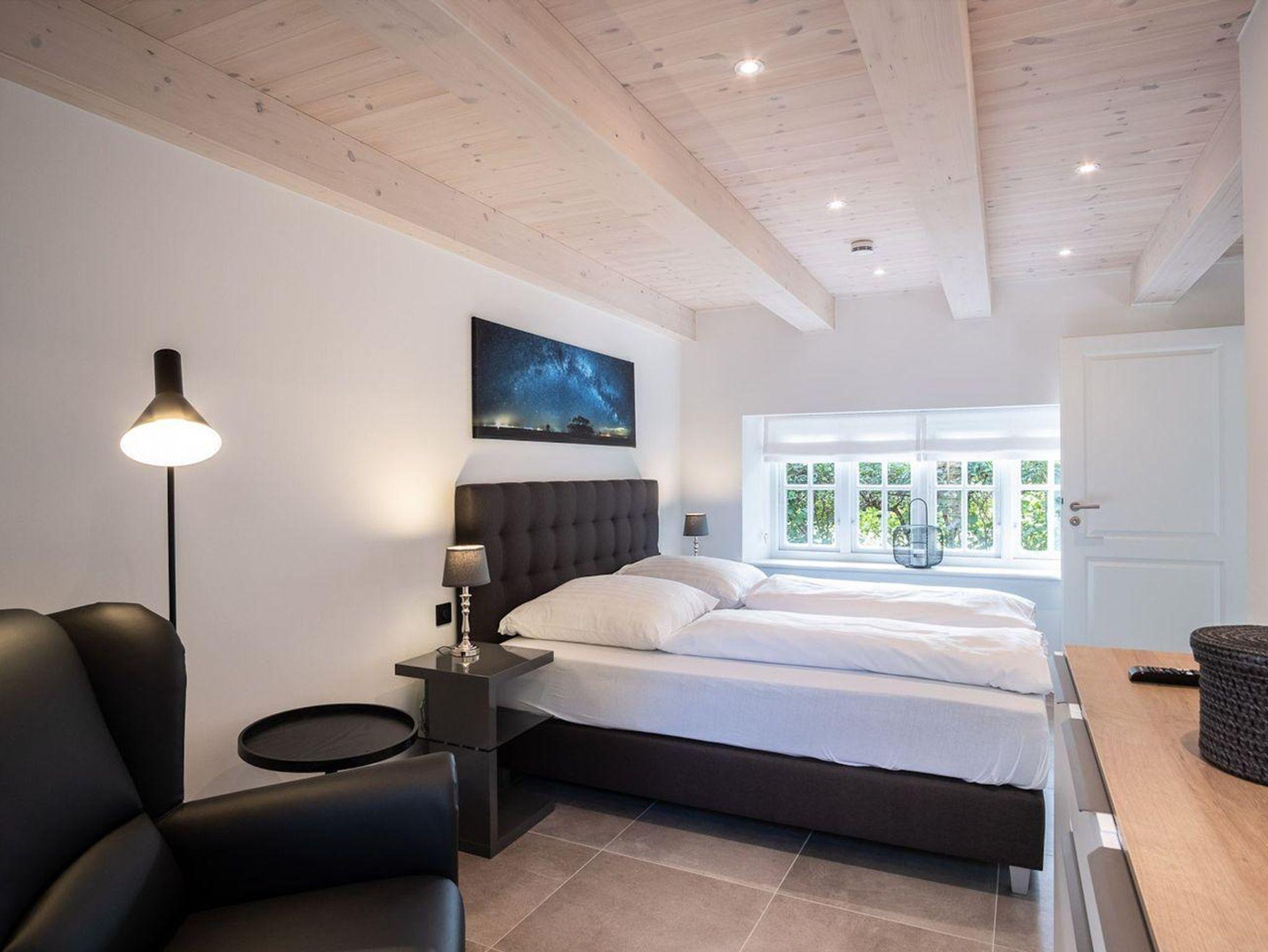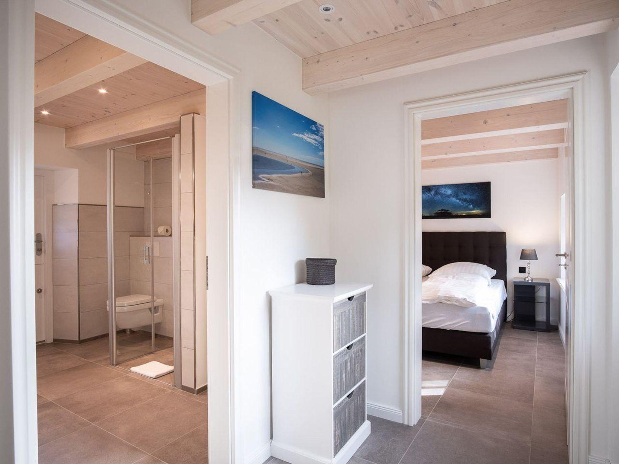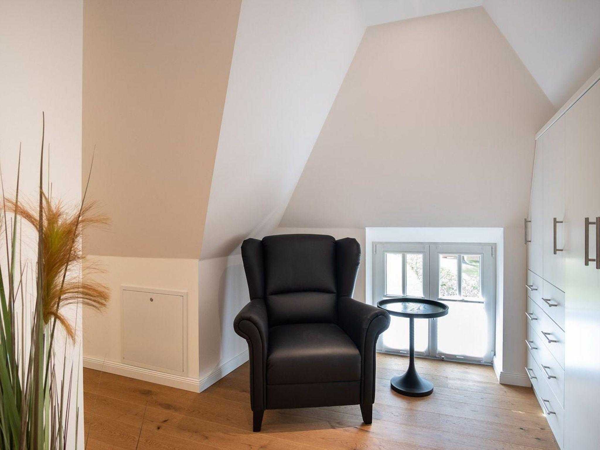 Im Erdgeschoss befindet sich der Wohnraum mit einem gemütlichen Essbereich und Zugang zur überdachten Terrasse, mit wunderschönem Ausblick in den Garten. Die angrenzende Wohnküche ist mit allen wichtigen Geräten voll ausgestattet und lädt zum gemeinsamen Kochen ein. Im Erdgeschoss ist ebenso ein Doppelschlafzimmer, sowie ein Duschbad mit WC und ein Hauswirtschaftsraum. Alle Räume sind mit Zugang nach draußen und bietet in den geschützten, außenliegenden Saunabereich Privatsphäre. Im Obergeschoss befindet sich ein Doppelschlafzimmer mit TV und ein Schlafzimmer mit Einzelbett. Auswärtsschlagende Fenster sorgen für besondere Atmosphäre. Außerdem befindet sich im Obergeschoss ein Duschbad.