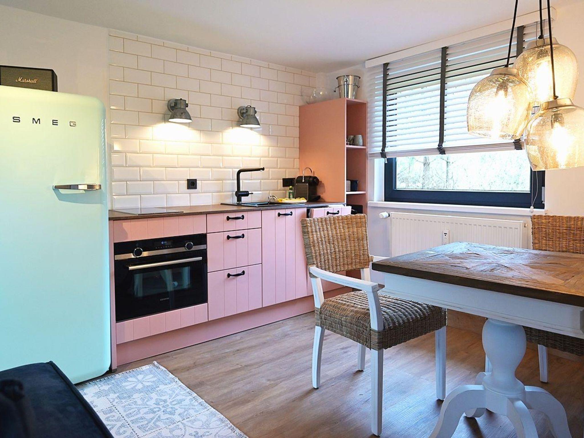 Der stilvoll eingerichtete Wohn-Essbereich, ausgestattet mit hochwertigen Möbeln von Rivièra Maison und COCO-MA sowie einem großen TV, lädt zu entspannten Stunden ein. Die moderne und komplett ausgestattete offene Küche in ansprechenden Farben ermöglicht es Ihnen, auch im Urlaub kulinarische Genüsse zu zaubern.