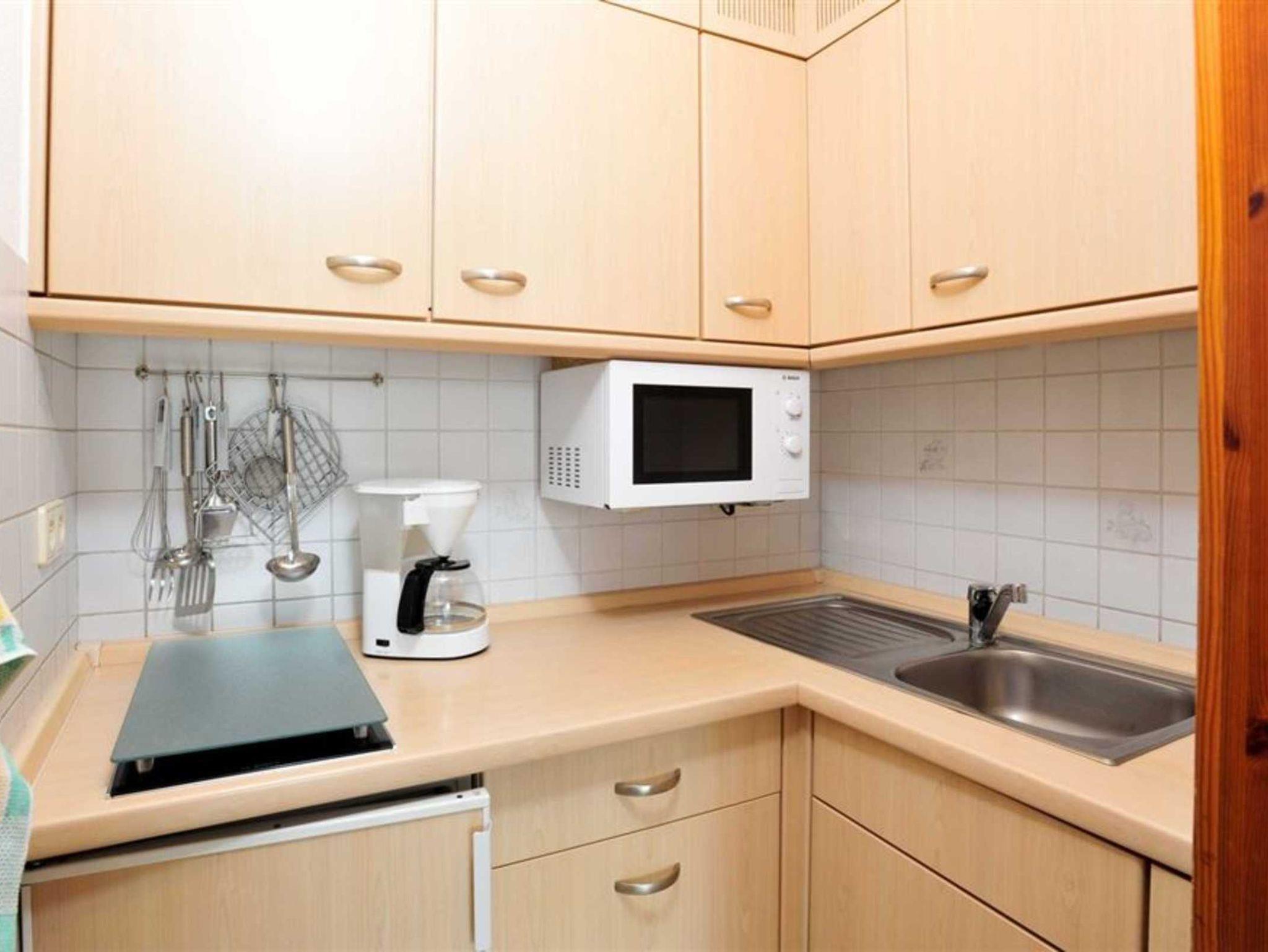 Kleine halboffene Küche mit Herd mit 2 Kochstellen, Mikrowelle, Kühlschrank mit Gefrierfach und einigem Komfort.