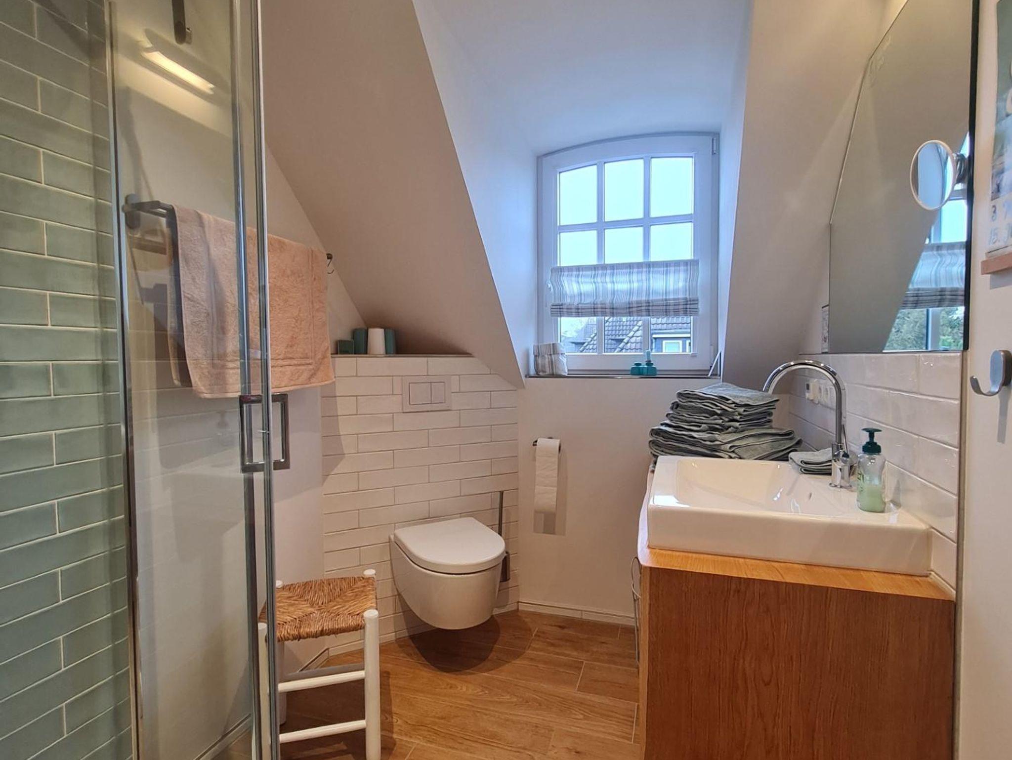 Ein modernes Duschbad mit Regendusche erwartet Sie im Obergeschoss.
