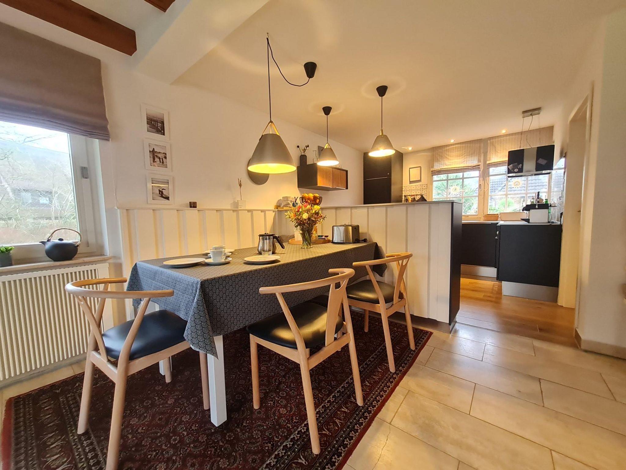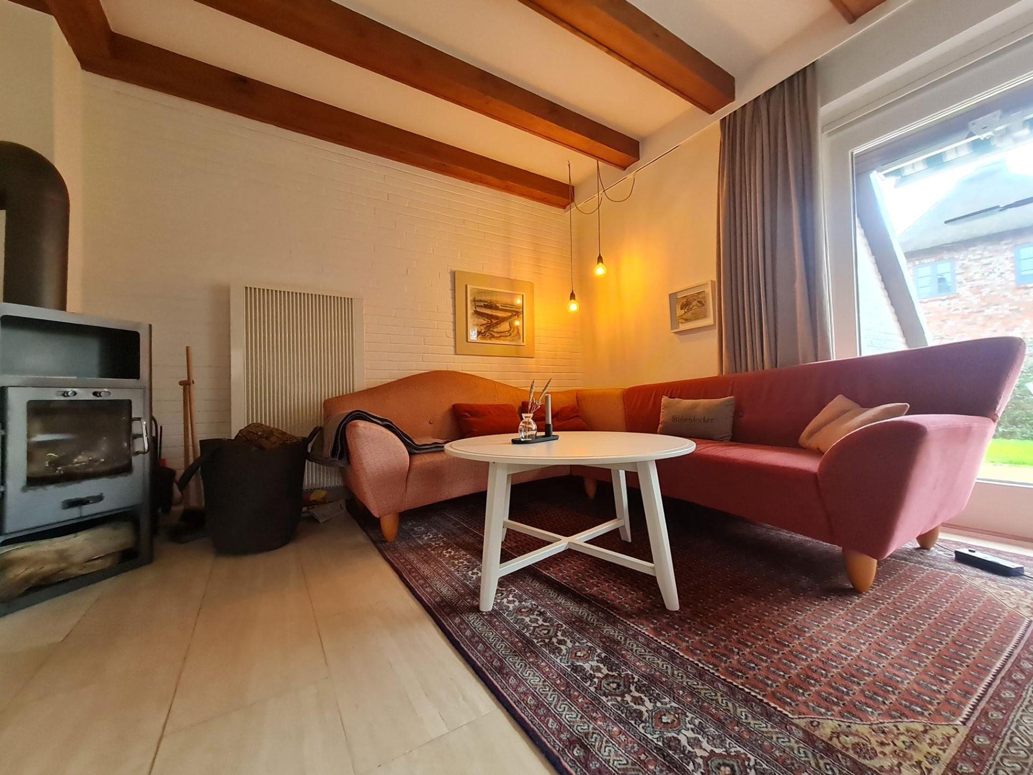 Im Erdgeschoss befinden sich der Wohnbereich mit dänischem Ofen, Essecke und offener Küche.