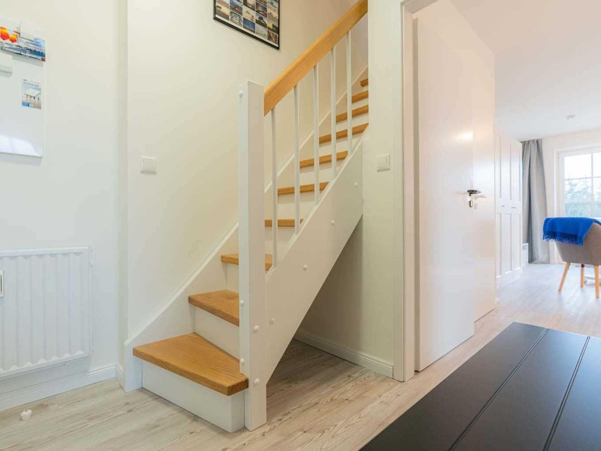 Flur mit Sitzbank, Garderobe und Schuhregal im Eingangsbereich. Vom Flur führt eine schmale Treppe zum DG.