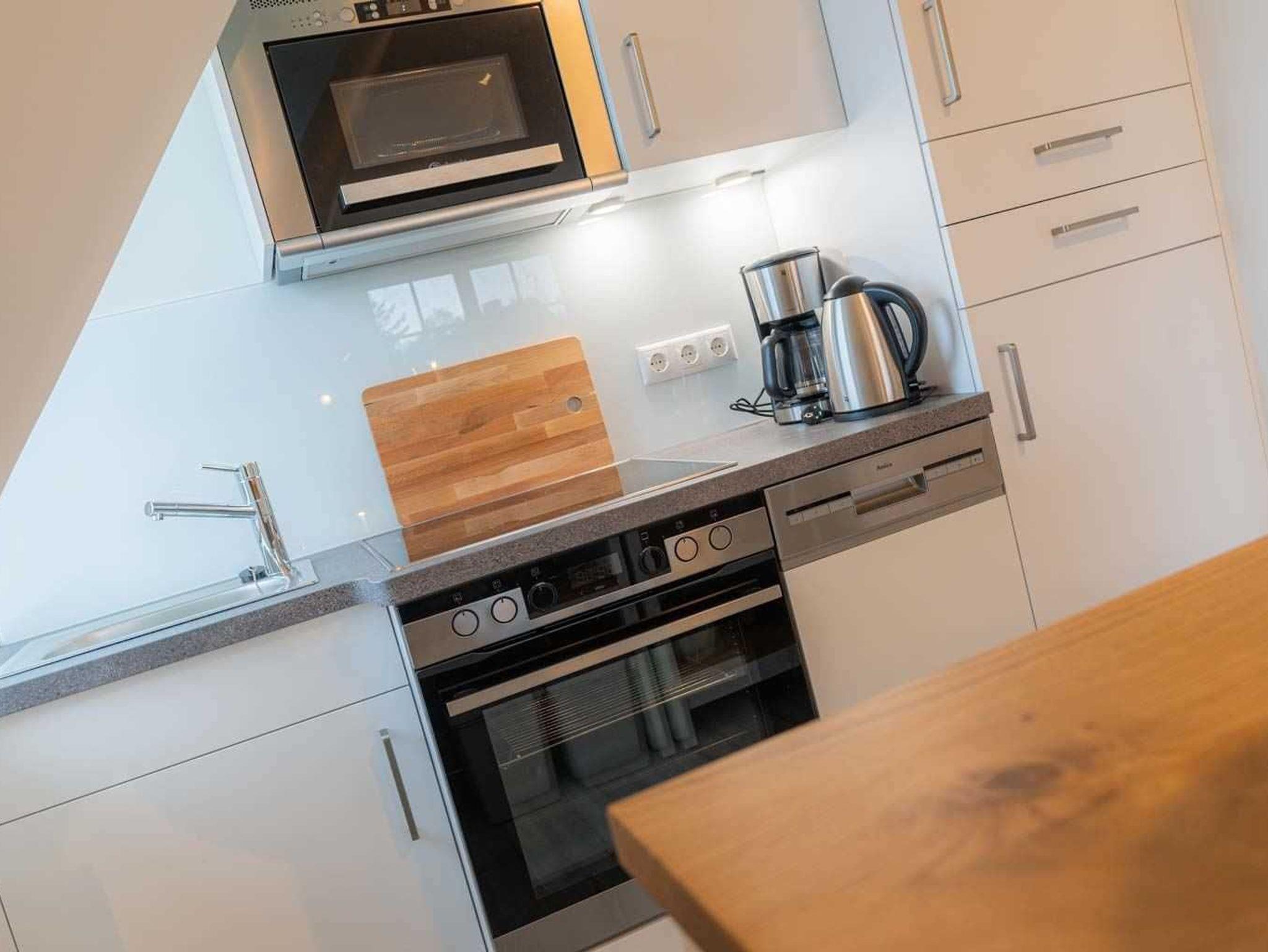 Wohnzimmer mit (ausklappbarem Schlaf-) Sofa (150x190cm), SMART-TV (Sat) und Esstisch mit 4 Stühlen. Direkter Zugang zum sonnigen, möblierten Süd-Balkon. Offene Küche mit Backofen, Mikrowelle, Geschirrspüler und Kühlschrank mit Gefrierfach.