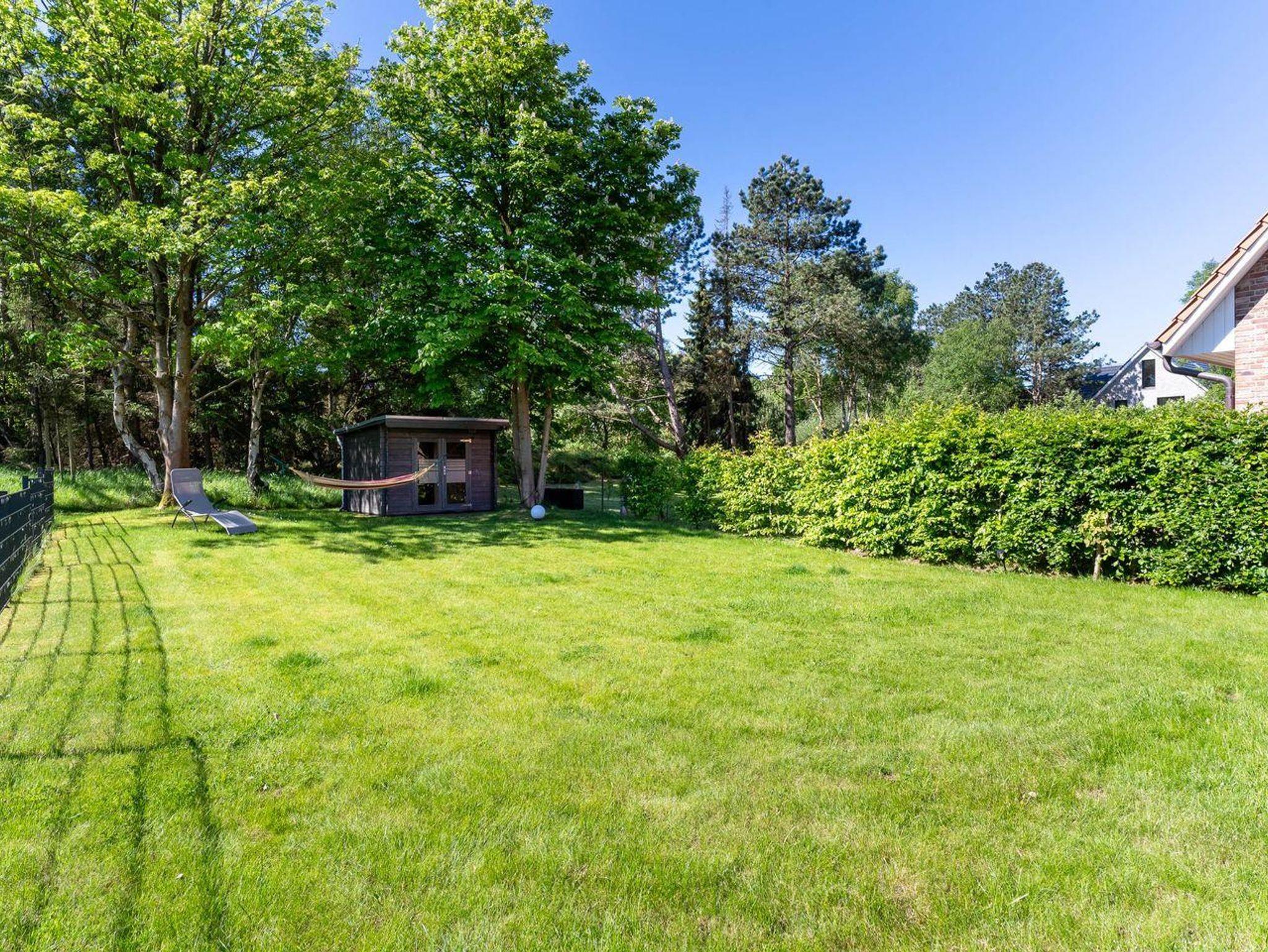 Großer Garten in Südlage, direkte Lage am Deich zum Südstrand, nur durch ein Wäldchen getrennt, die gepflegte Terrasse mit Gartenmöbeln und Strandkorb lädt zum Verweilen ein, Gartenhaus mit Sauna, 1 PKW-Abstellplatz, Fahrradständer.