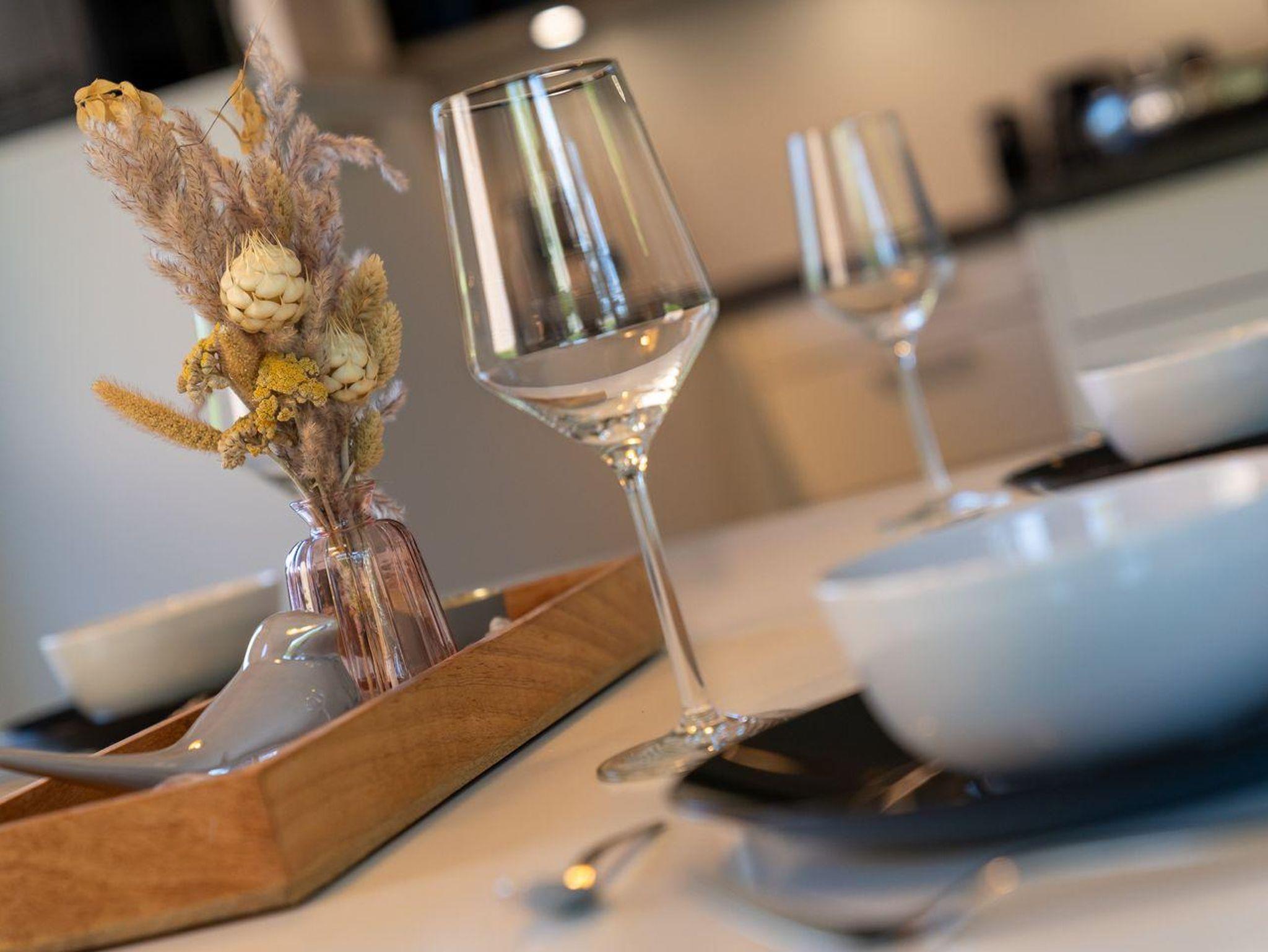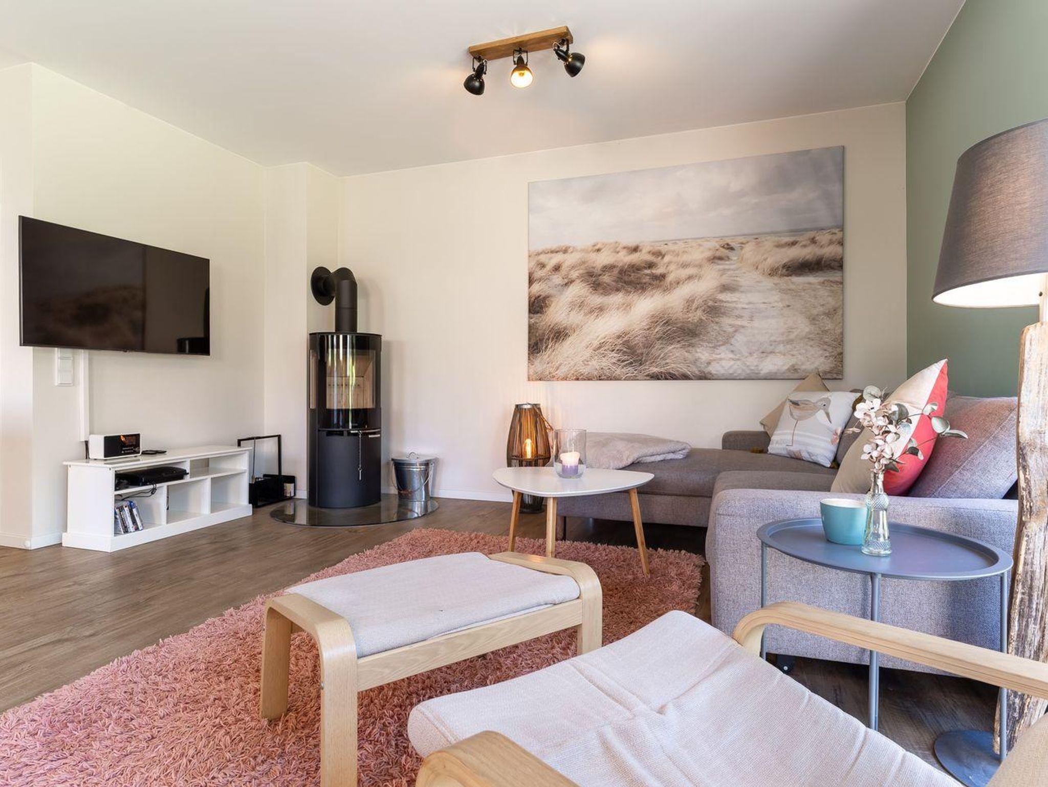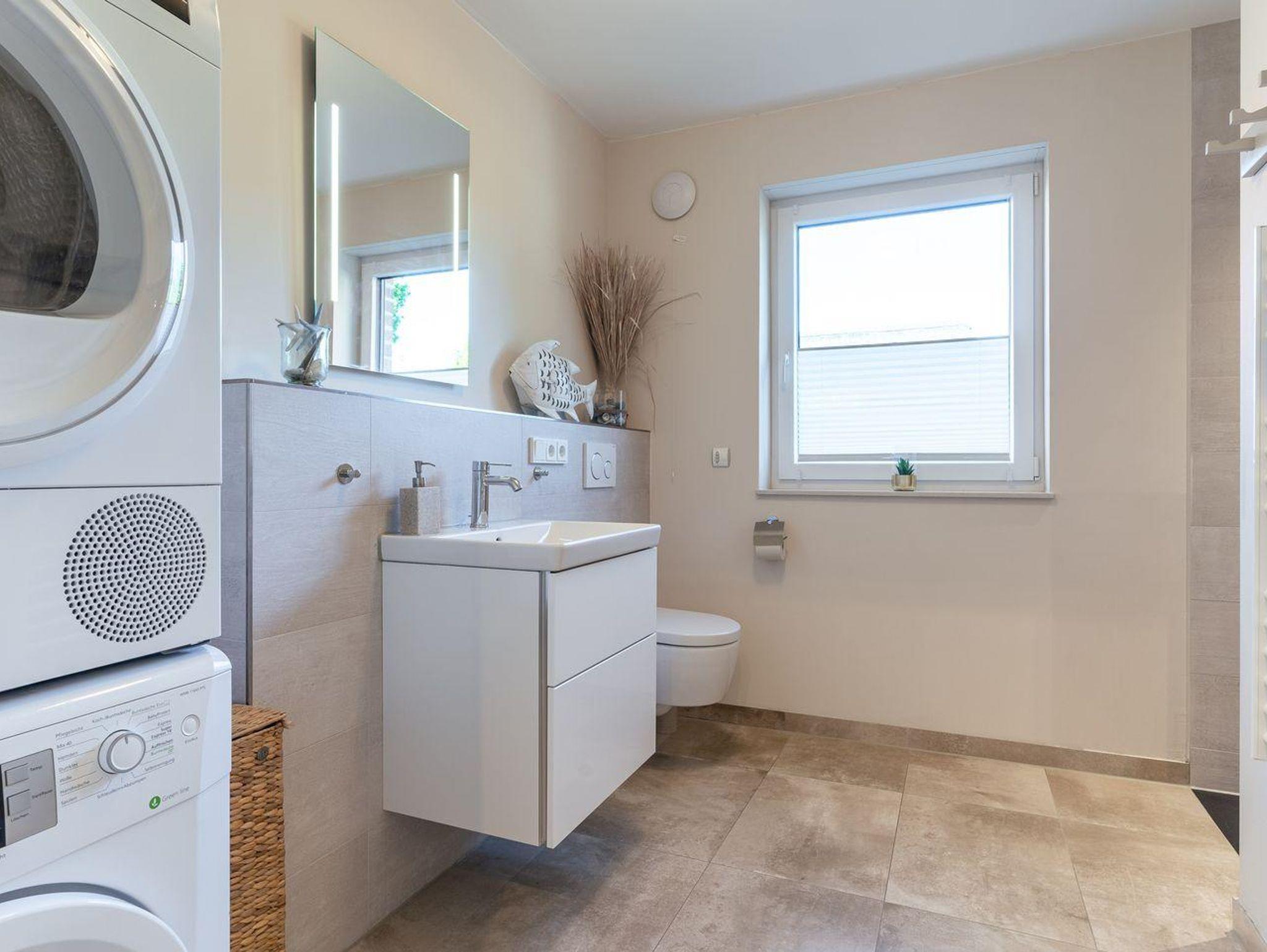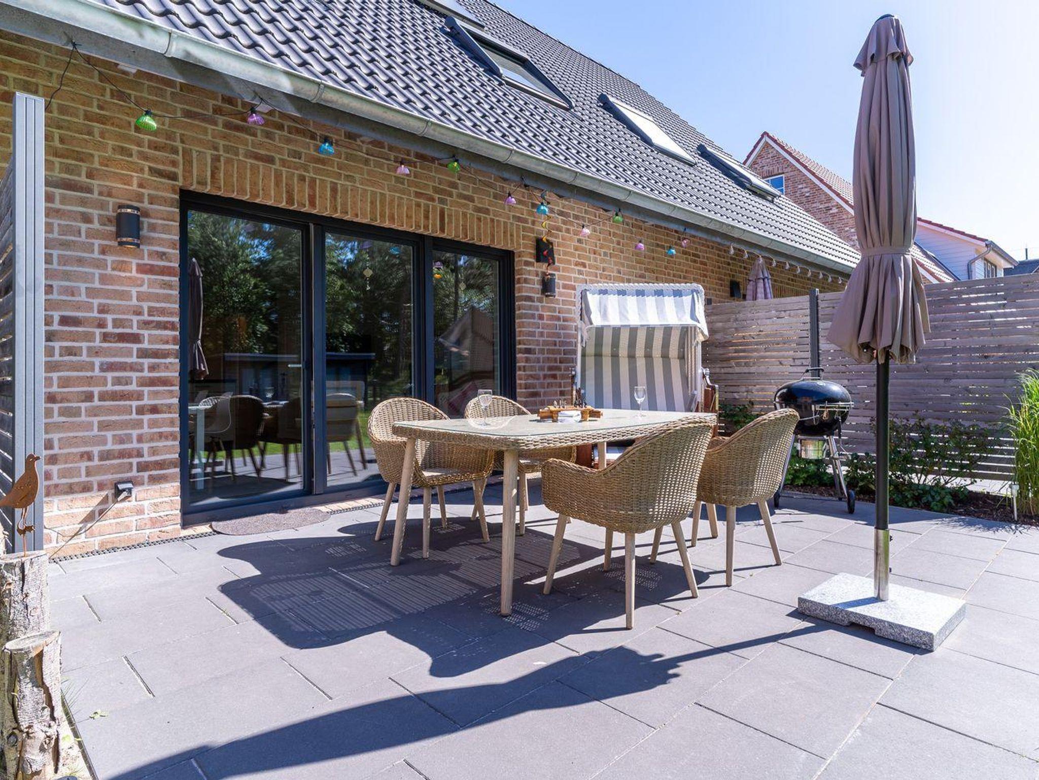 Das Ferienhaus besticht durch hochwertige Möbel und ein harmonisches Ambiente. Im lichtdurchfluteten Wohnzimmer mit TV können Sie herrlich entspannen und die offene Küche mit hochwertigen Elektrogeräten lädt zum gemeinsamen Kochen ein. Hier befindet sich außerdem ein gemütliches Esszimmer. Ob Morgensonne oder Abendsonne - vom Küchenbereich, sowie vom Wohnzimmer gelangen Sie jeweils auf eine große Terrasse mit hochwertigen Gartenmöbeln. Im Erdgeschoss befindet sich ebenso ein Doppelschlafzimmer (180 x 200 cm) und ein angrenzendes, modernes Duschbad. Vom großzügigen Flur mit Hauswirtschaftsraum und Gäste WC gelangen Sie über eine Holztreppe ins Obergeschoss. Hier befinden sich drei weitere gemütlich eingerichtete Schlafzimmer mit komfortablen Boxspringdoppelbetten Ein geräumiges Badezimmer mit Dusche und Badewanne sorgt für zusätzlichen Komfort.