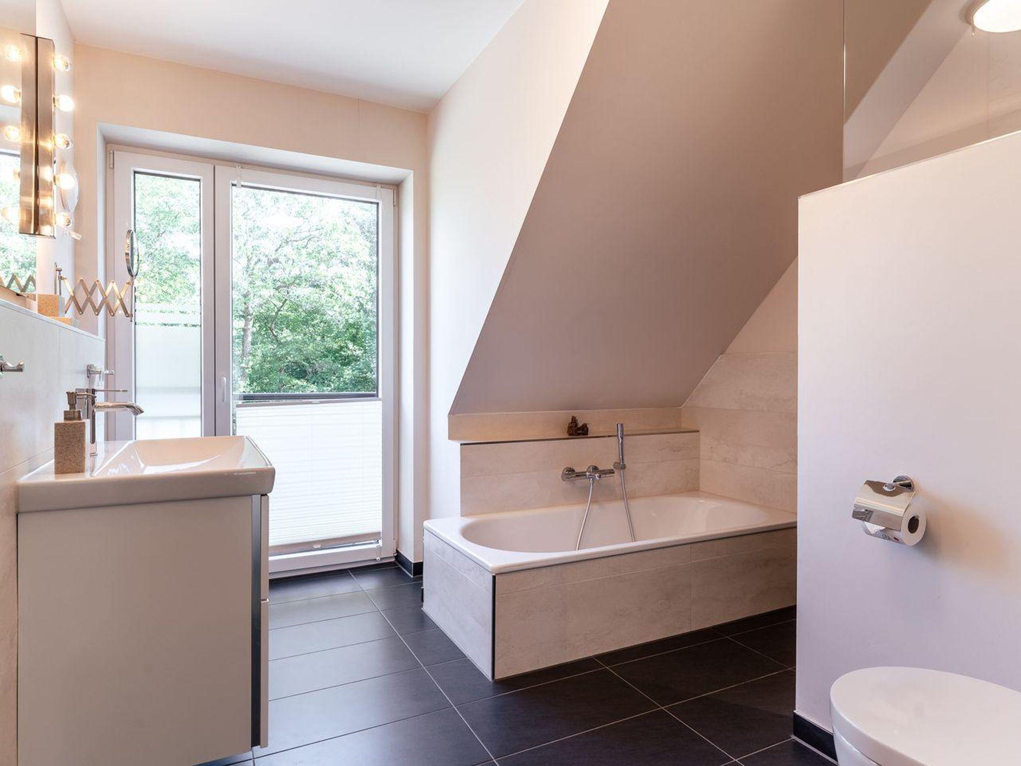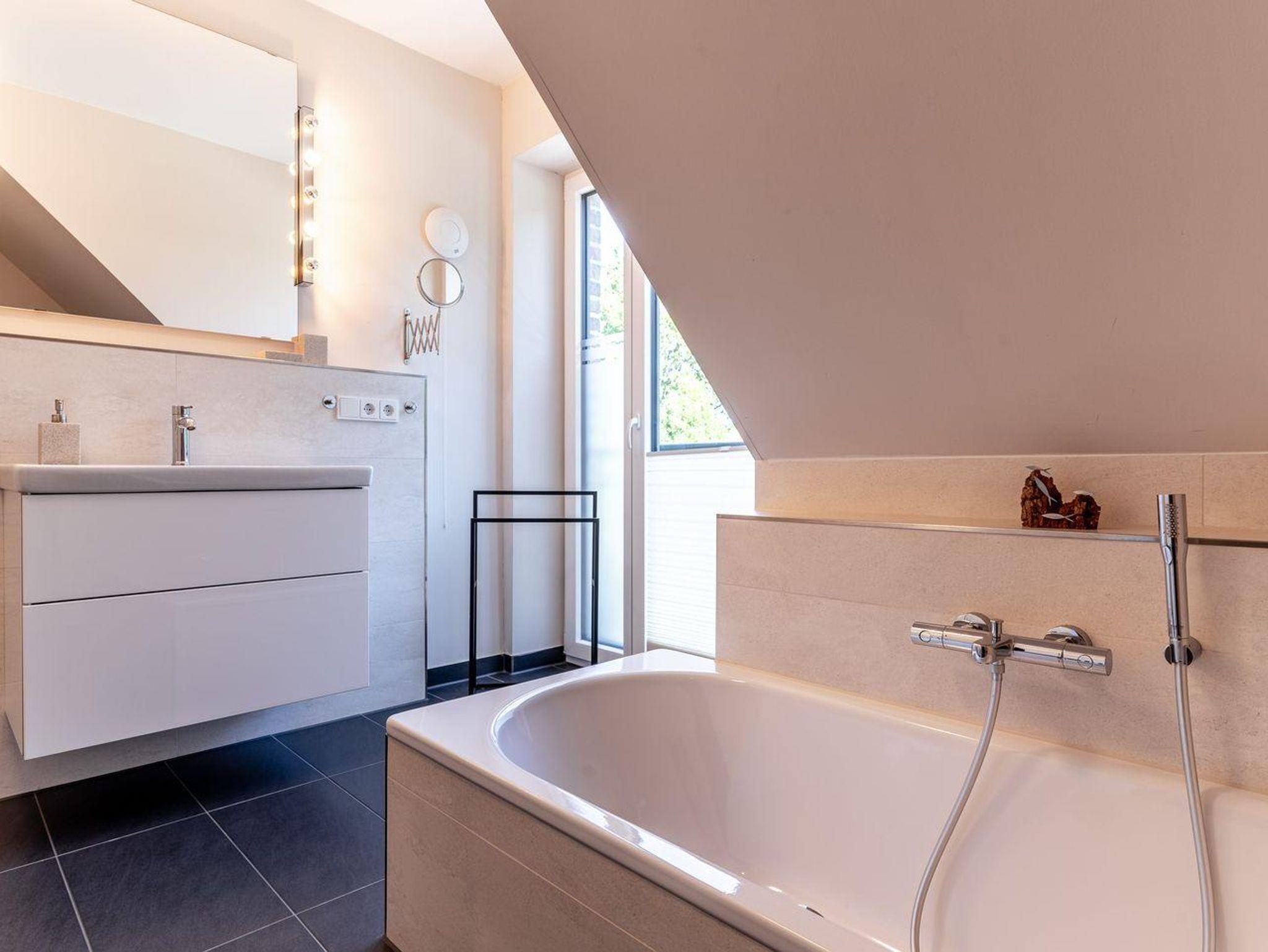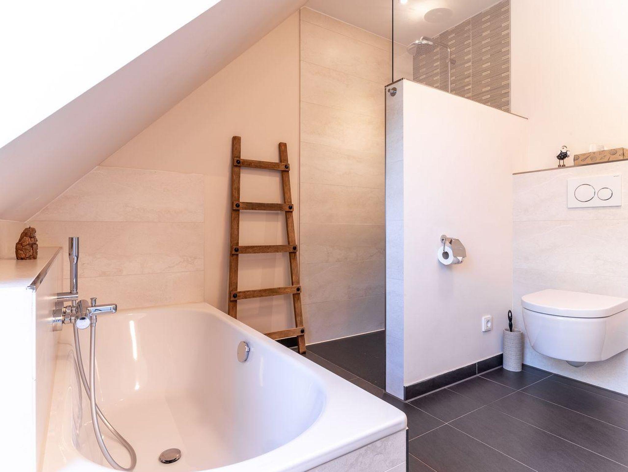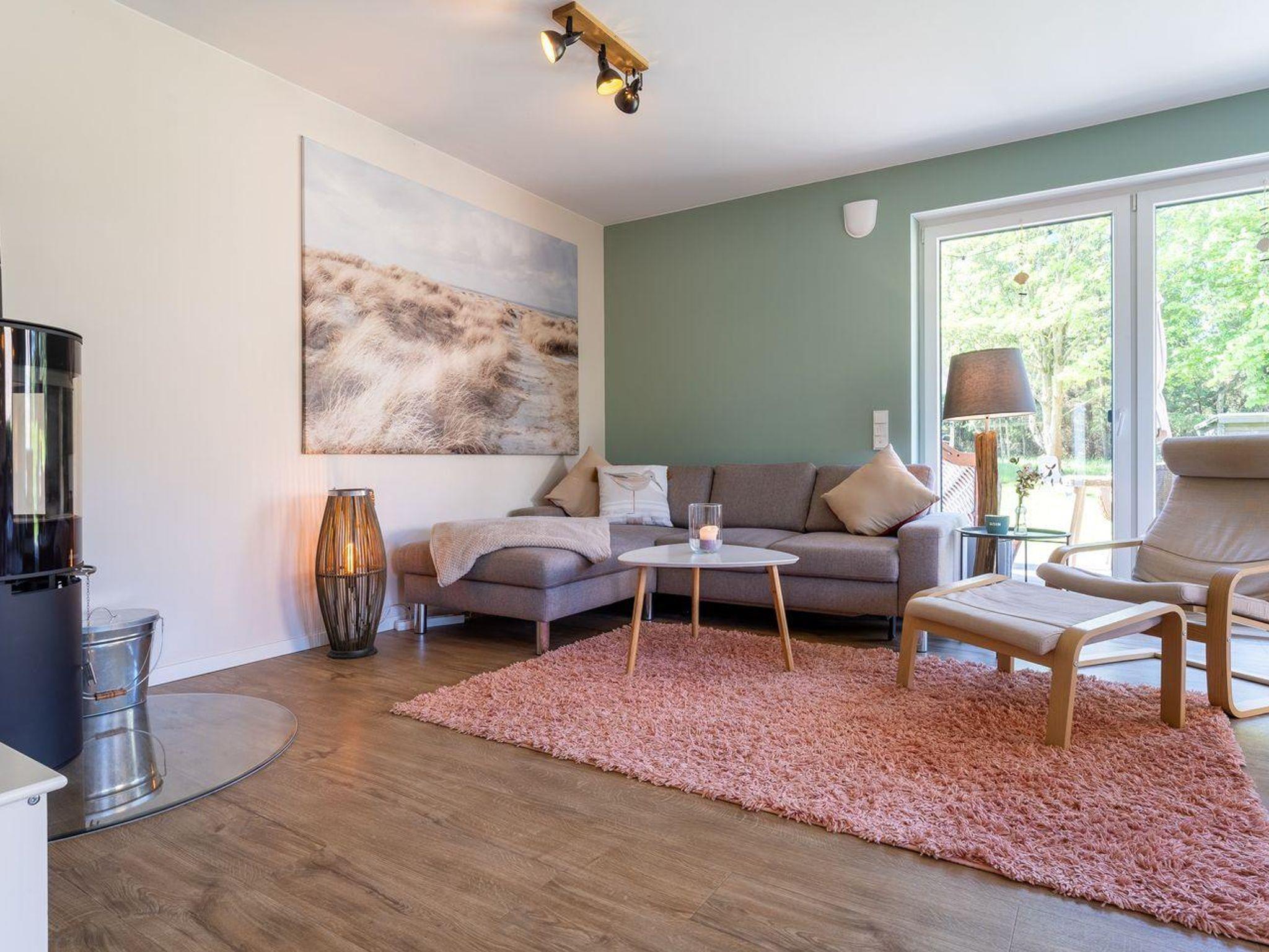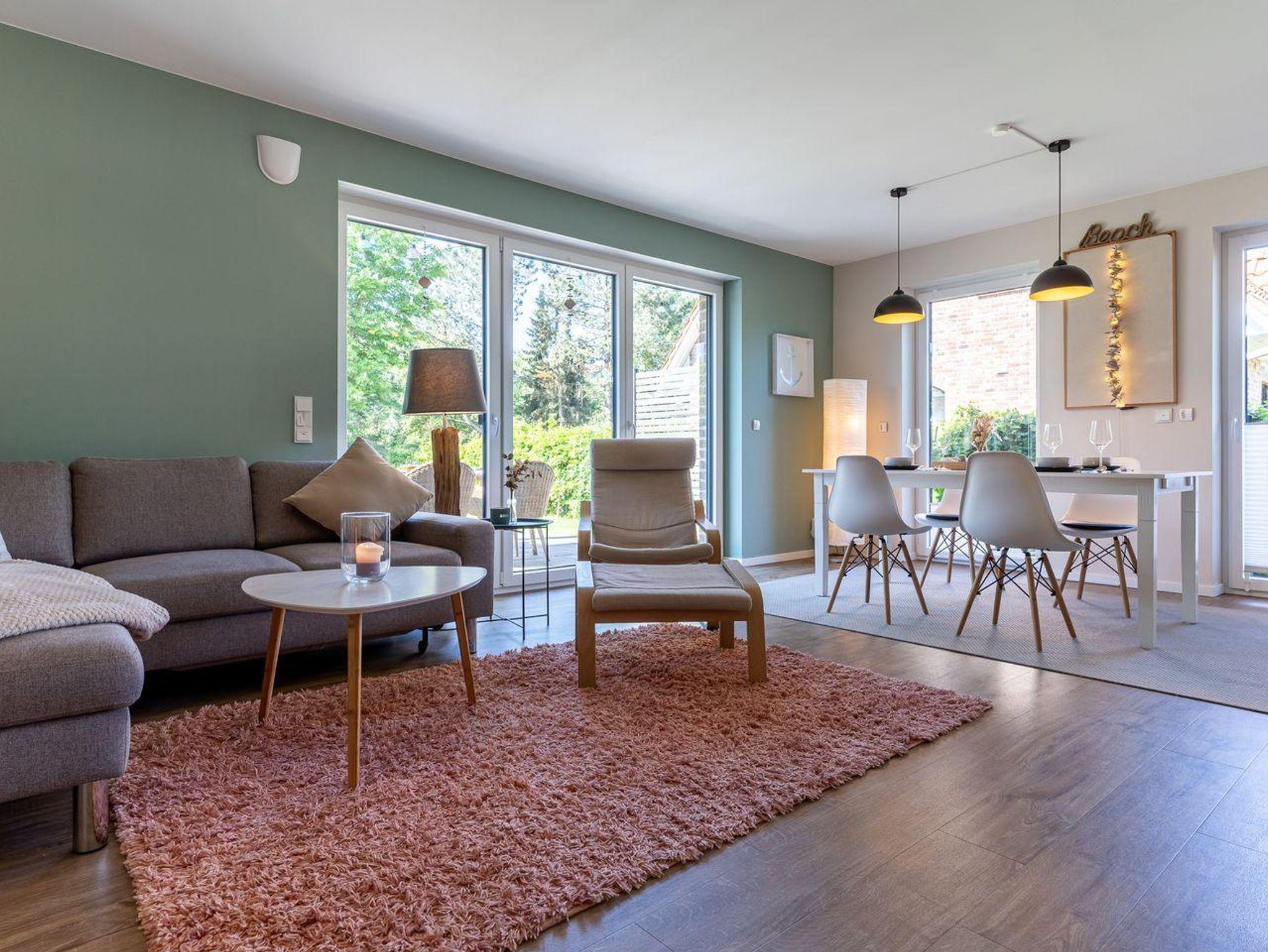 Das Ferienhaus besticht durch hochwertige Möbel und ein harmonisches Ambiente. Im lichtdurchfluteten Wohnzimmer mit TV können Sie herrlich entspannen und die offene Küche mit hochwertigen Elektrogeräten lädt zum gemeinsamen Kochen ein. Hier befindet sich außerdem ein gemütliches Esszimmer. Ob Morgensonne oder Abendsonne - vom Küchenbereich, sowie vom Wohnzimmer gelangen Sie jeweils auf eine große Terrasse mit hochwertigen Gartenmöbeln. Im Erdgeschoss befindet sich ebenso ein Doppelschlafzimmer (180 x 200 cm) und ein angrenzendes, modernes Duschbad. Vom großzügigen Flur mit Hauswirtschaftsraum und Gäste WC gelangen Sie über eine Holztreppe ins Obergeschoss. Hier befinden sich drei weitere gemütlich eingerichtete Schlafzimmer mit komfortablen Boxspringdoppelbetten Ein geräumiges Badezimmer mit Dusche und Badewanne sorgt für zusätzlichen Komfort.