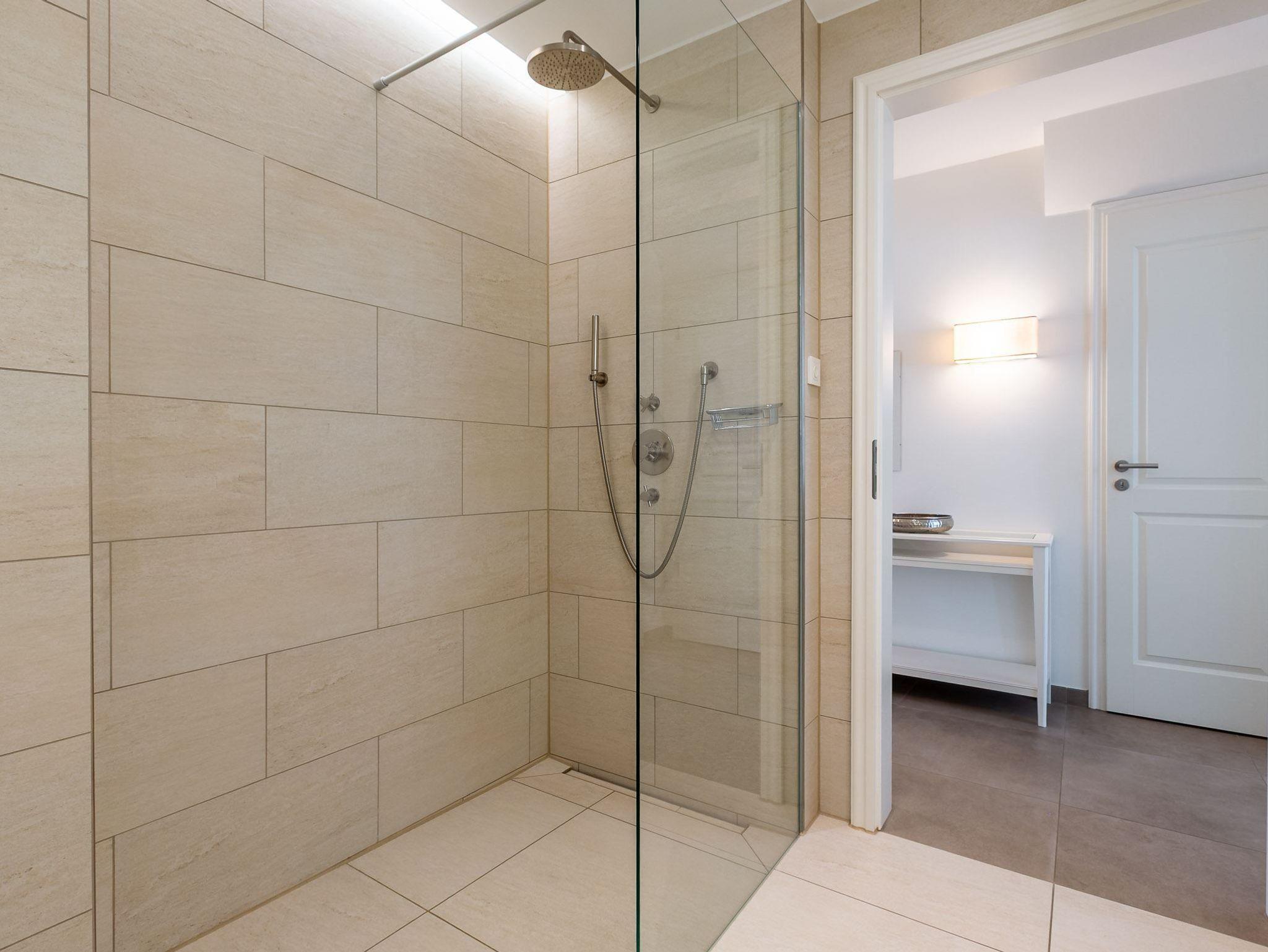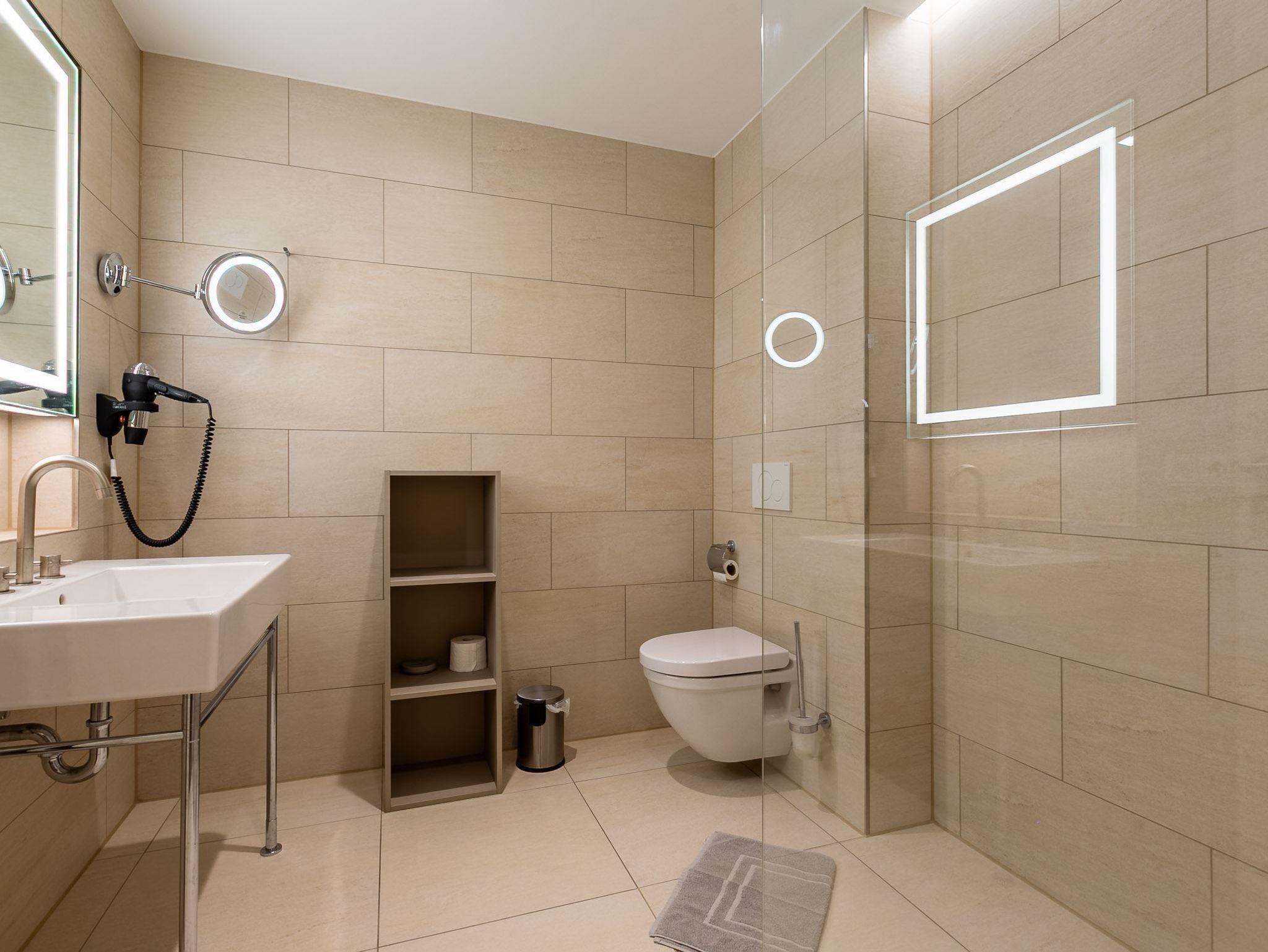 1. Badezimmer (Duschbad) mit Regendusche, WC, Handtuchwärmer und Föhn.