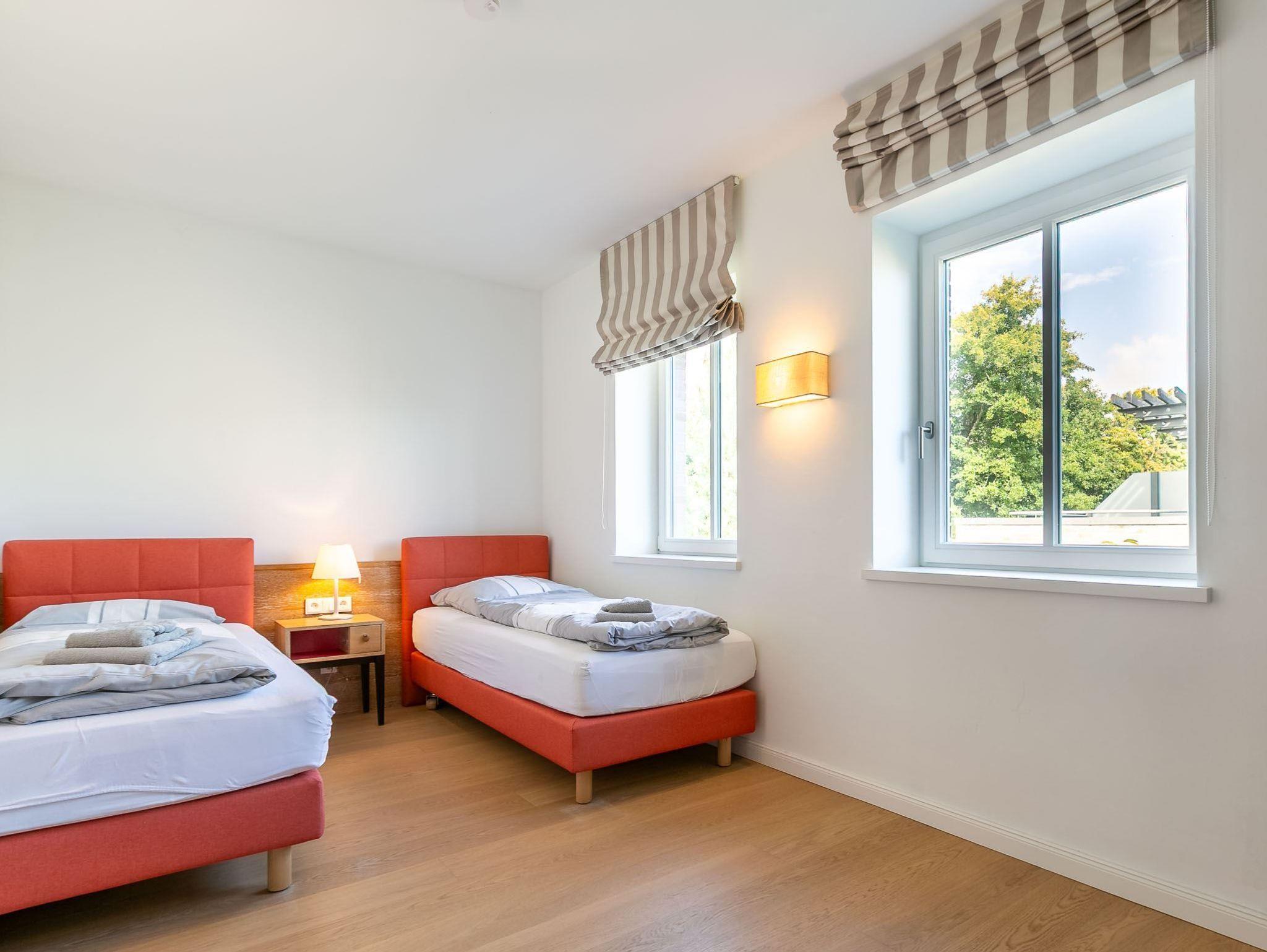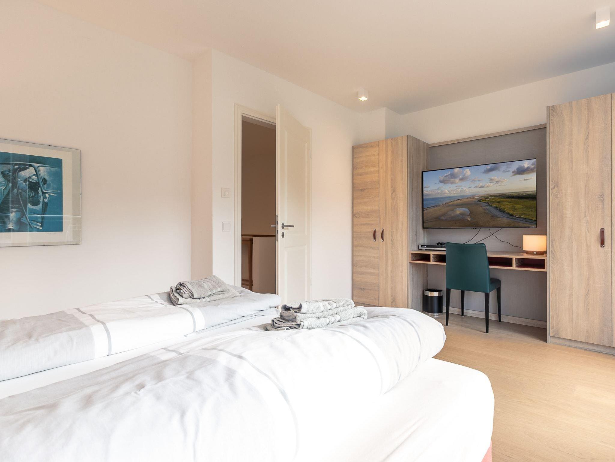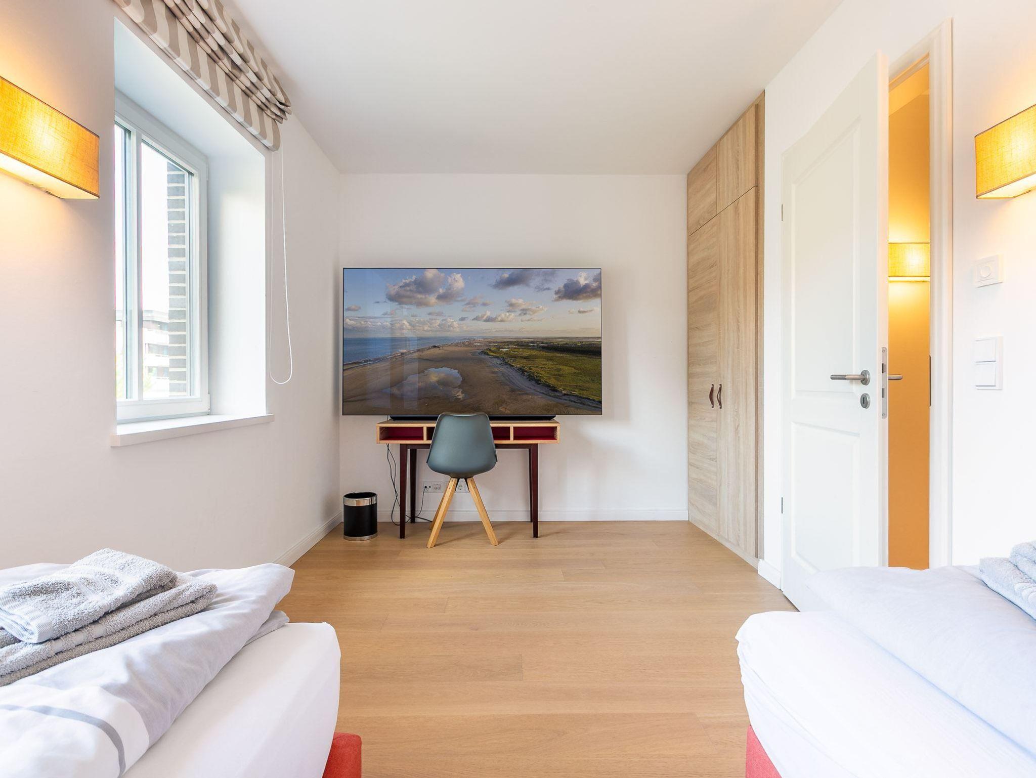 2. Schlafzimmer mit zwei Einzelbetten (je 90x195 cm), Schreibtisch, Kleiderschrank und großem SMART-TV.